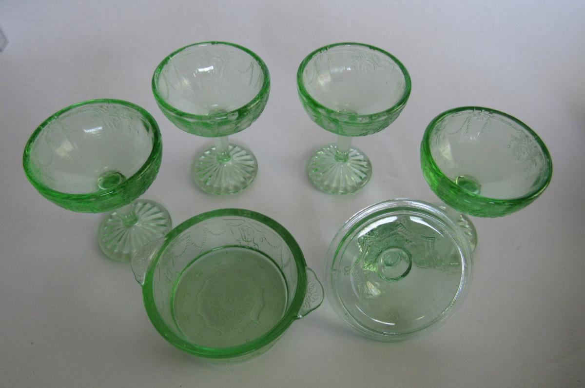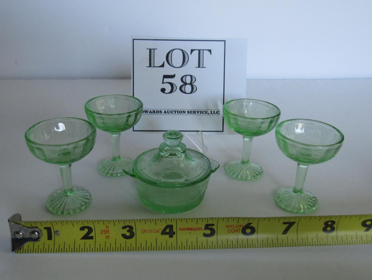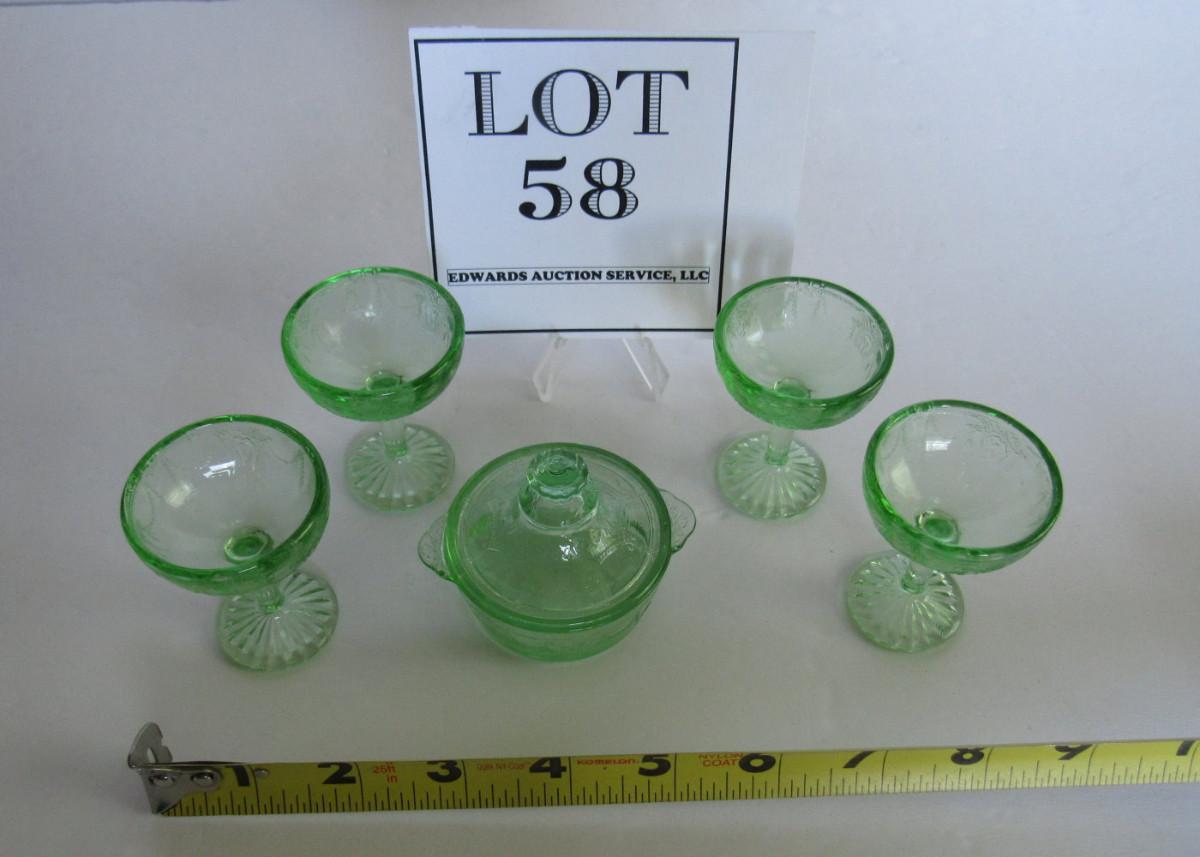 Child's Size Mosser Glass Jennifer Covered Dish and 4 Tall Sherberts, Green