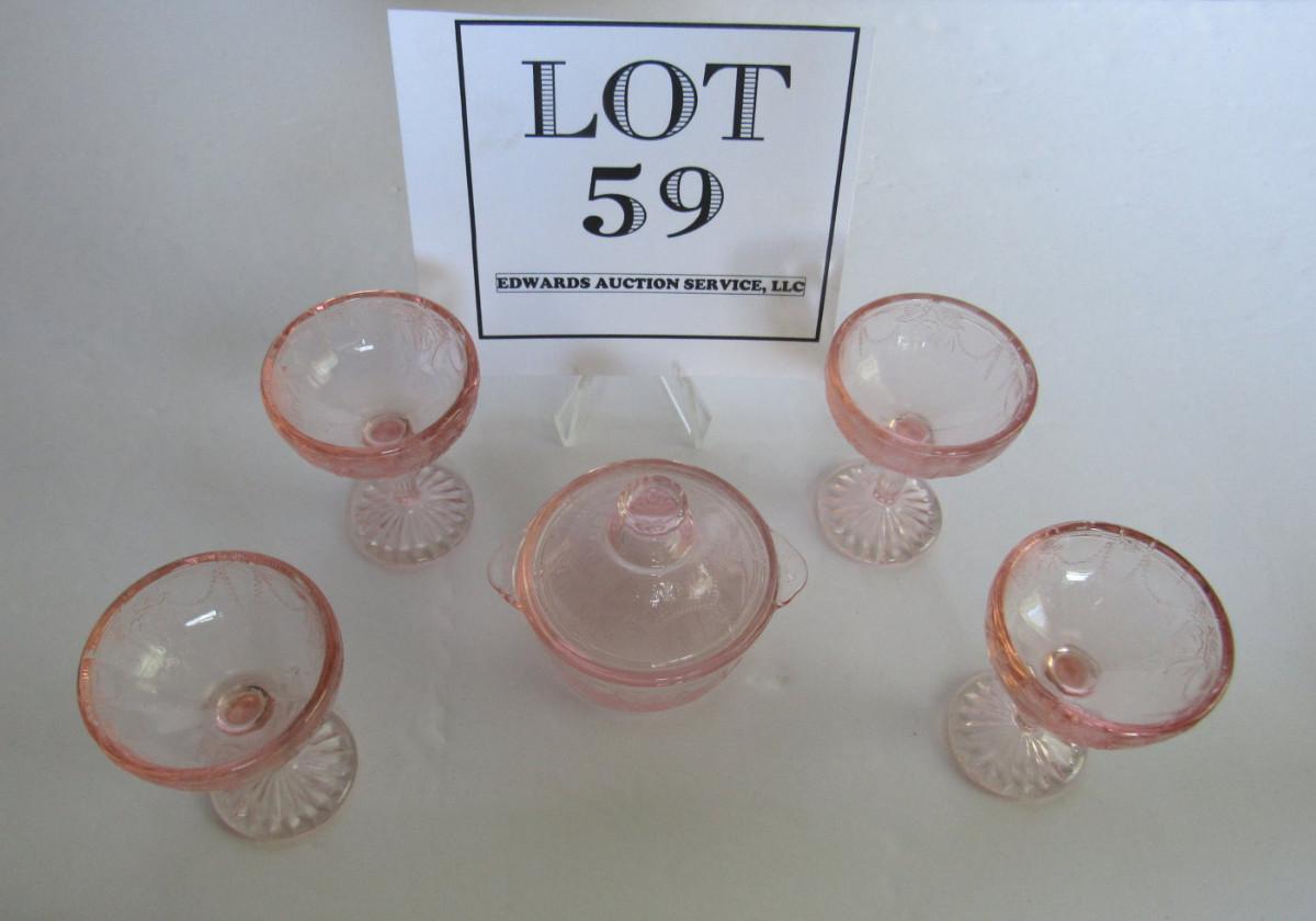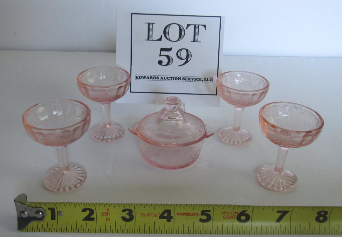 Child's Size Mosser Glass Jennifer Covered Dish and 4 Tall Sherberts, Pink