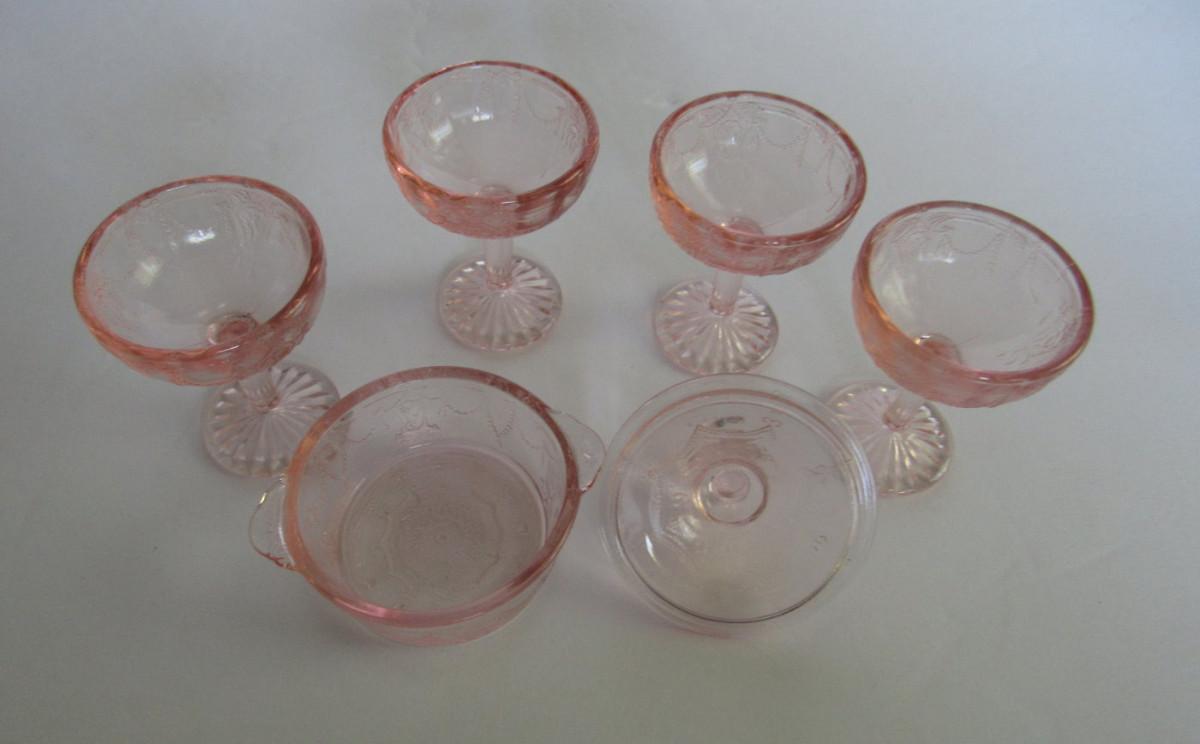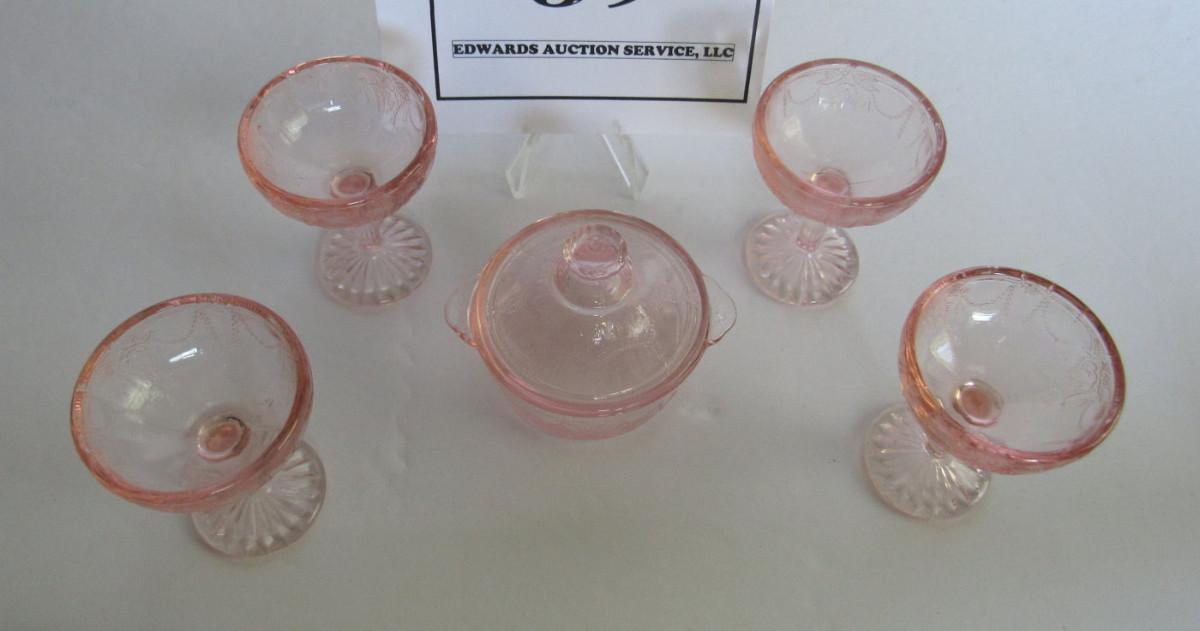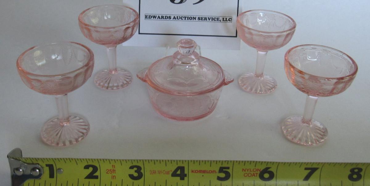 Child's Size Mosser Glass Jennifer Covered Dish and 4 Tall Sherberts, Pink