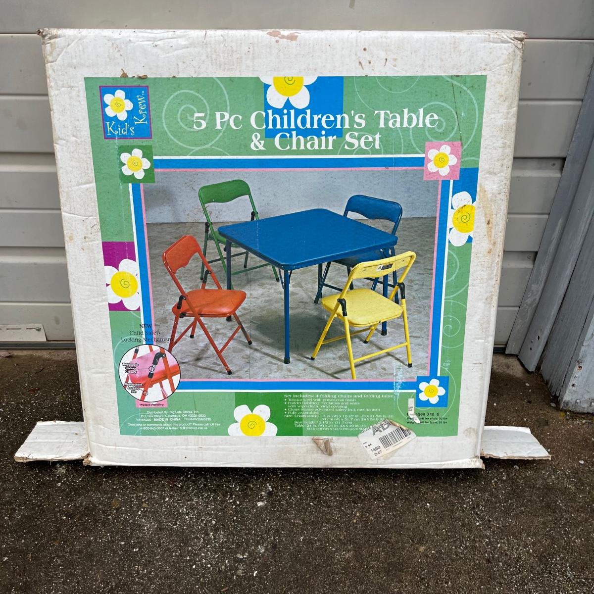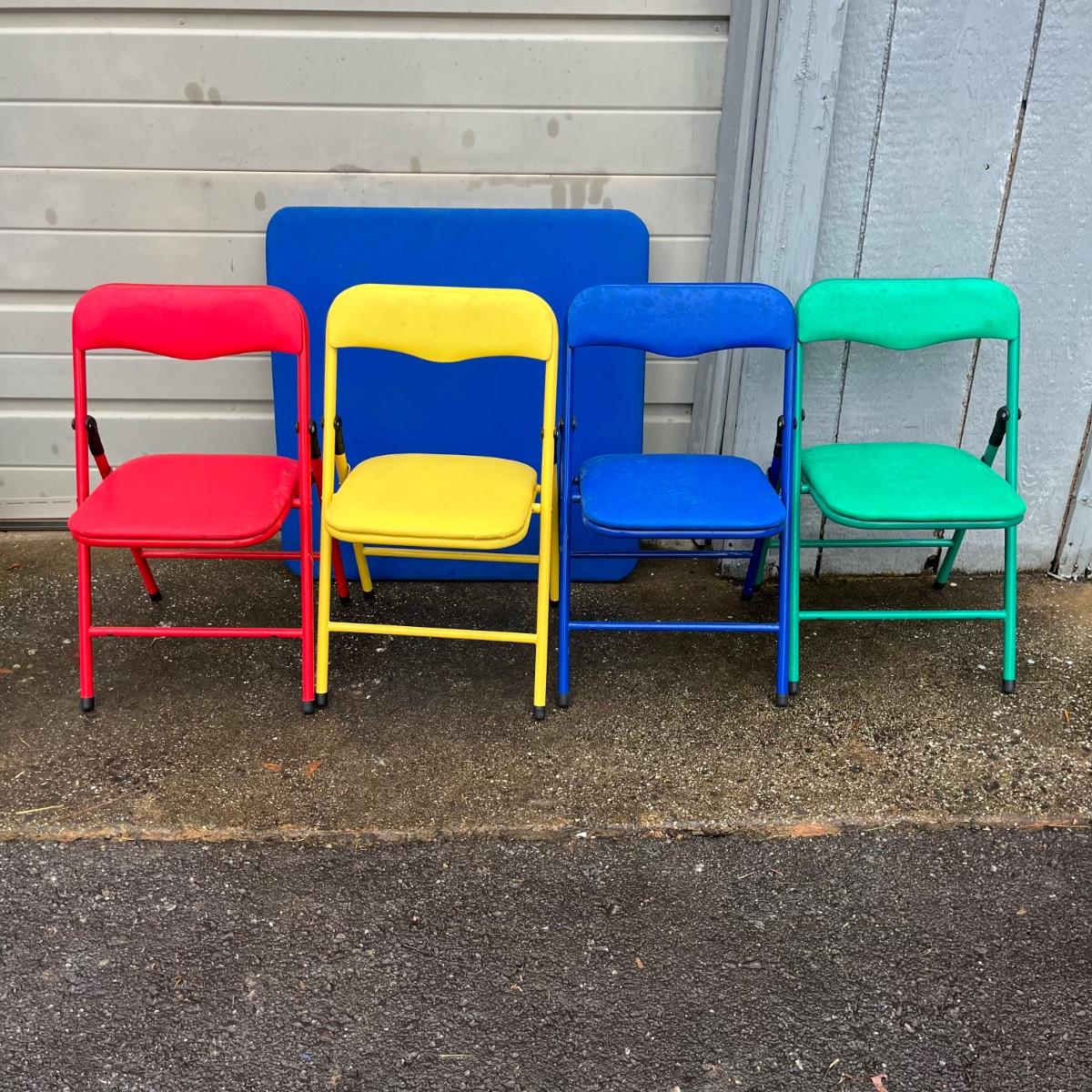 Lot includes a child’s folding table and four folding chairs. Chairs and table have mildew on padding that you will want to clean, see pictures.