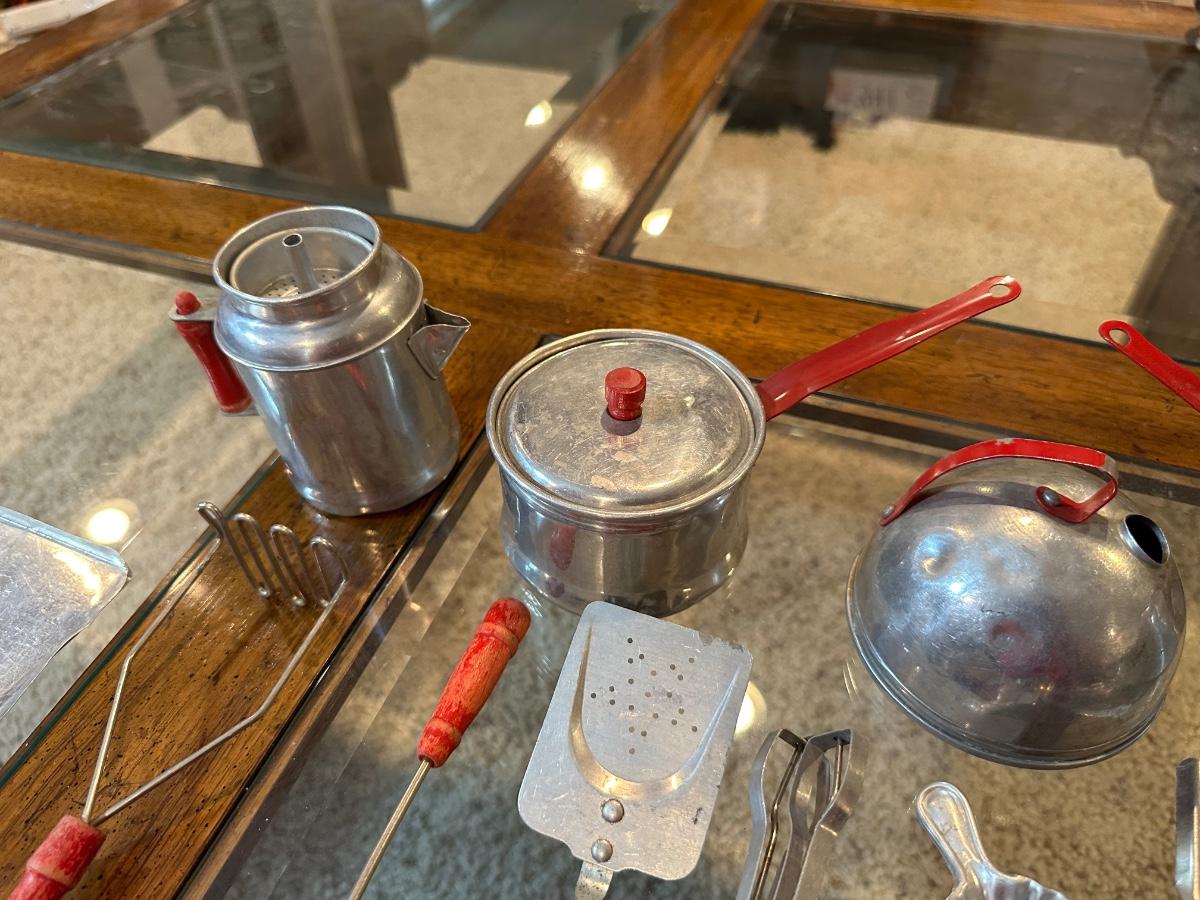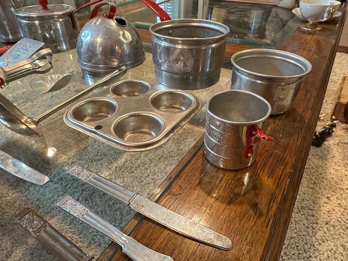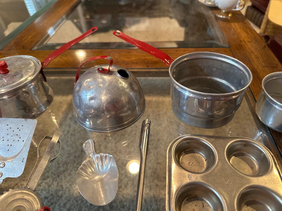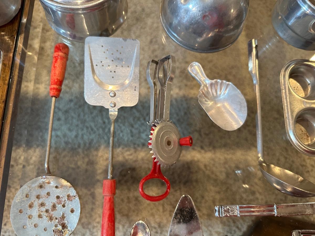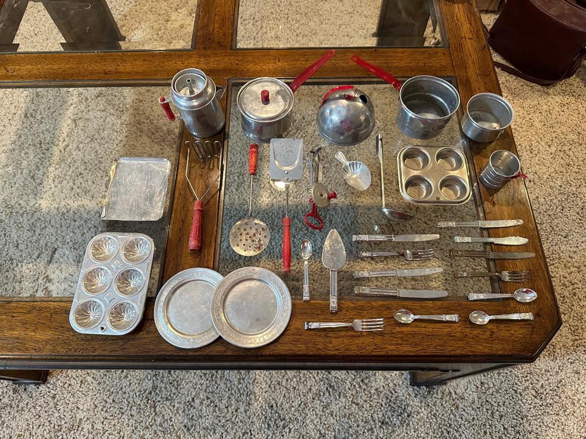 CHILD'S TIN PLAYSET DISHES AND UTENSILS