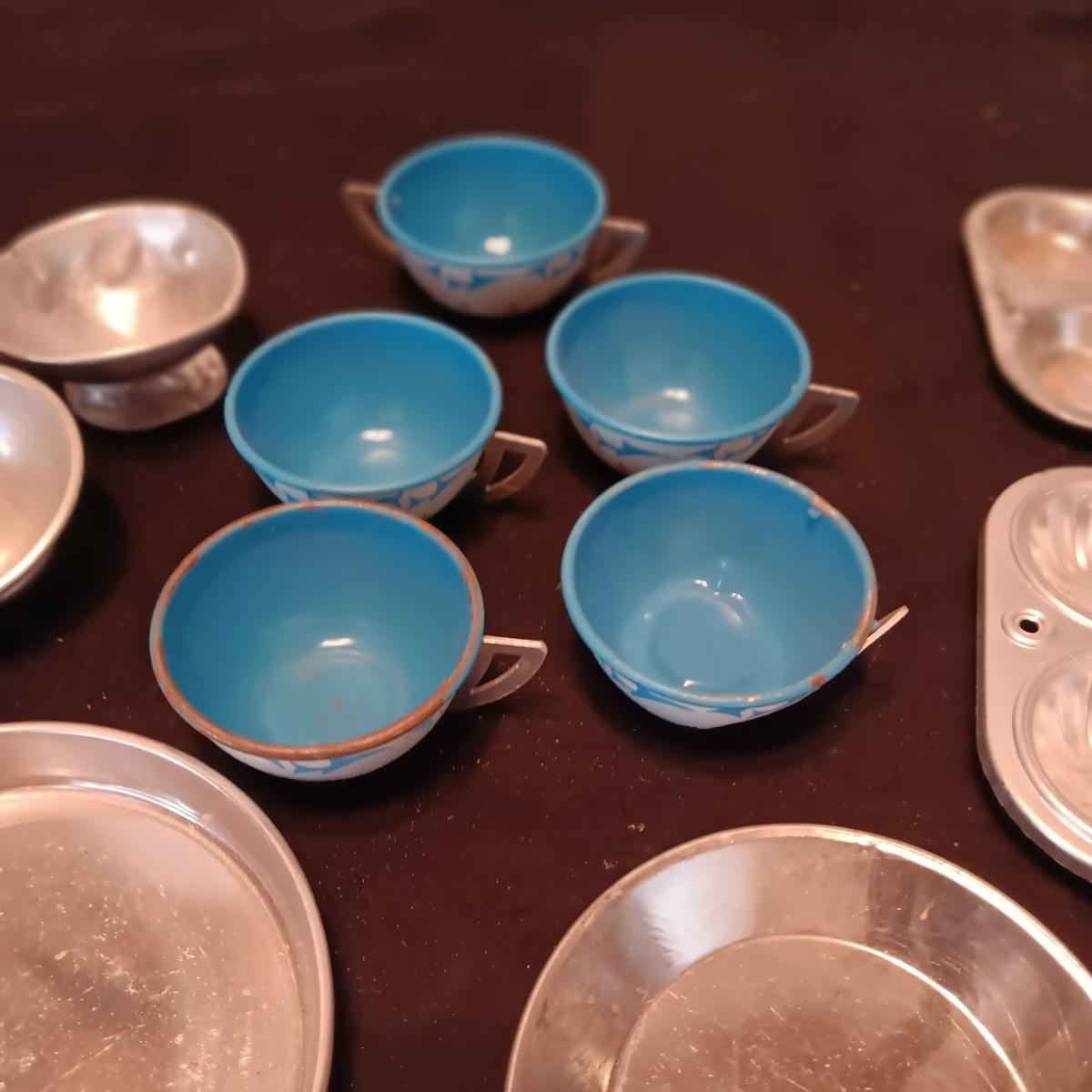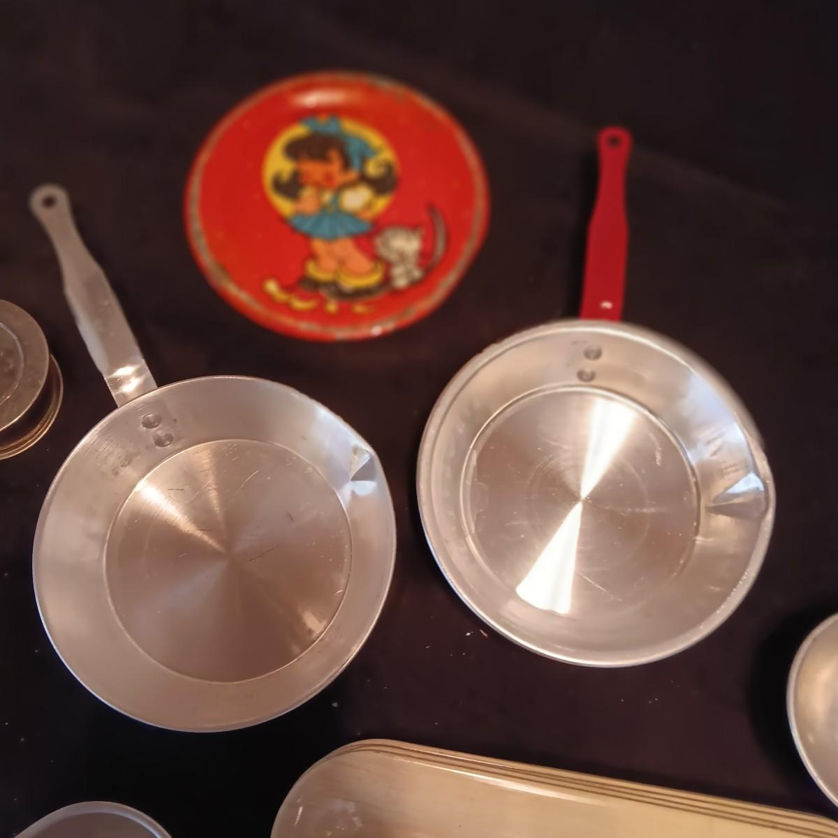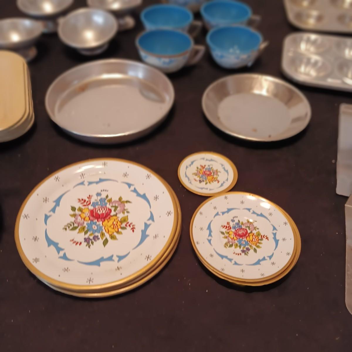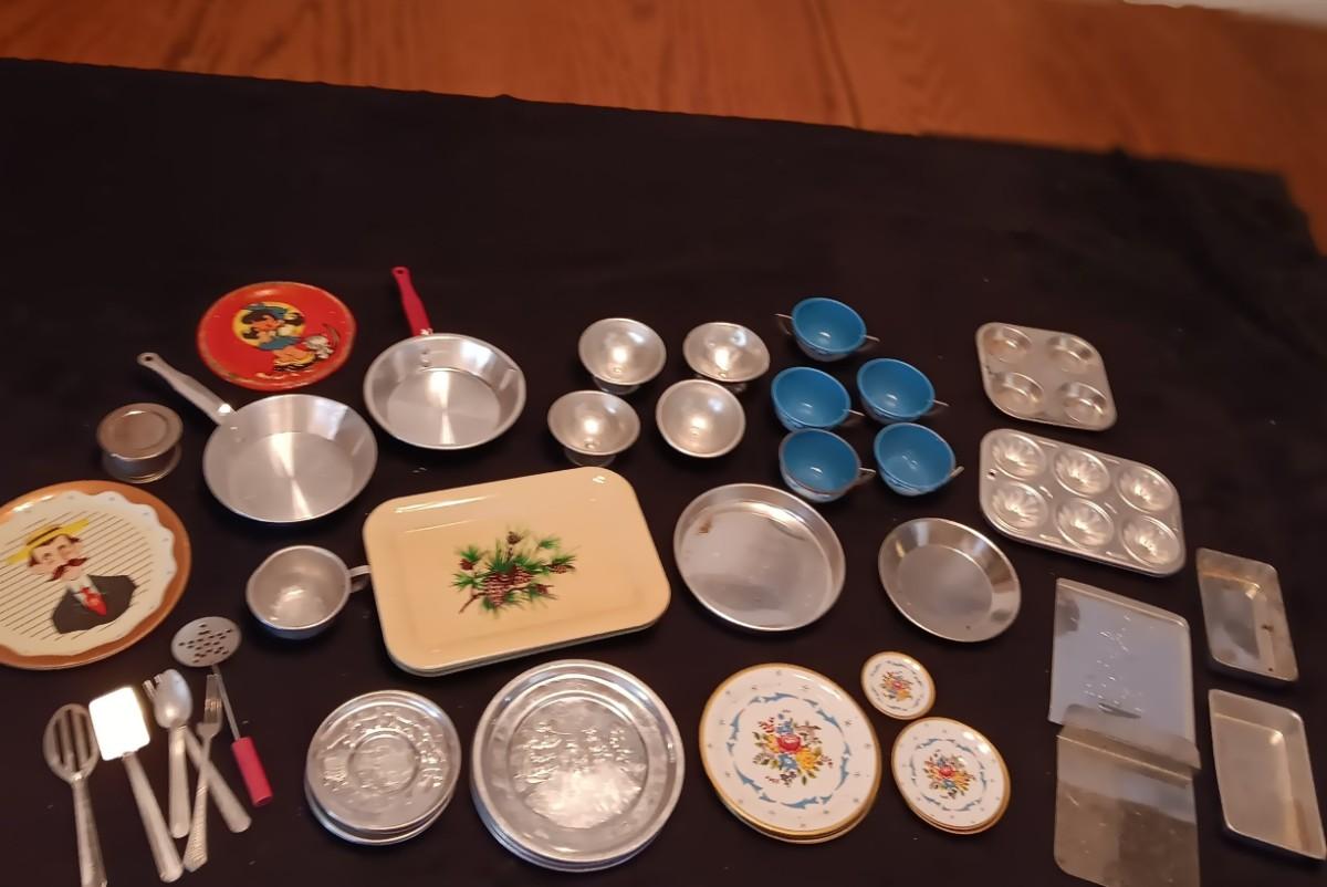 CHILD'S TIN TOY DISHES INCLUDING BAKING, COOKING AND UTENSILS