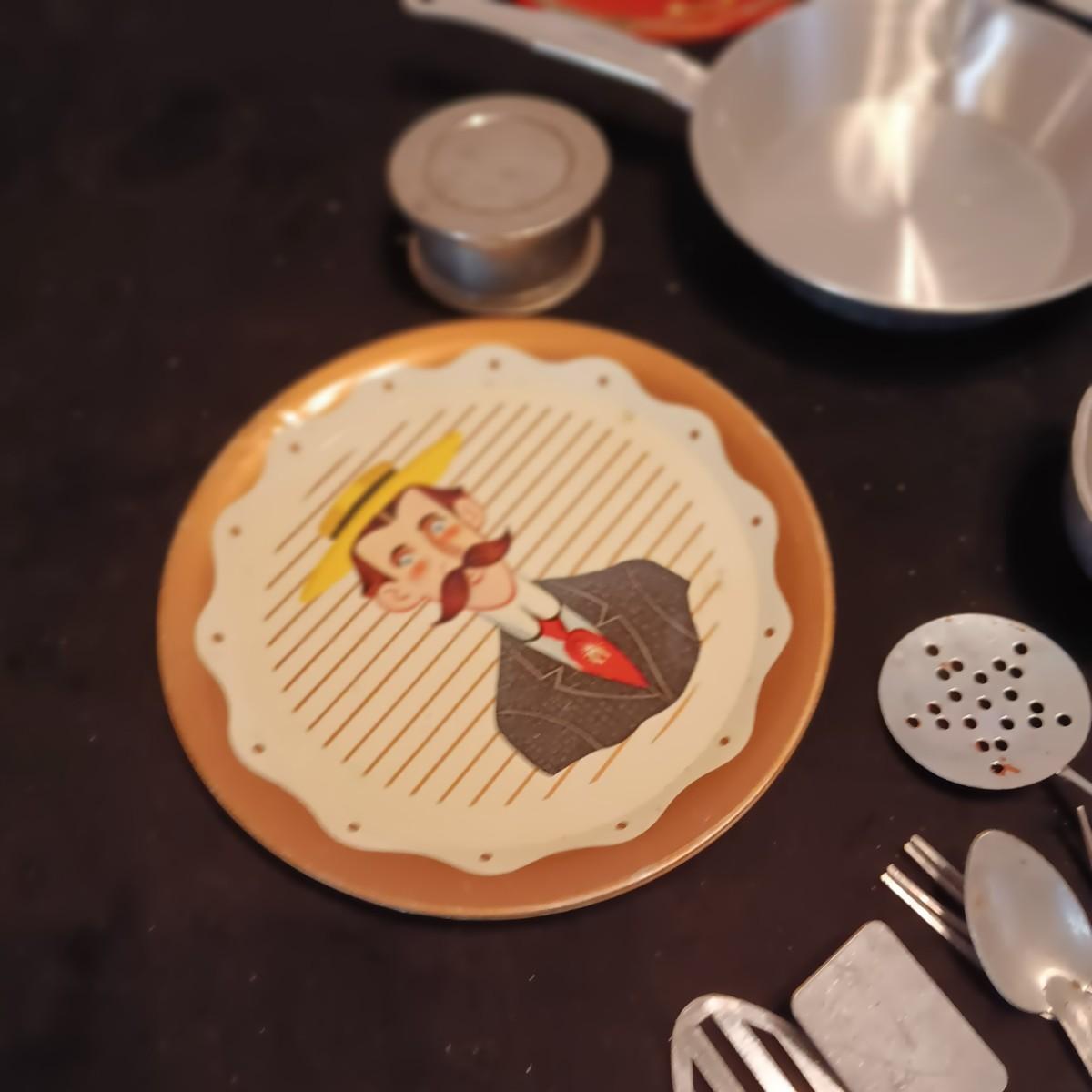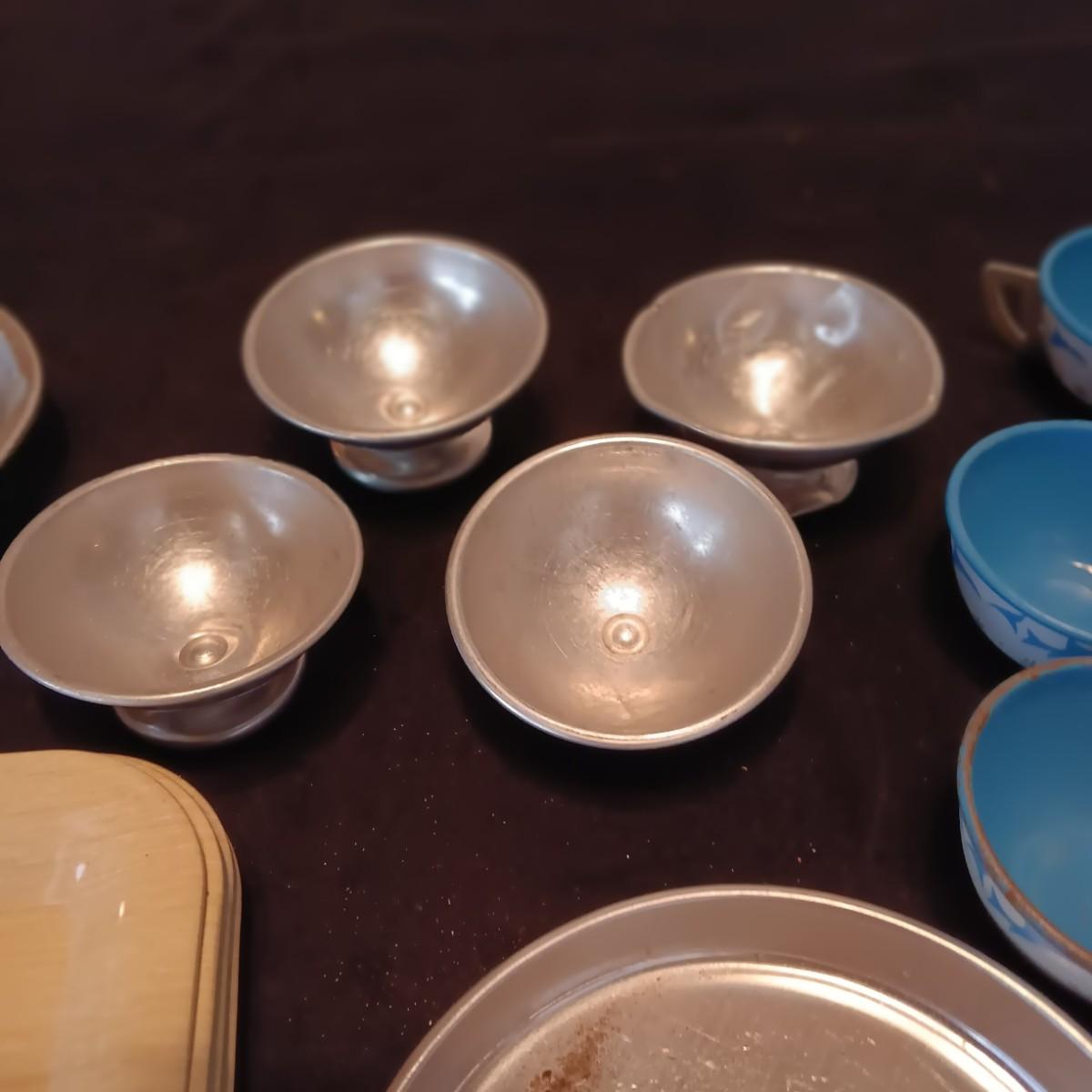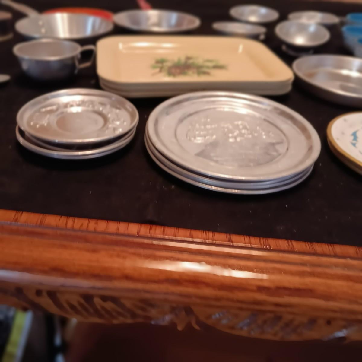 CHILD'S TIN TOY DISHES INCLUDING BAKING, COOKING AND UTENSILS