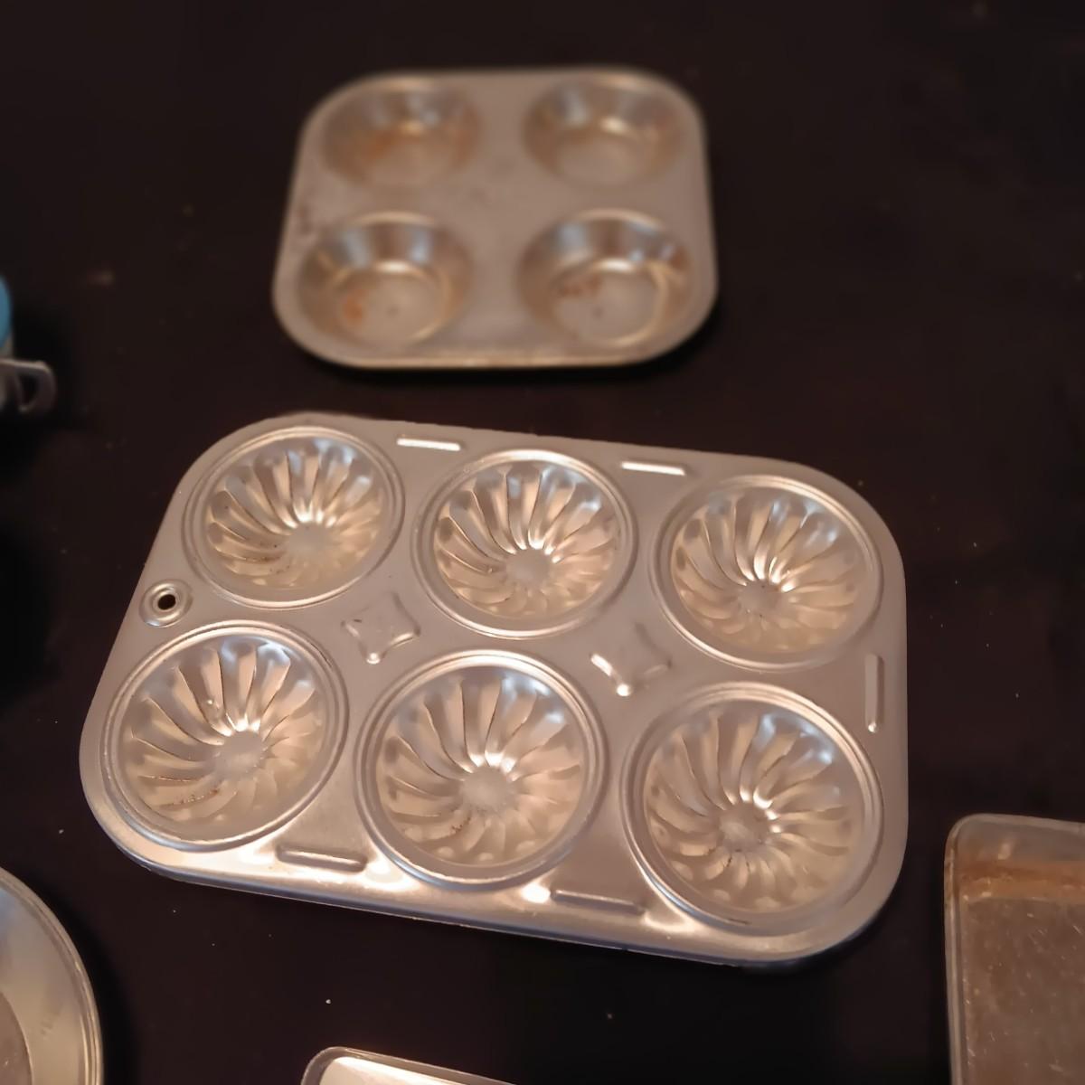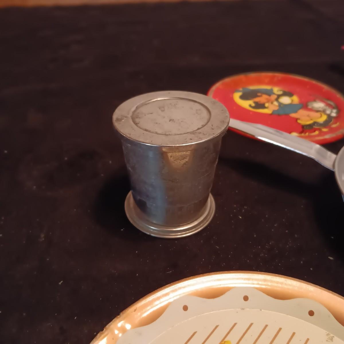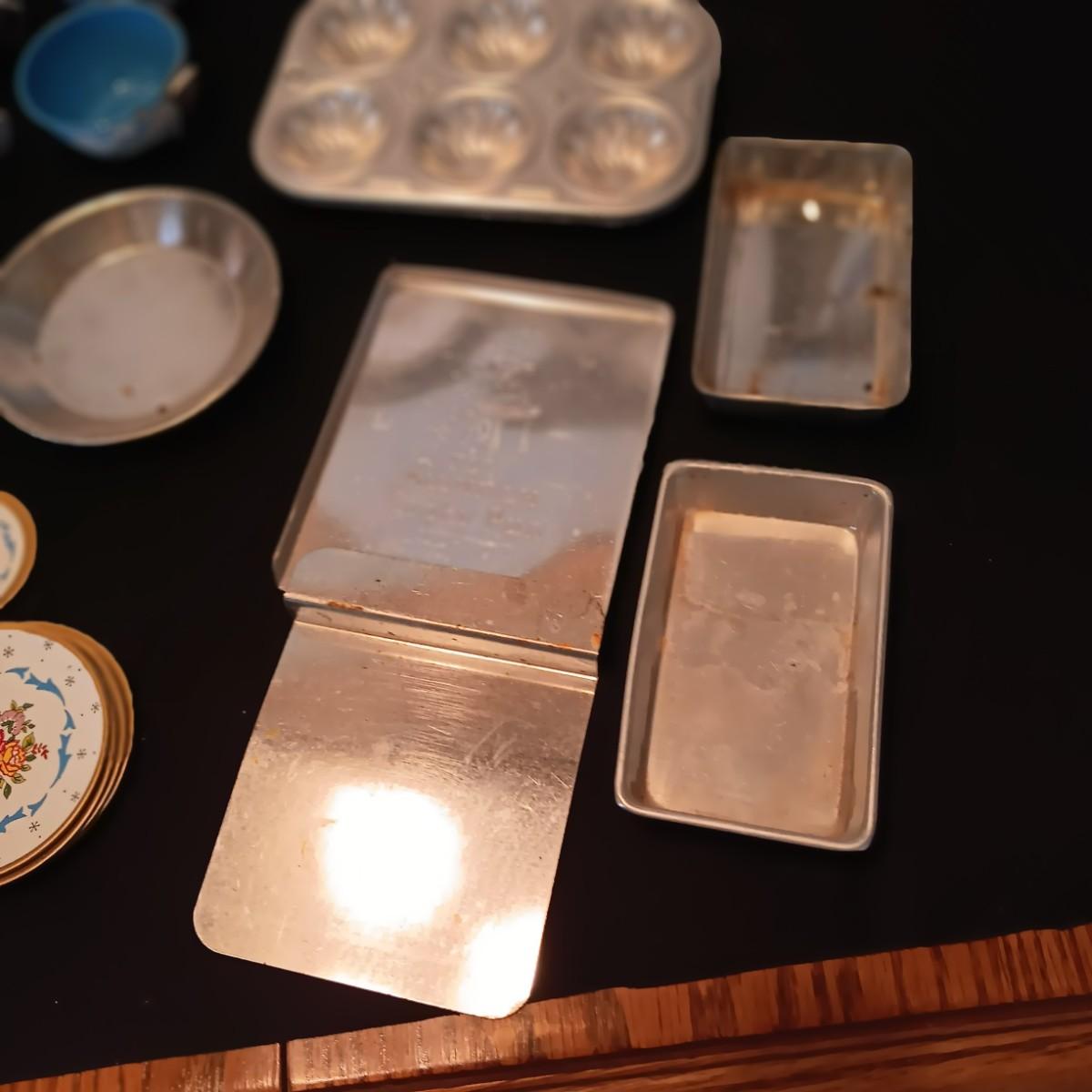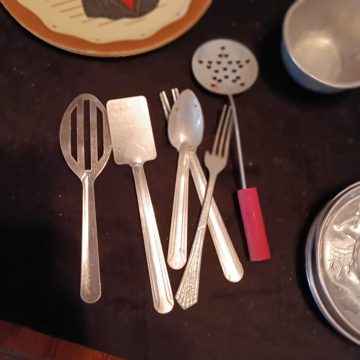 CHILD'S TIN TOY DISHES INCLUDING BAKING, COOKING AND UTENSILS