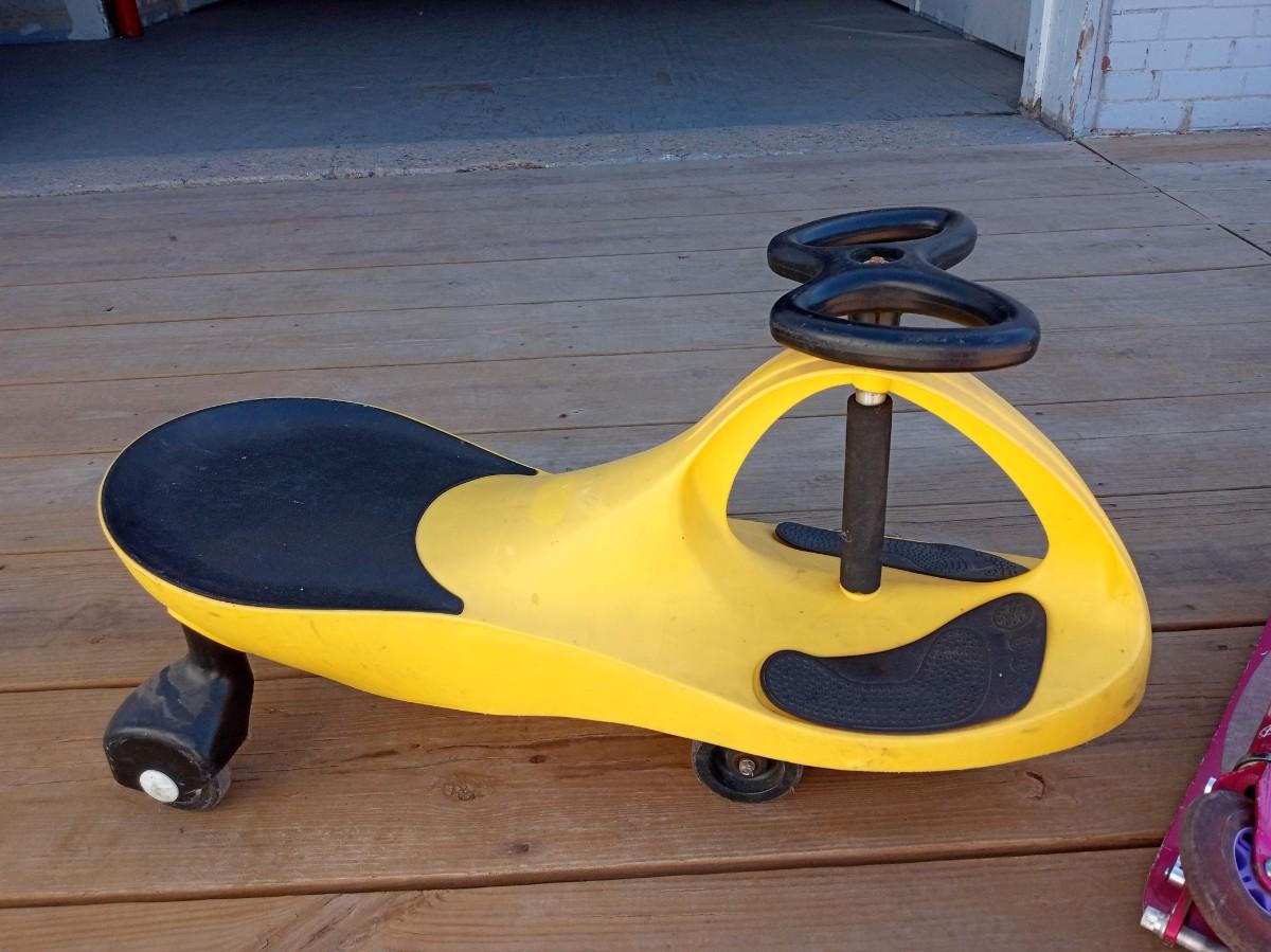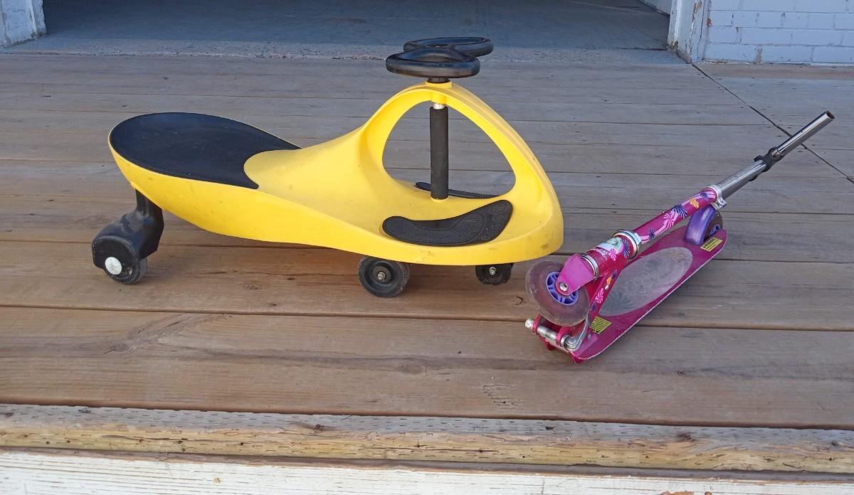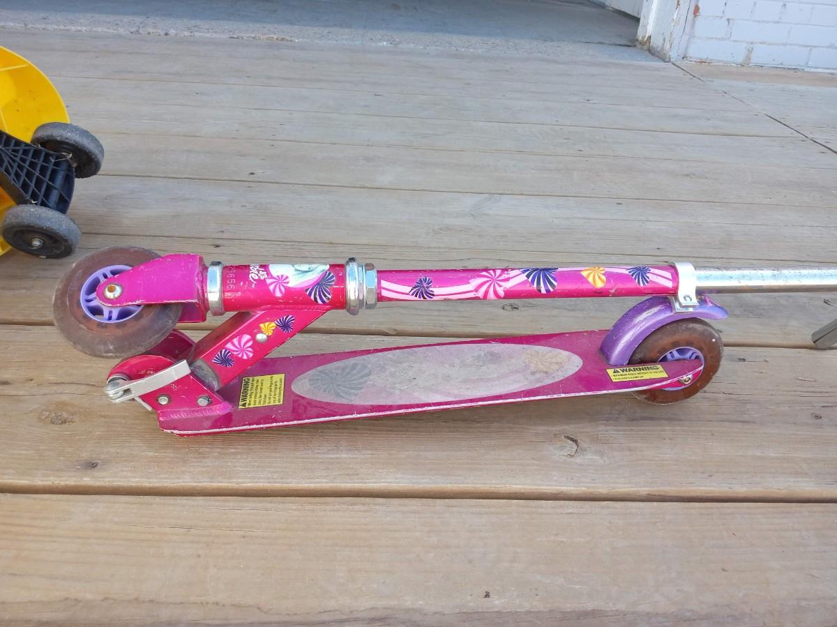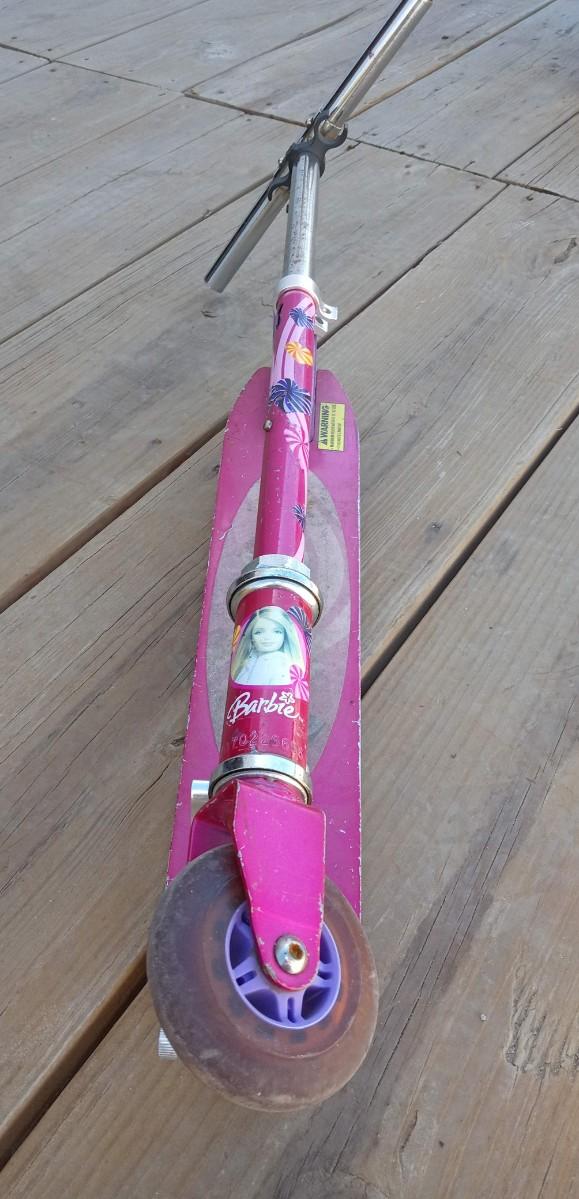 CHILD'S WIGGLE CAR AND A BARBIE FOLDING SCOOTER