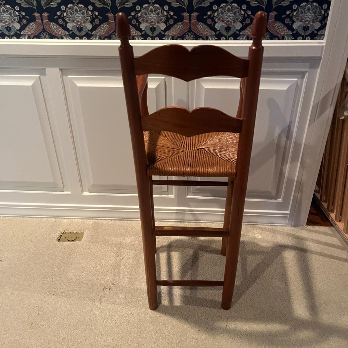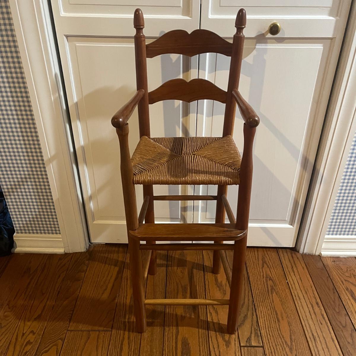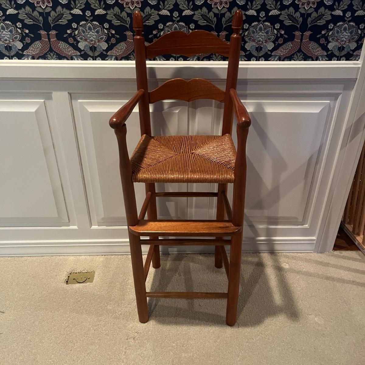 Lot includes a child’s woven seat wooden framed highchair that measures 14” x 13” x 38”H with a 24” seat height.