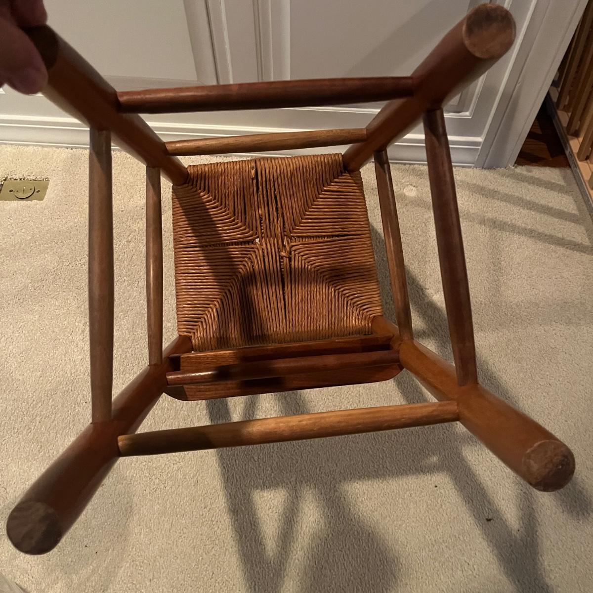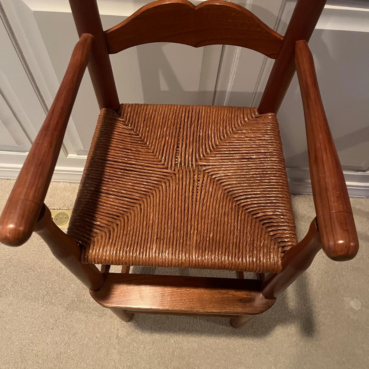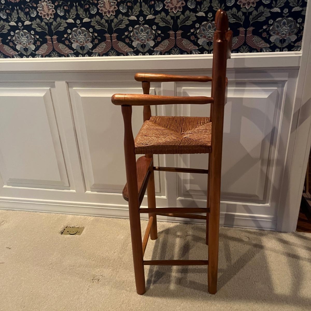 Lot includes a child’s woven seat wooden framed highchair that measures 14” x 13” x 38”H with a 24” seat height.