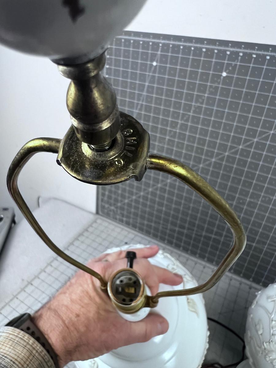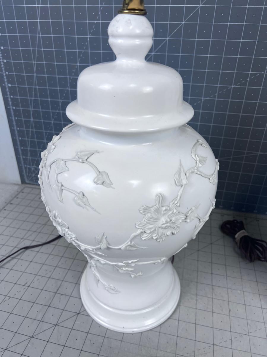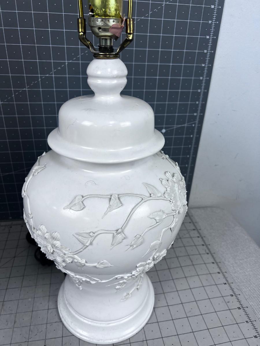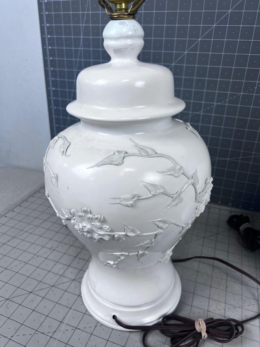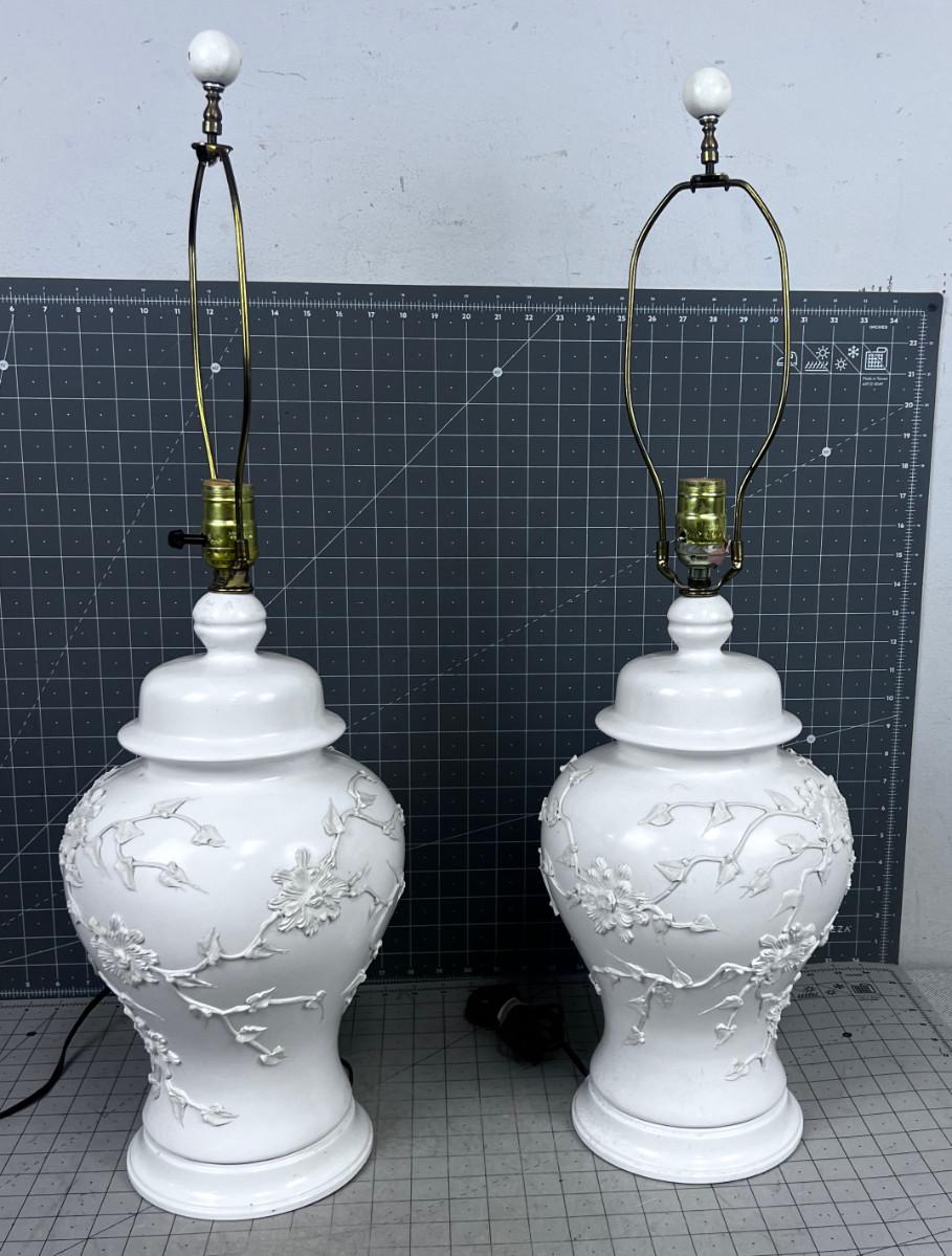Ceramic material. Need Shades. Measure 29" to the Finial. Holly Wood Regency Mid Century Lamps. Pair.