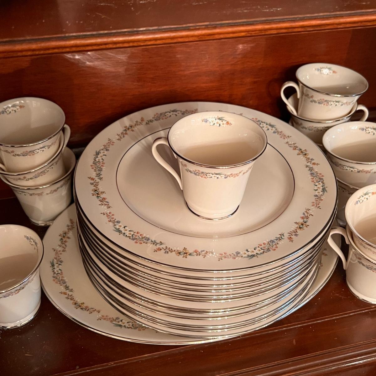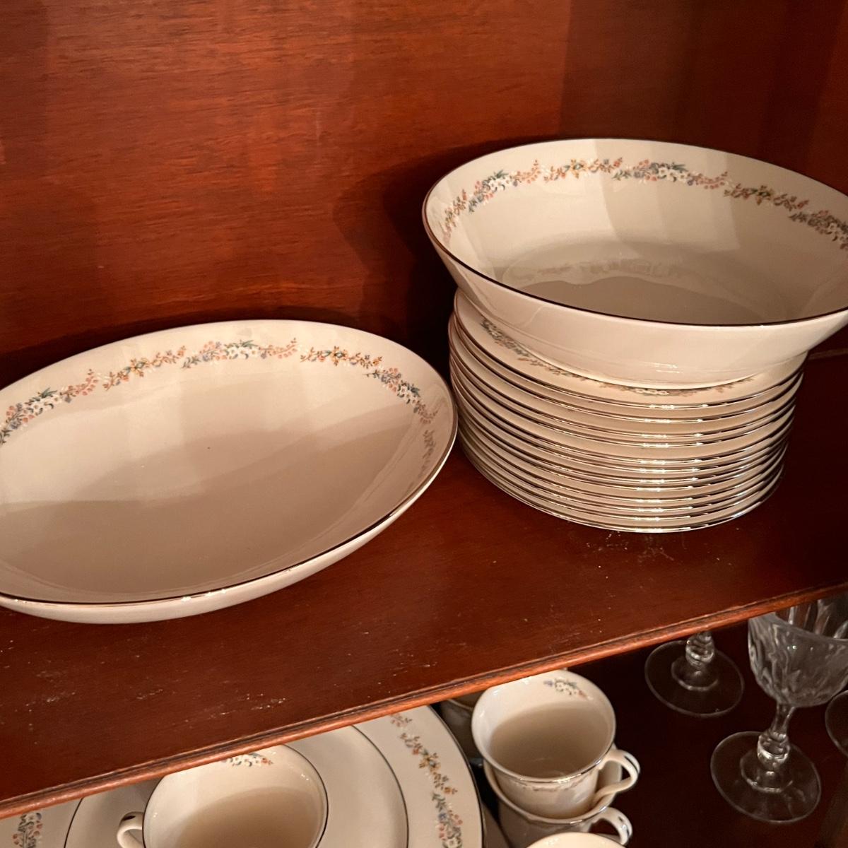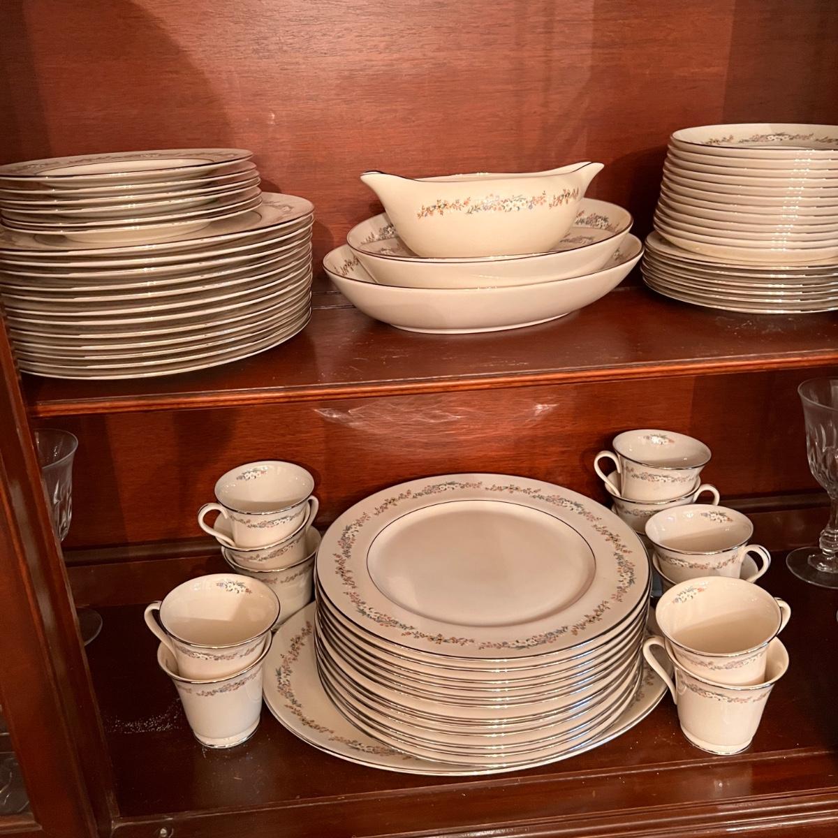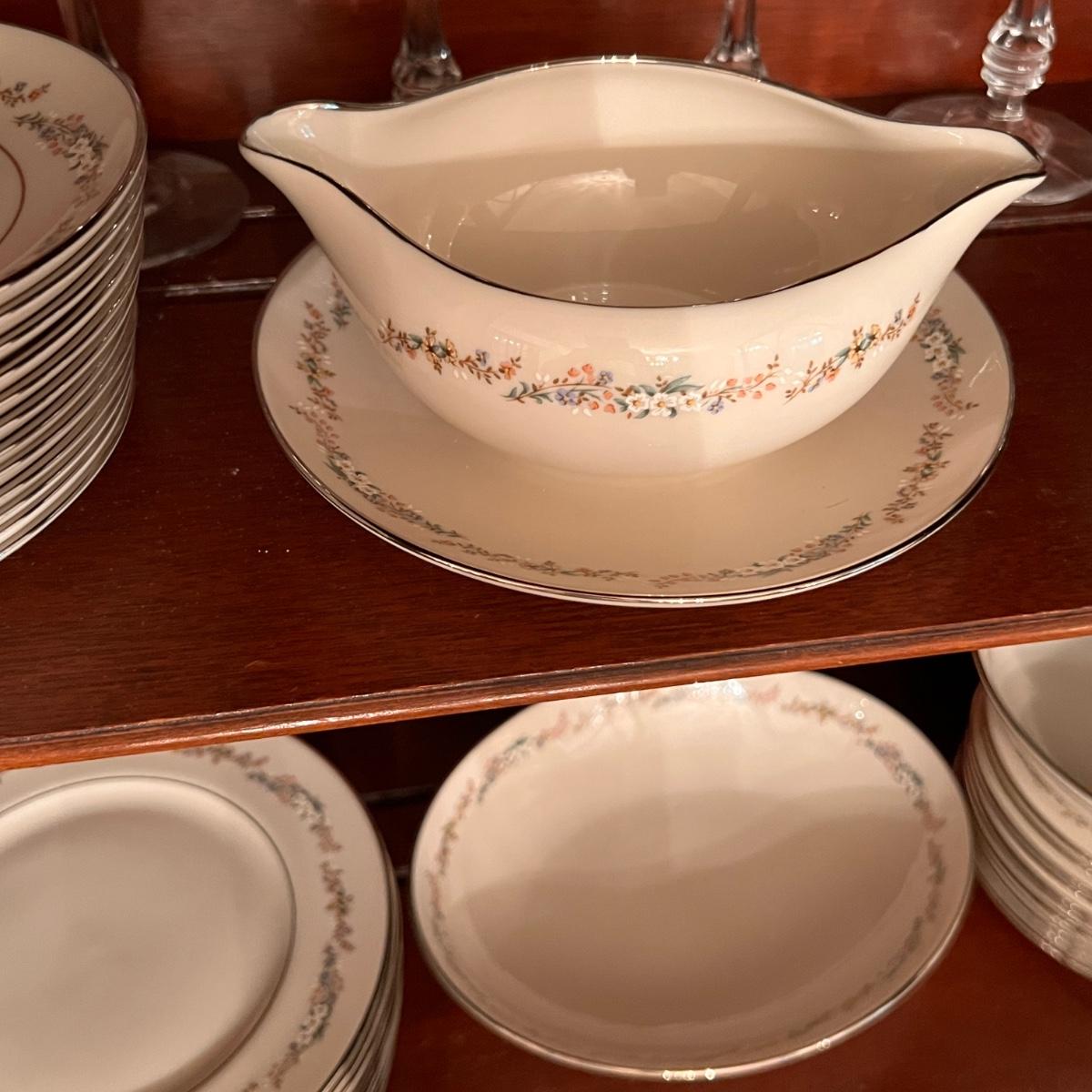 Excellent condition! Full 12 person setting including dinner plates, tea cups, tea cup plates, salad plates, vegetable bowls?, plus serving platter, serving bowl, gravy boat with attached underplate.