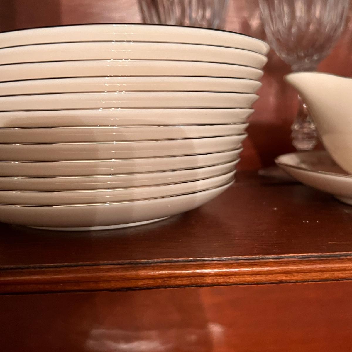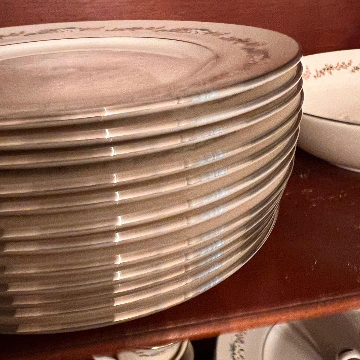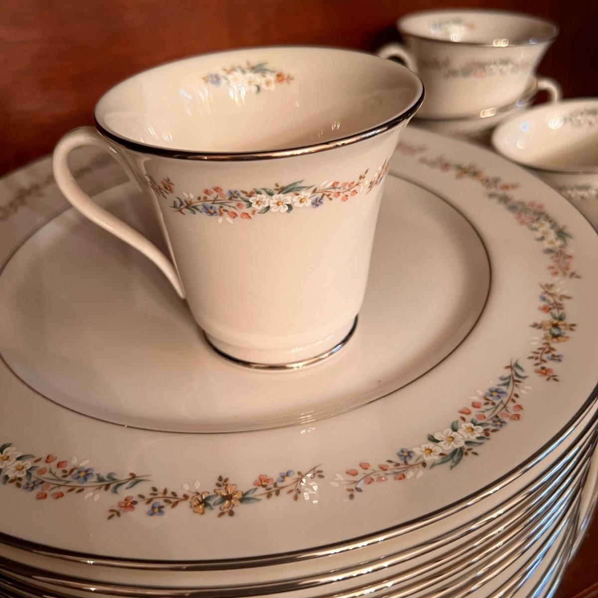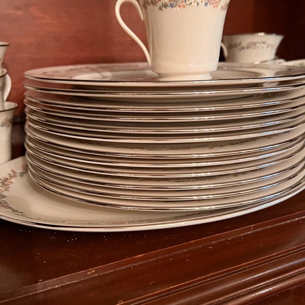 Excellent condition! Full 12 person setting including dinner plates, tea cups, tea cup plates, salad plates, vegetable bowls?, plus serving platter, serving bowl, gravy boat with attached underplate.