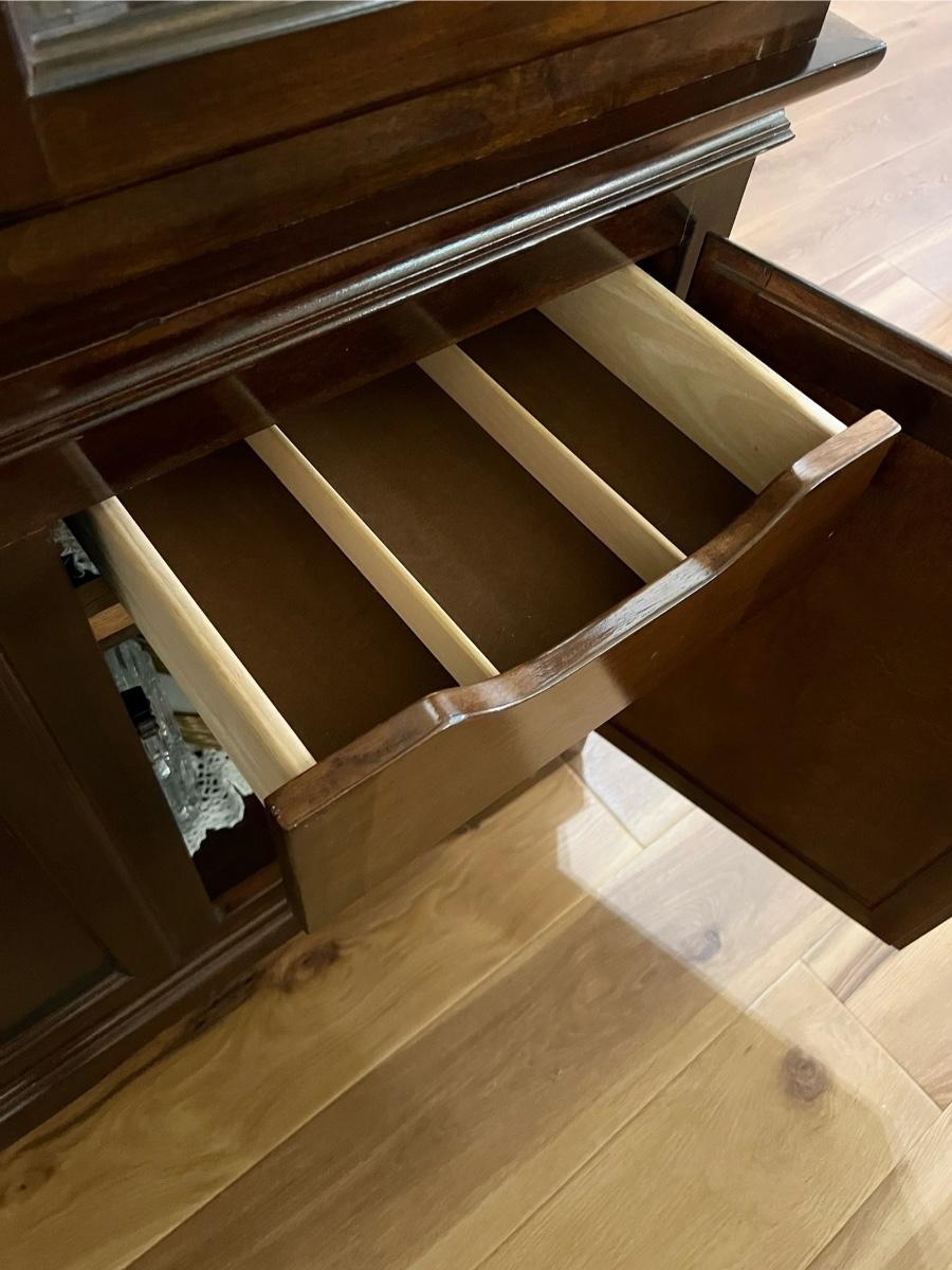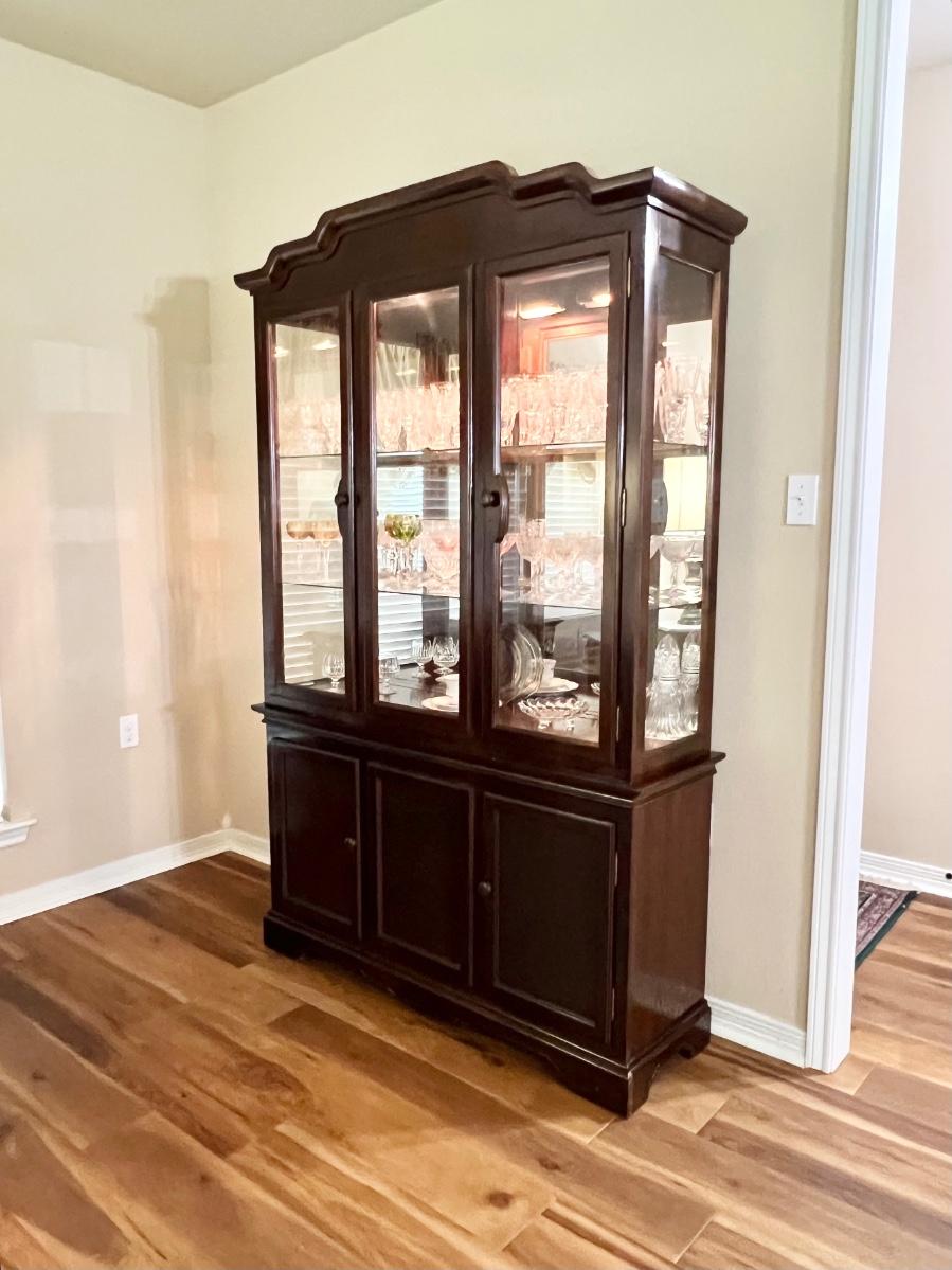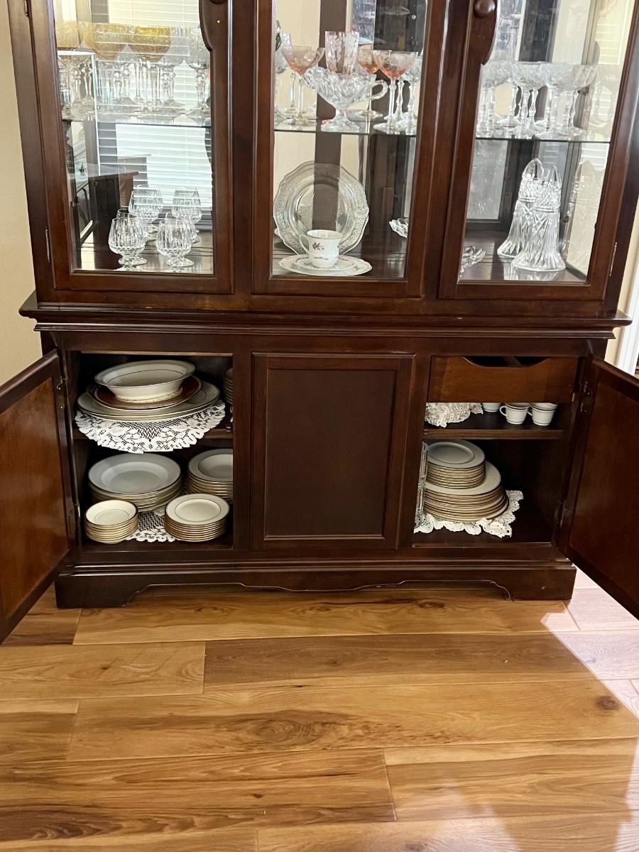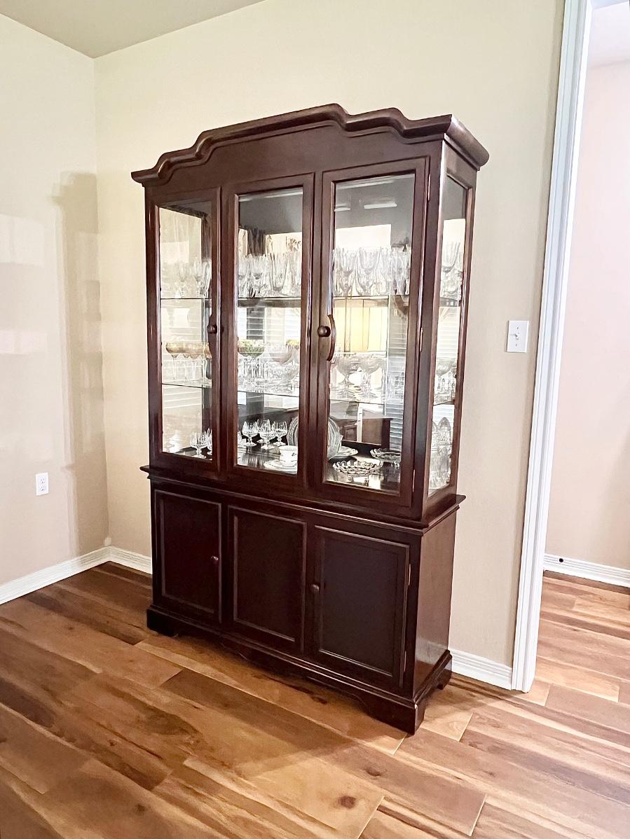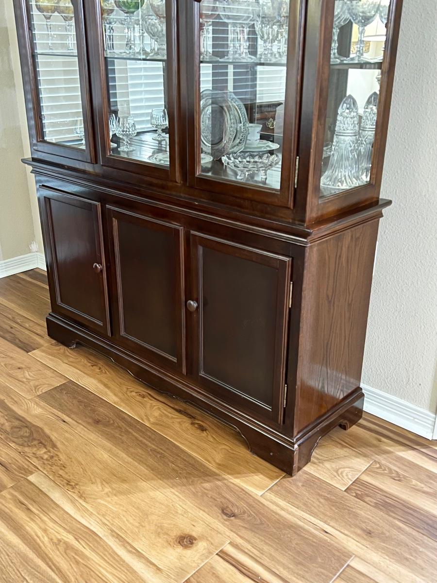 2 pieces ~ Glass shelving is not adjustable but is removable ~ No brand ~ Top piece has slight wood separation, see photos ~ Bottom = 30.25” H x 52.5” W x 16.25” D ~ Top = 52.25” H x 53” W x 16.5” D