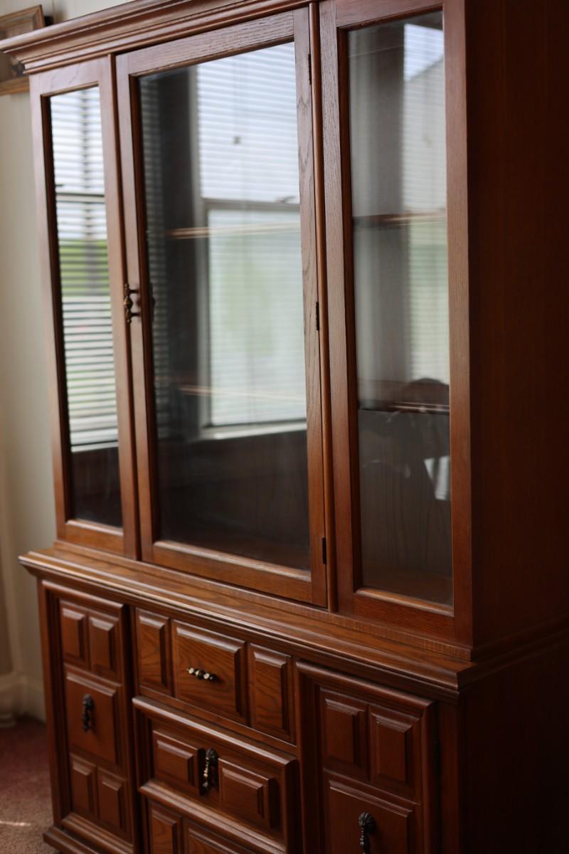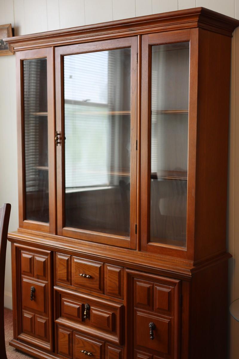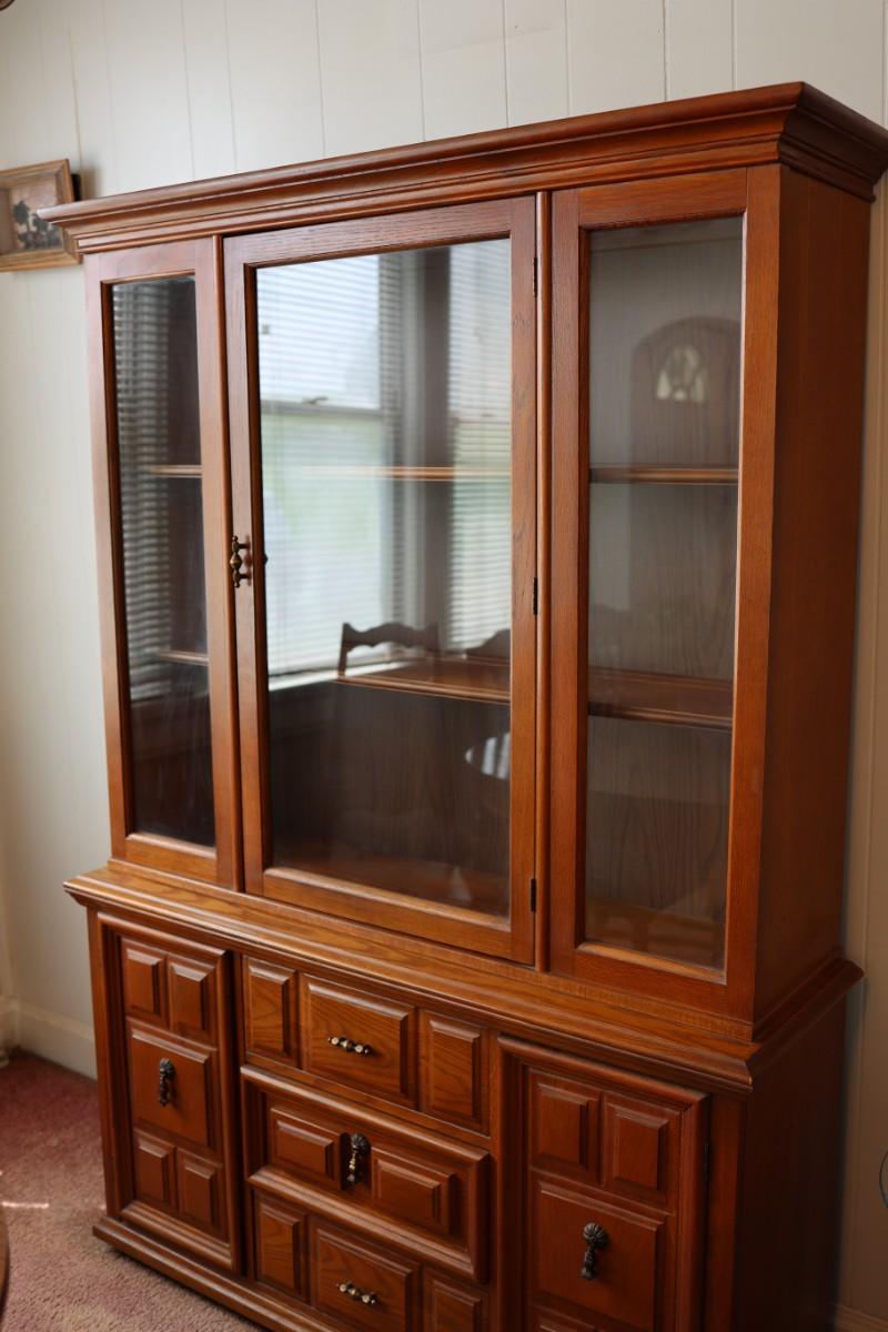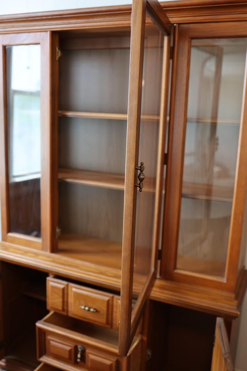 China cabinet with 1 glass door, 3 deep drawers and 2 cabinet doors.