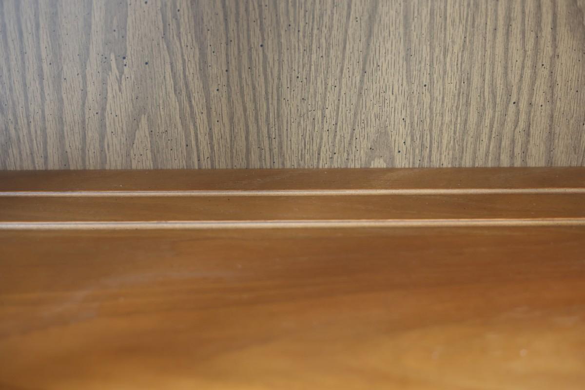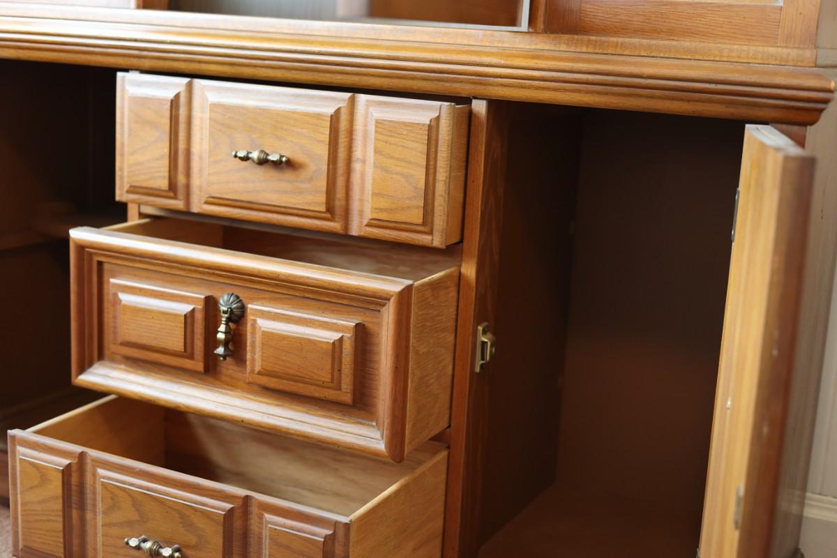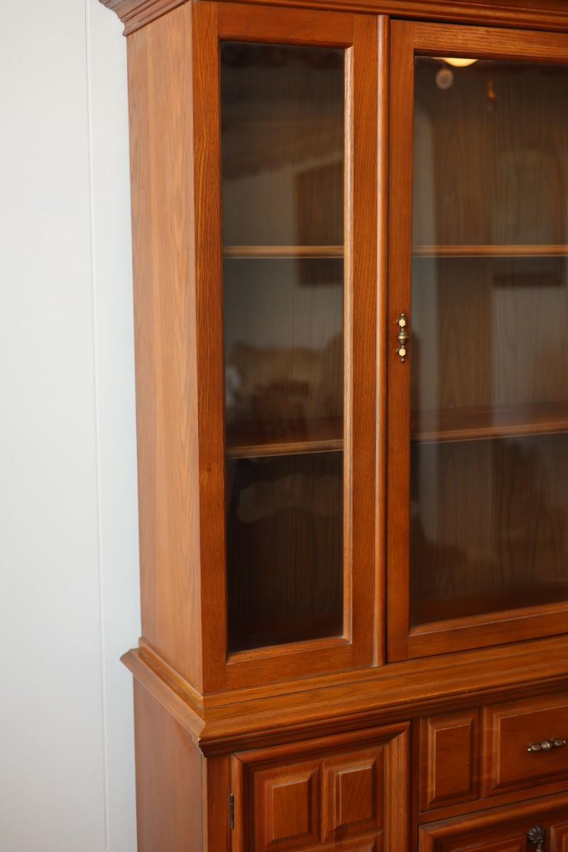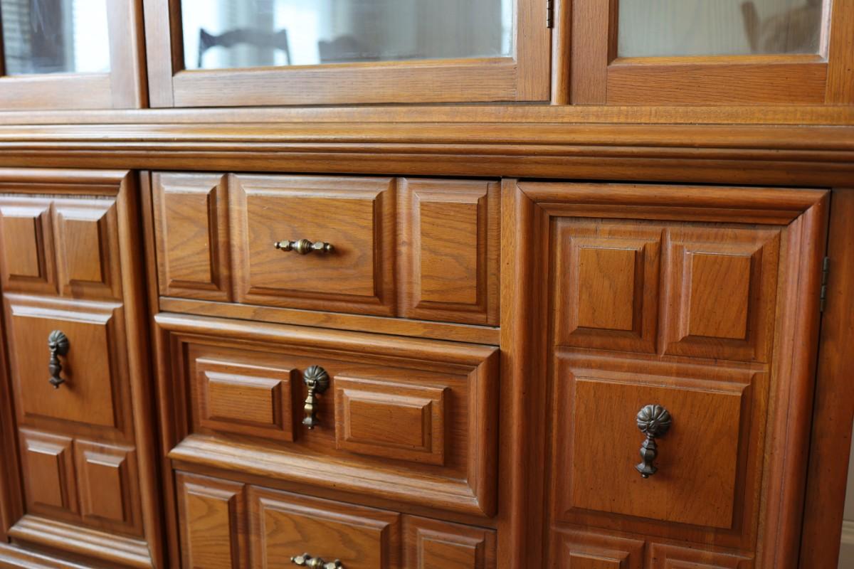 China cabinet with 1 glass door, 3 deep drawers and 2 cabinet doors.