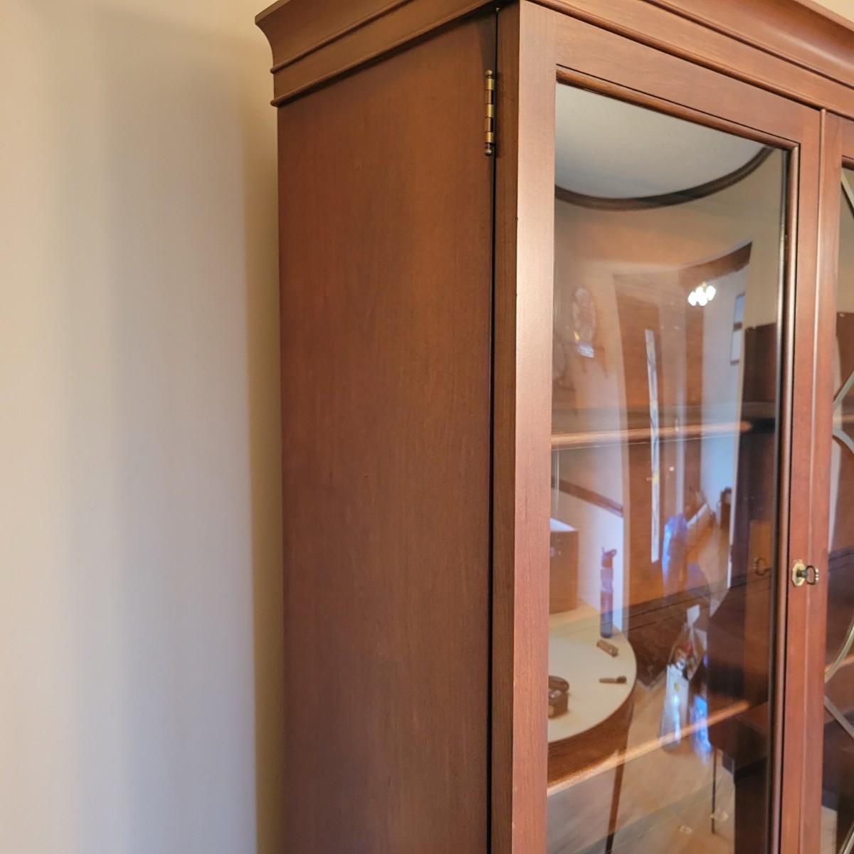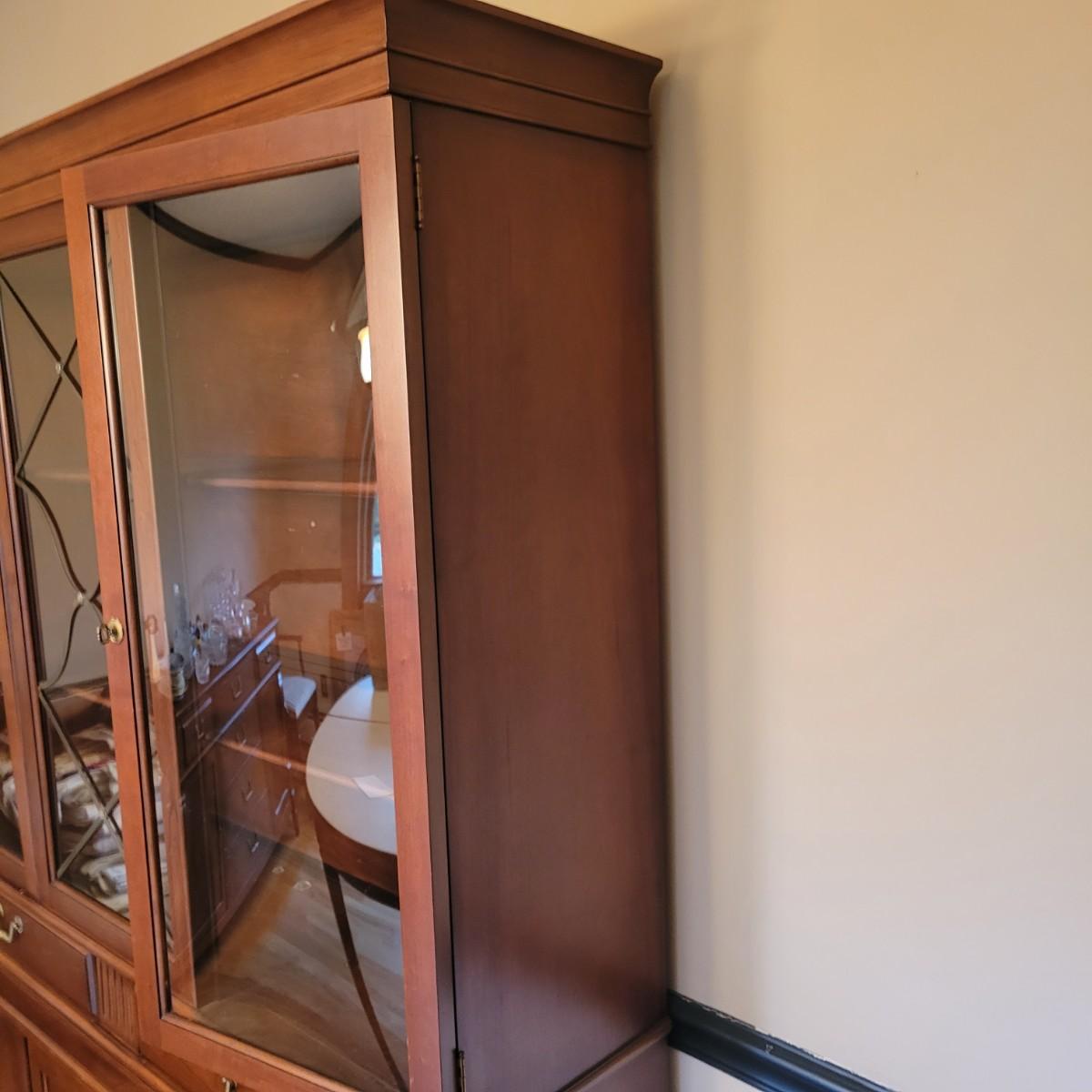A solid wood china cabinet with a hutch that measures approximately 54" x 15" x 74.5"H. The hutch has three glass doors with two adjustable wooden shelves. The cabinet has two dovetailed drawers and one drawer is separated and lined with felt. Below that are three cabinet doors. This piece does not separate into two pieces. Local pickup only. Winning bidder must bring assistance to help move and load this item due to its weight and/or size.