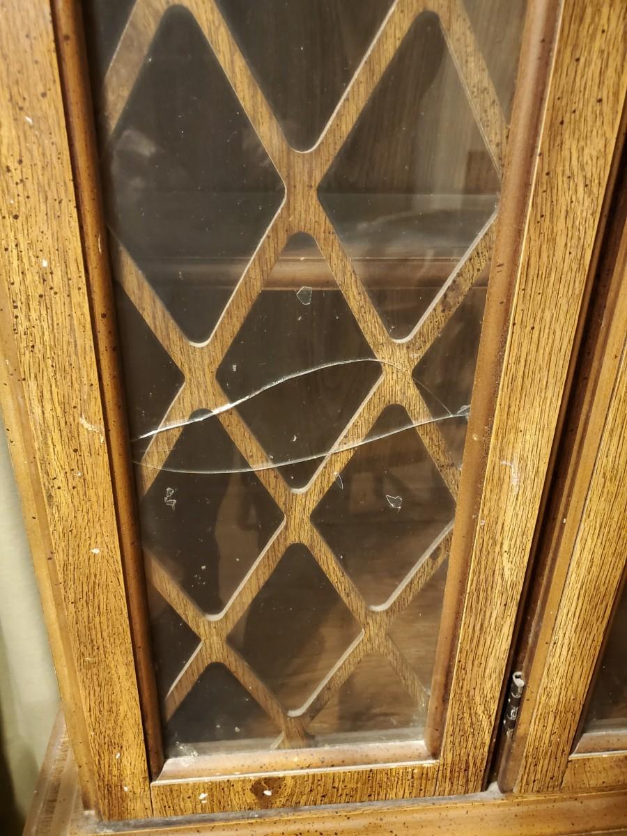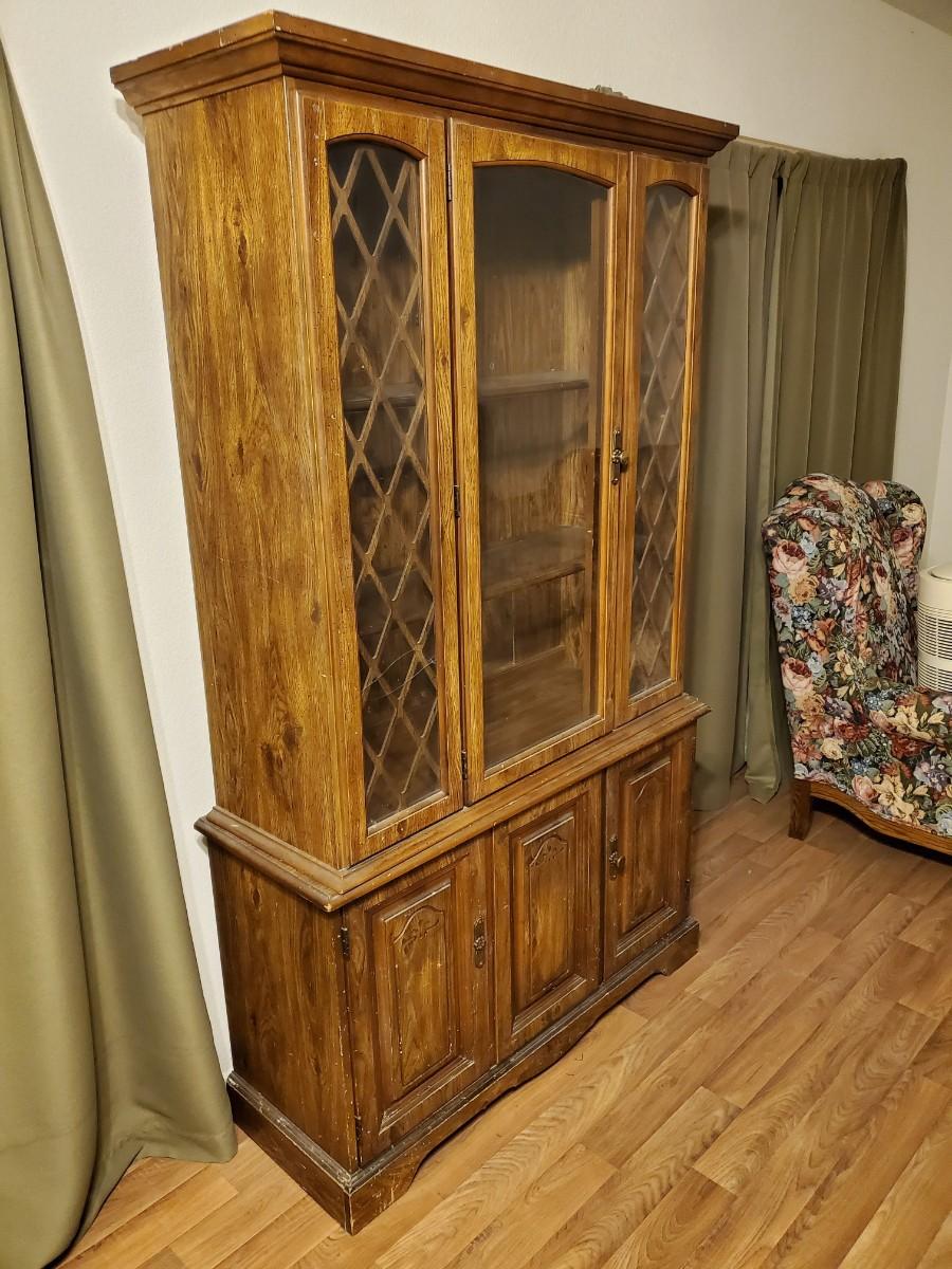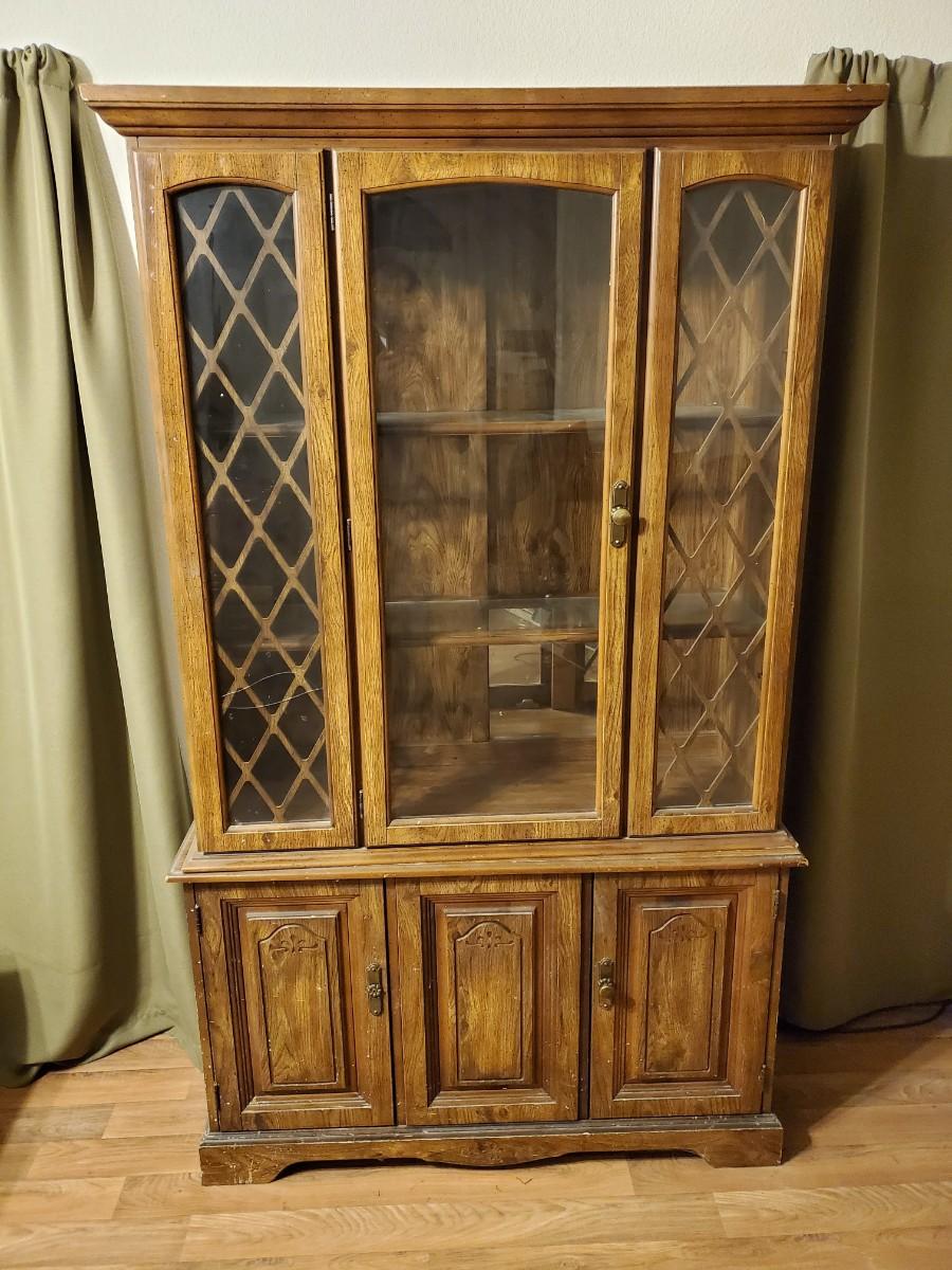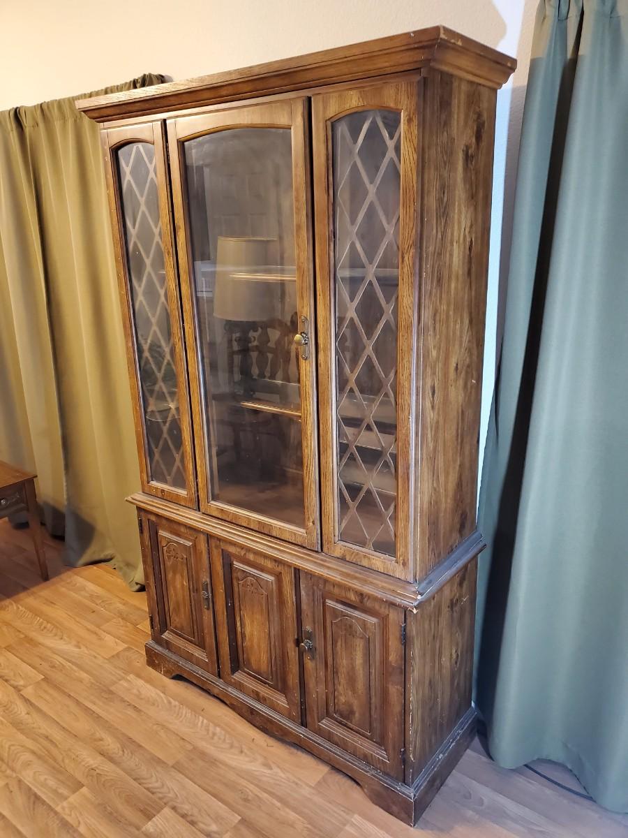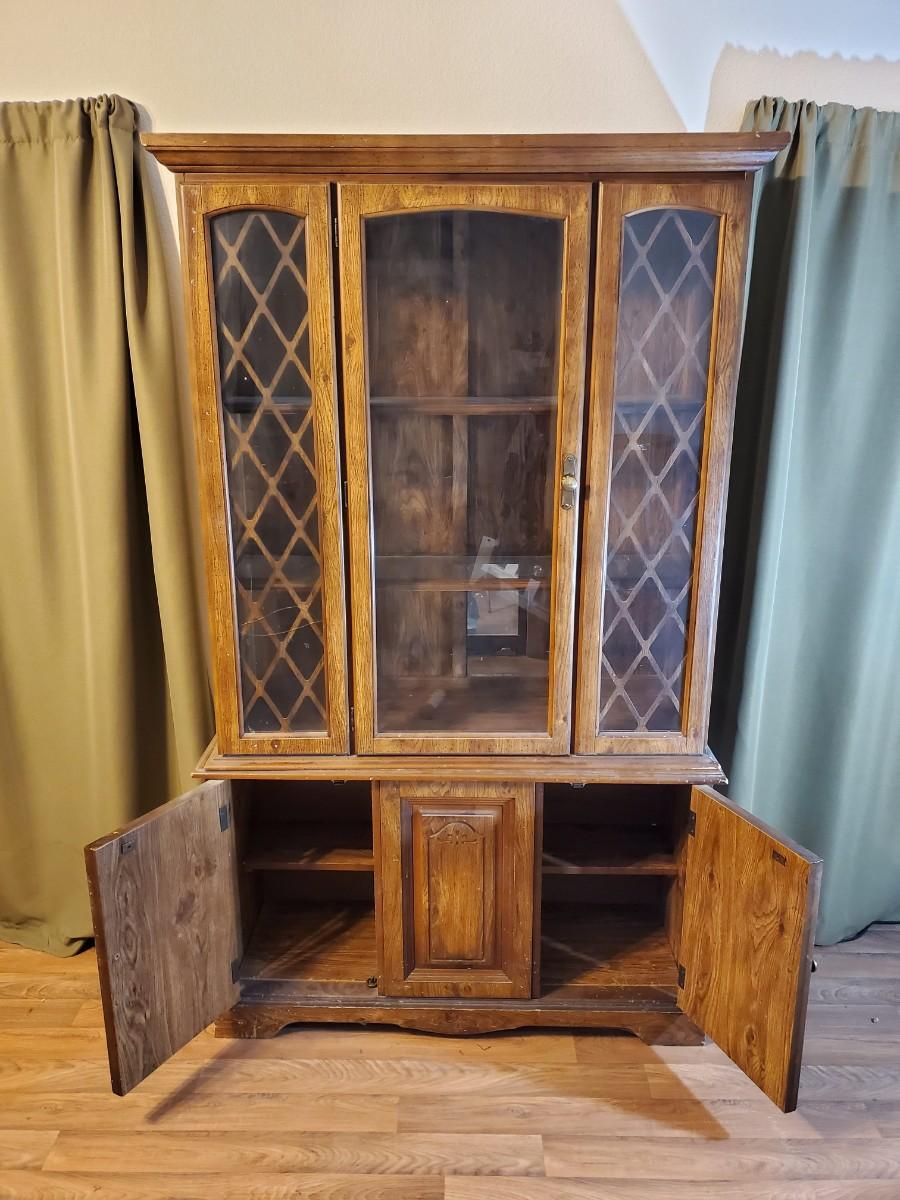 With a little TLC, this distressed piece of fine cabinetry will dress up any room. It is actually comprised of two sections that can be moved separately, with glass in the upper section only. Glass on the left side is cracked.