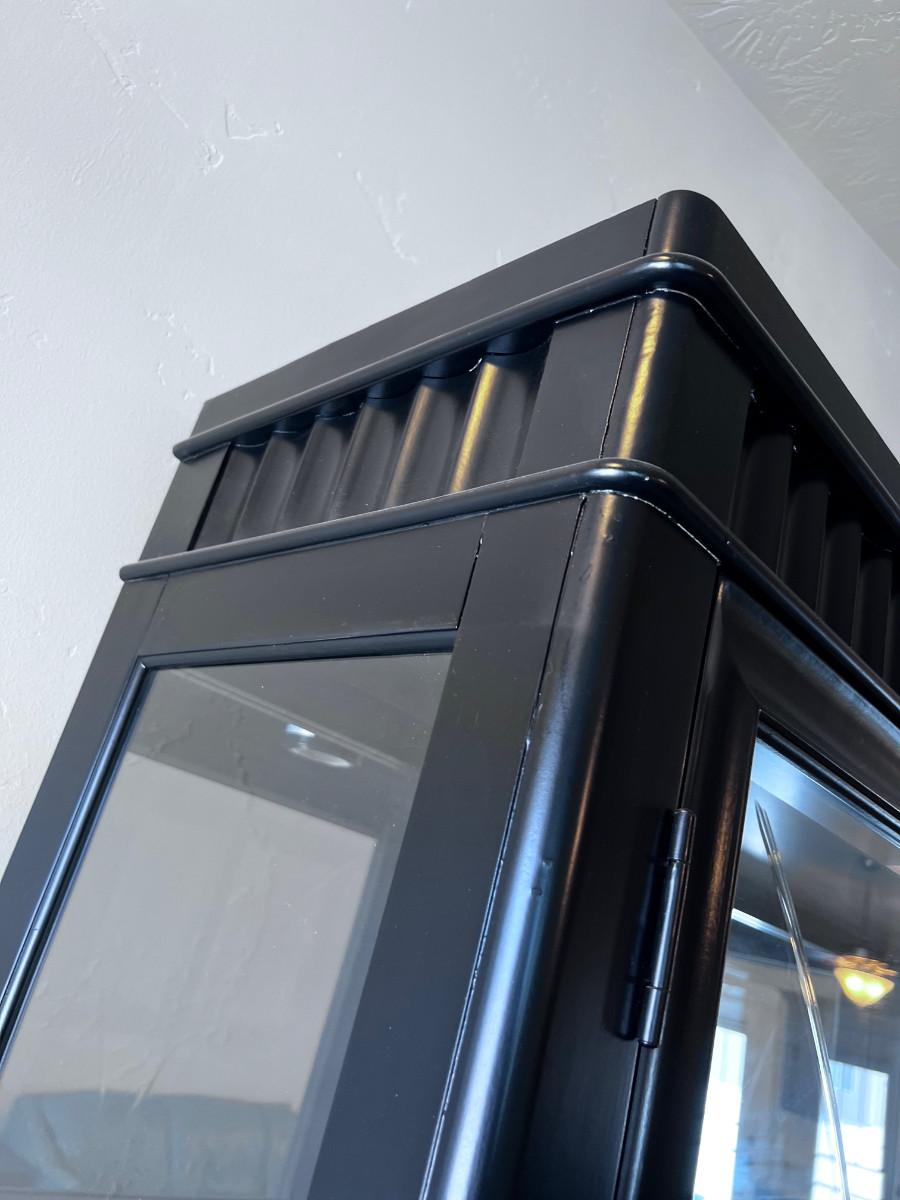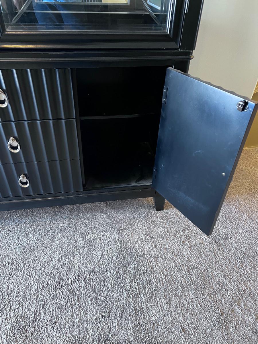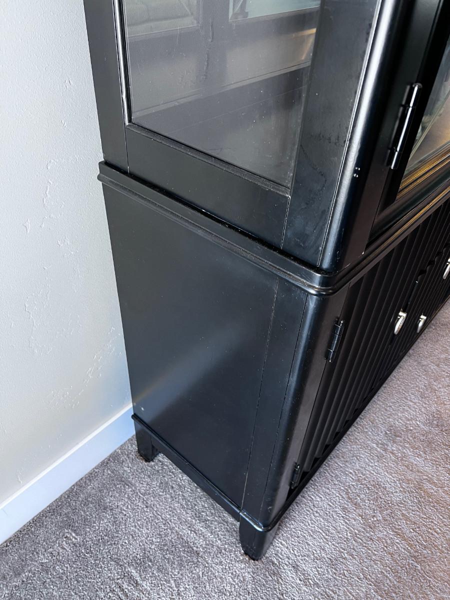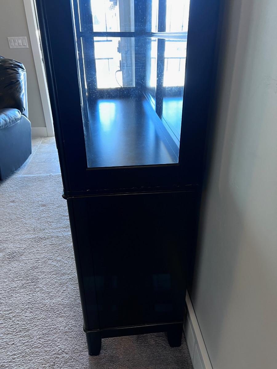 54" X 16" Deep by 82" High. Very Good Condition. Black with Glass Shelves. Upper Pieces is 50" Tall