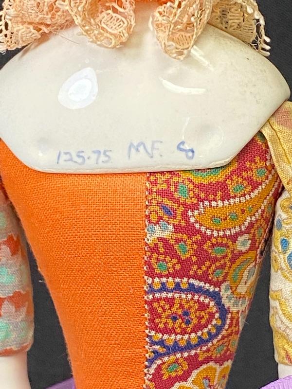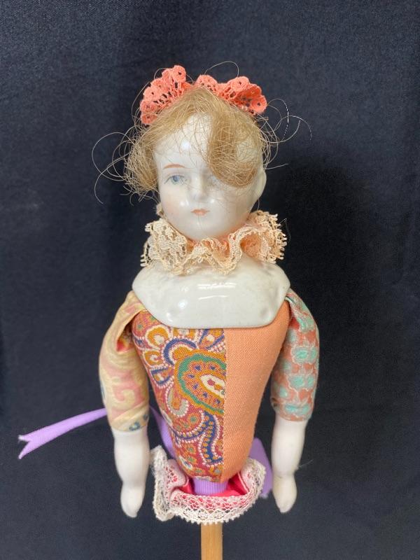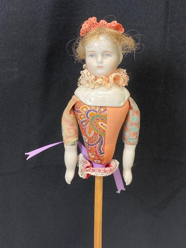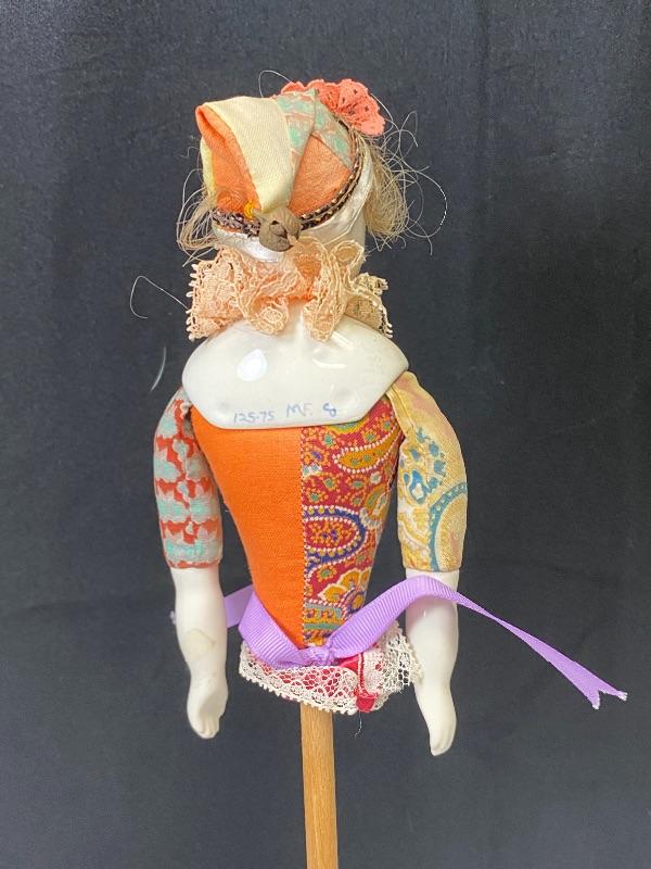 Antique china head clown doll. No lower body, she is a stick puppet. Pale features, colorful clothes. Marked on the back 125.75 MF Co. Doll is about 5" long, 14" total with stick.