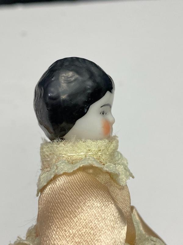 6" china head dollhouse doll. Peach satin dress is a little faded.. Low brow, black eyes , molded hair. The gloss finish has worn on her head. China hands and legs, painted boots.