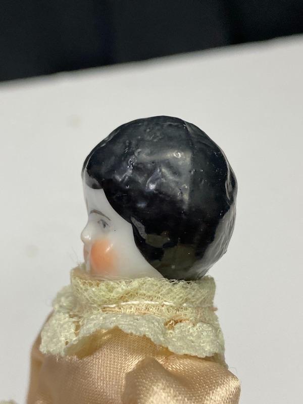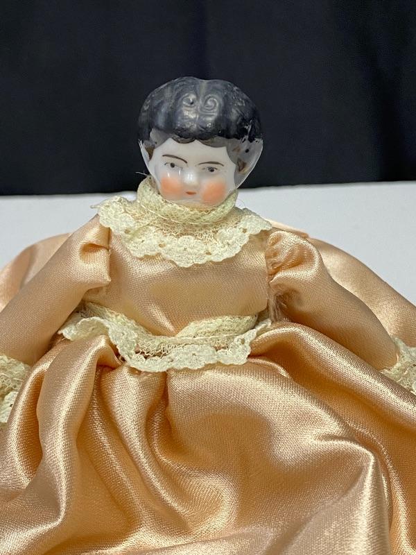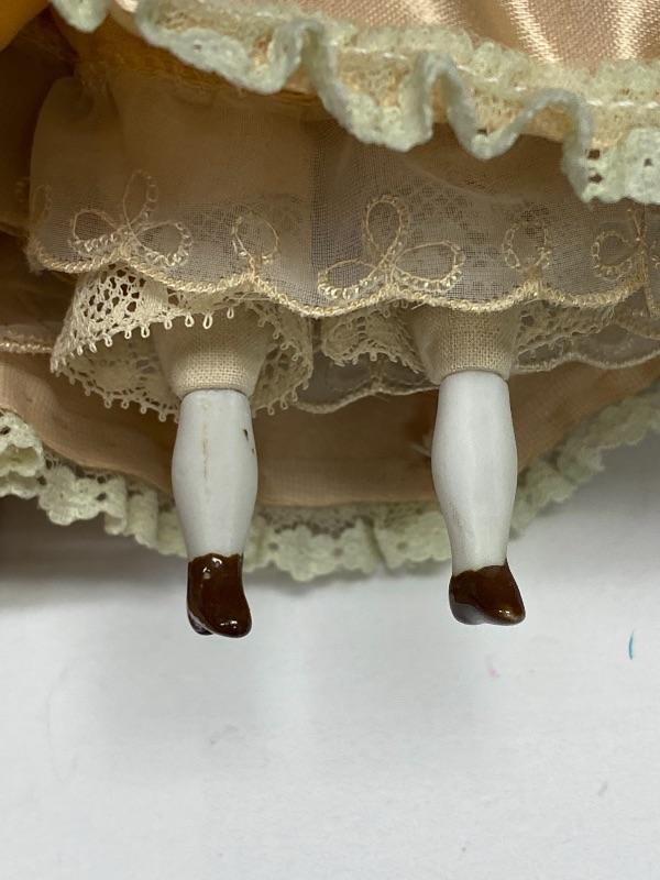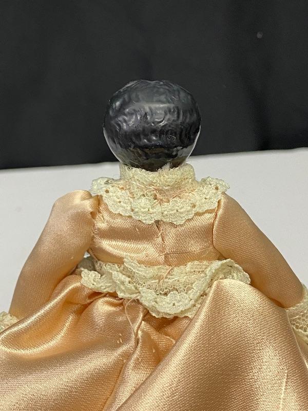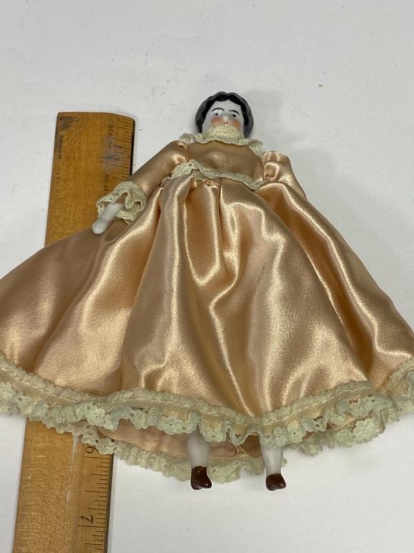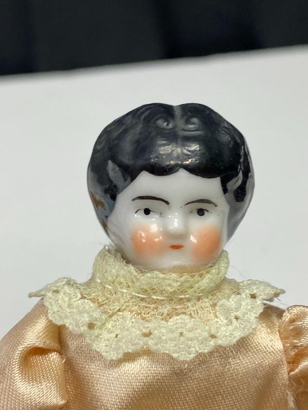 6" china head dollhouse doll. Peach satin dress is a little faded.. Low brow, black eyes , molded hair. The gloss finish has worn on her head. China hands and legs, painted boots.