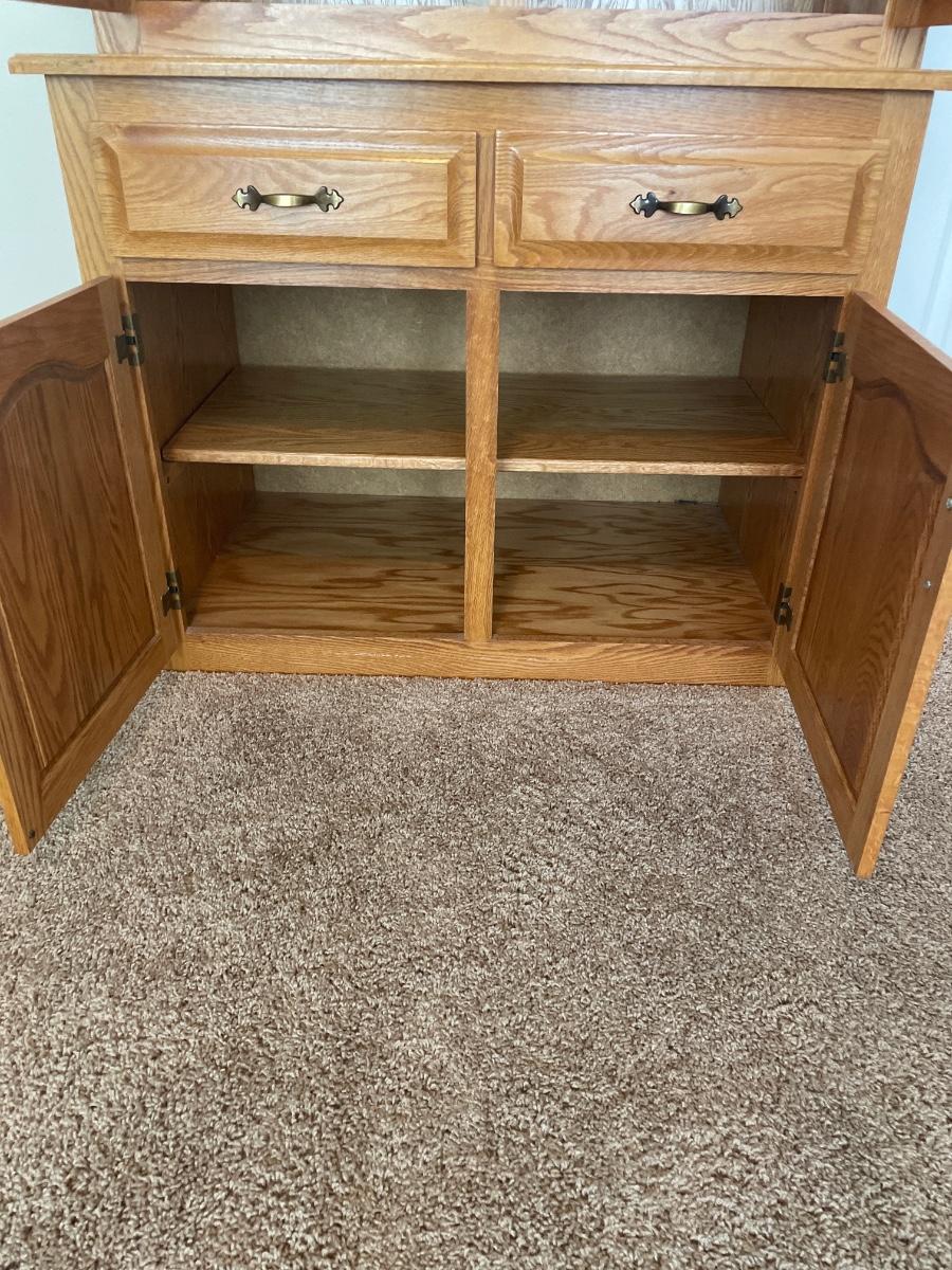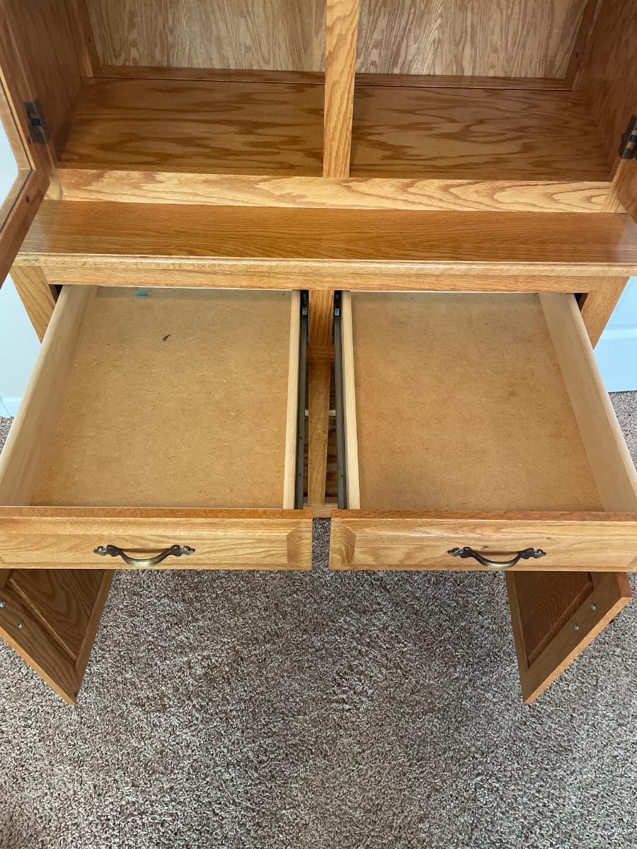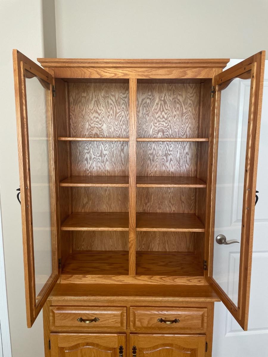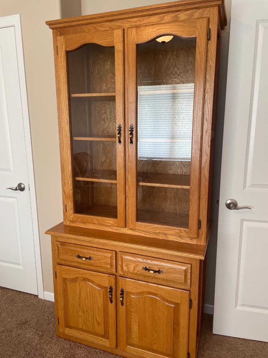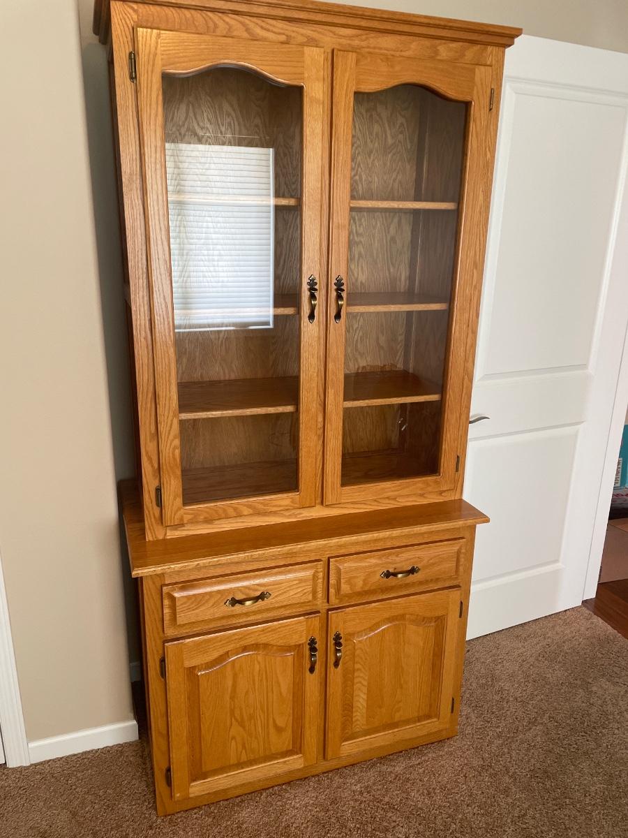 Dimensions are 78” tall x 38” wide x 22” deep. The top section just sits on the bottom portion so no need to bring tools. The top section measures 48” tall x 36” wide x 14” deep and the bottom measures 30” tall x 38” wide x 22” deep. Could not find a maker on this one.