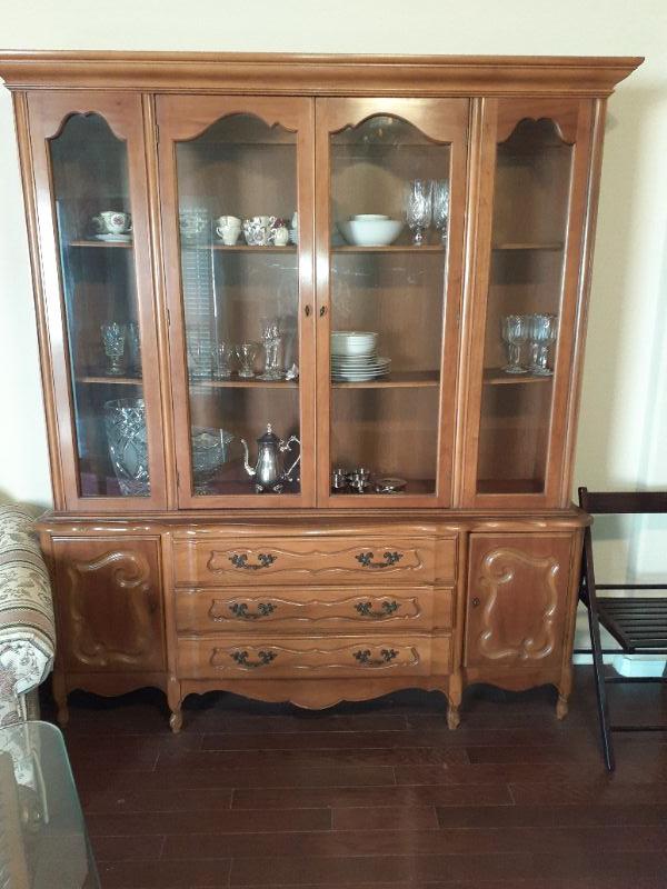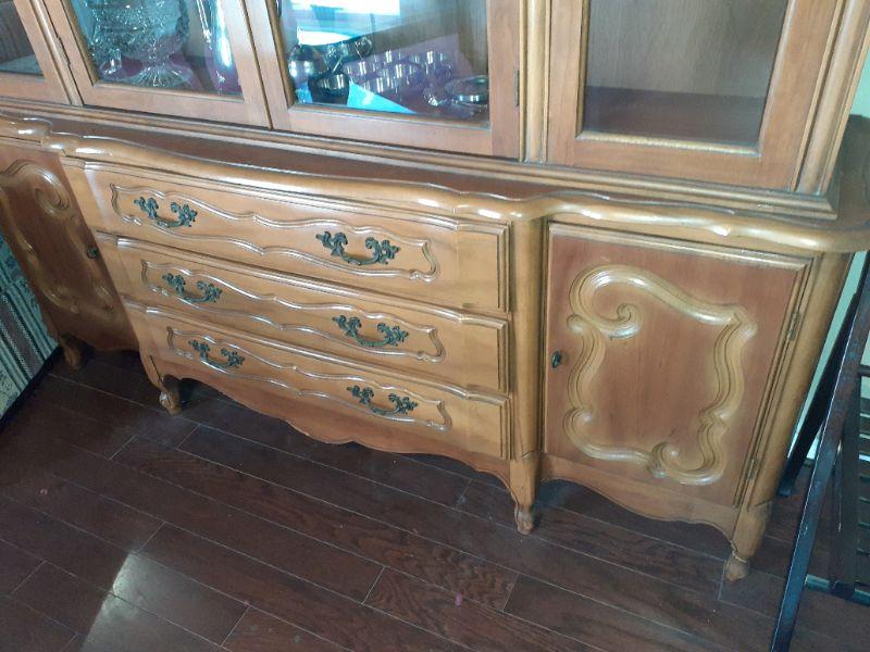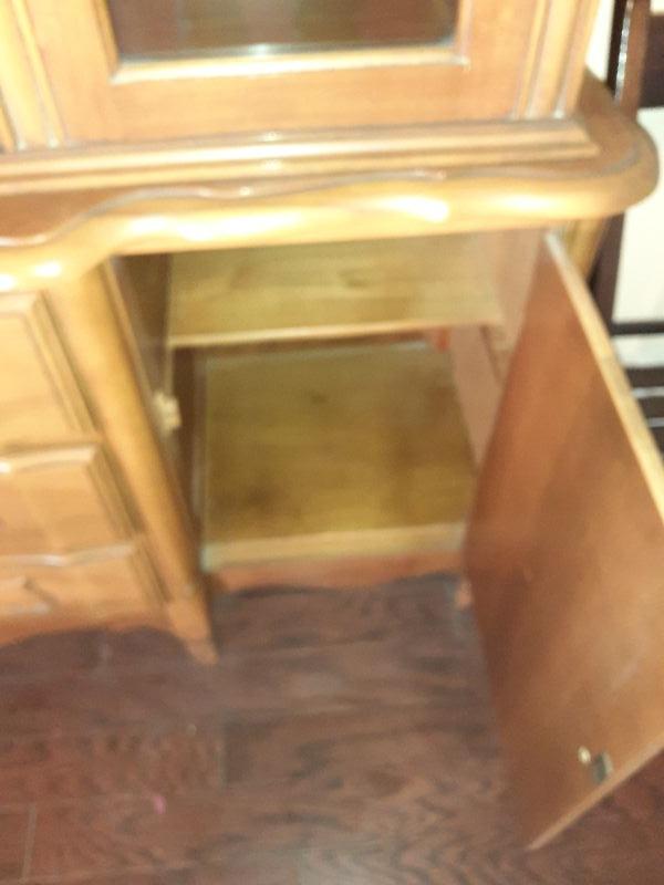 CHINA HUTCH EXCELLENT CONDITION, LIKE NEW MEASURES 6'w and 7' tall 20" d and top is 18" d AND HAS 3 DRAWERS AND TWO DOOR STORAGE AREAS,