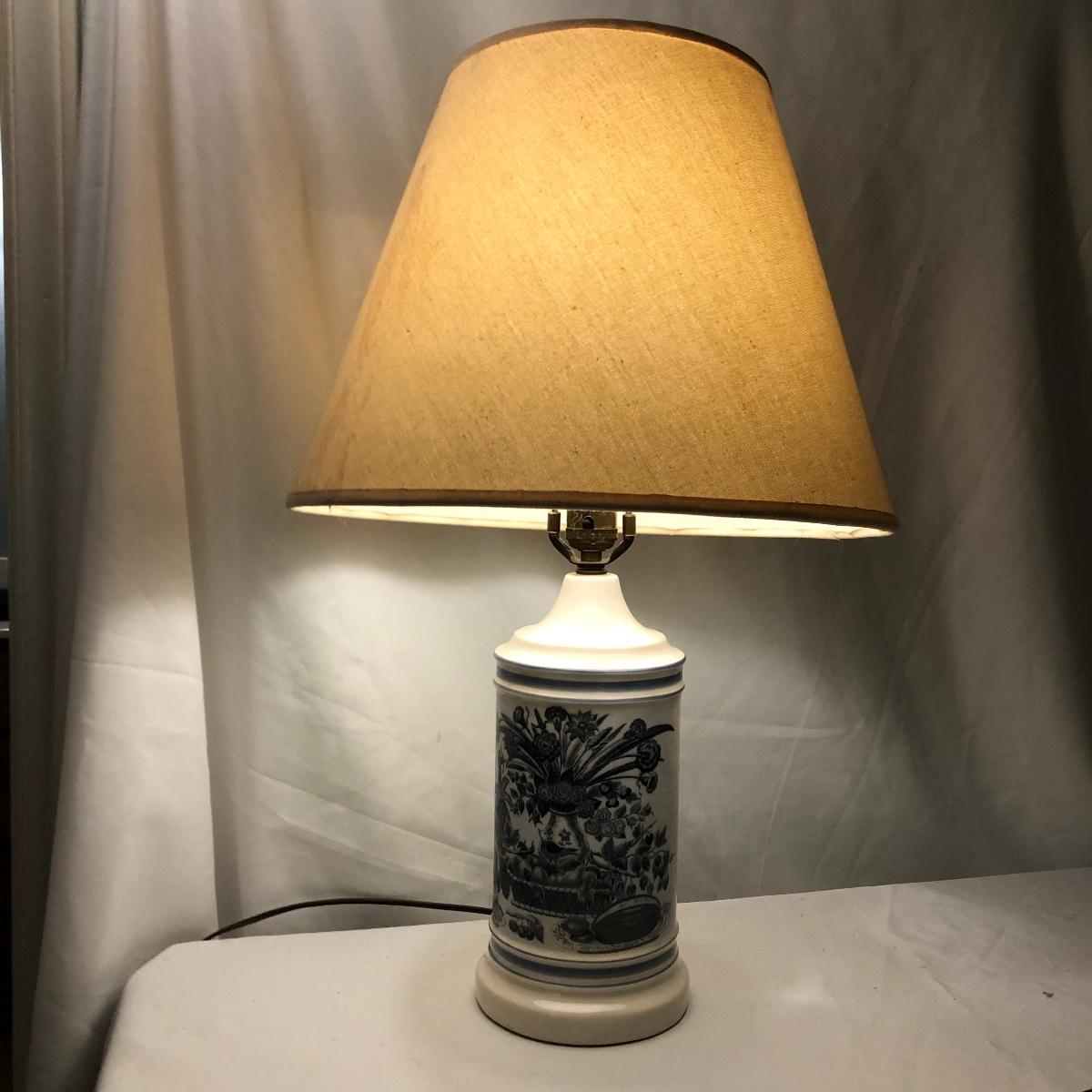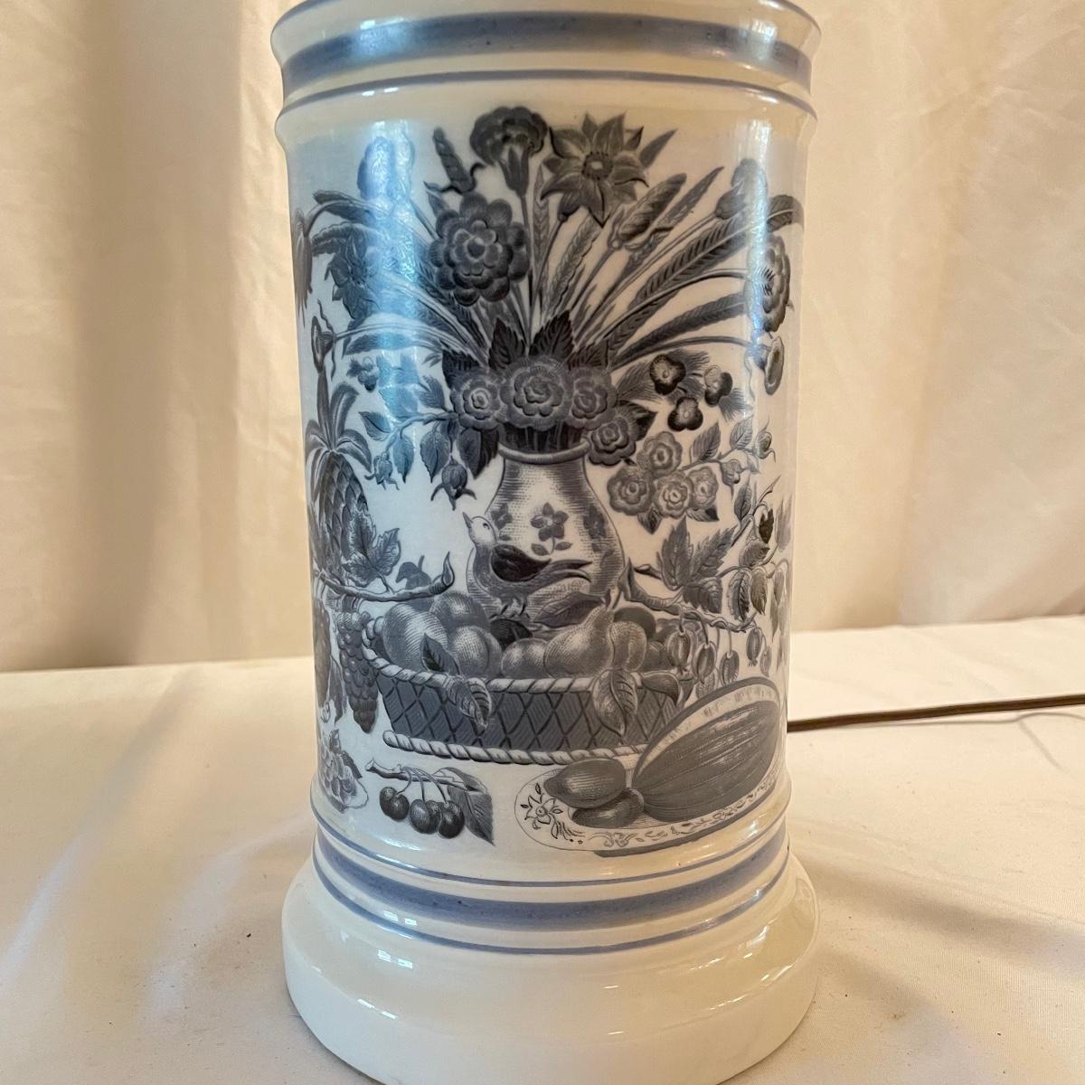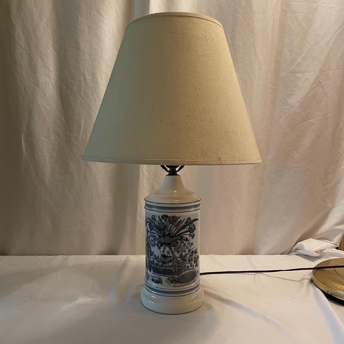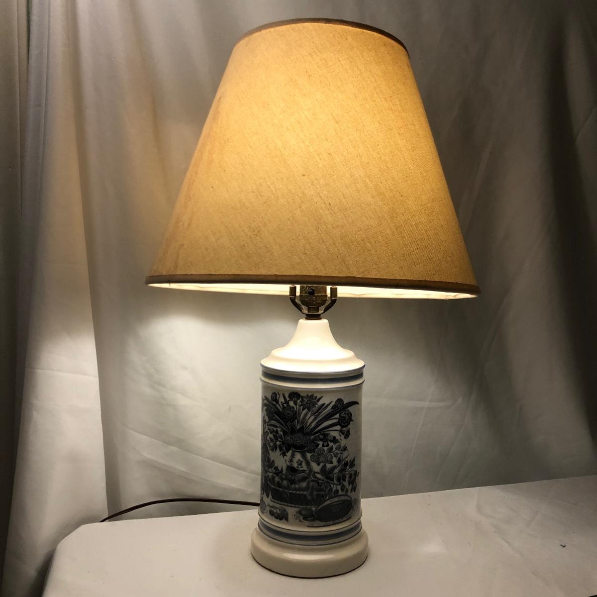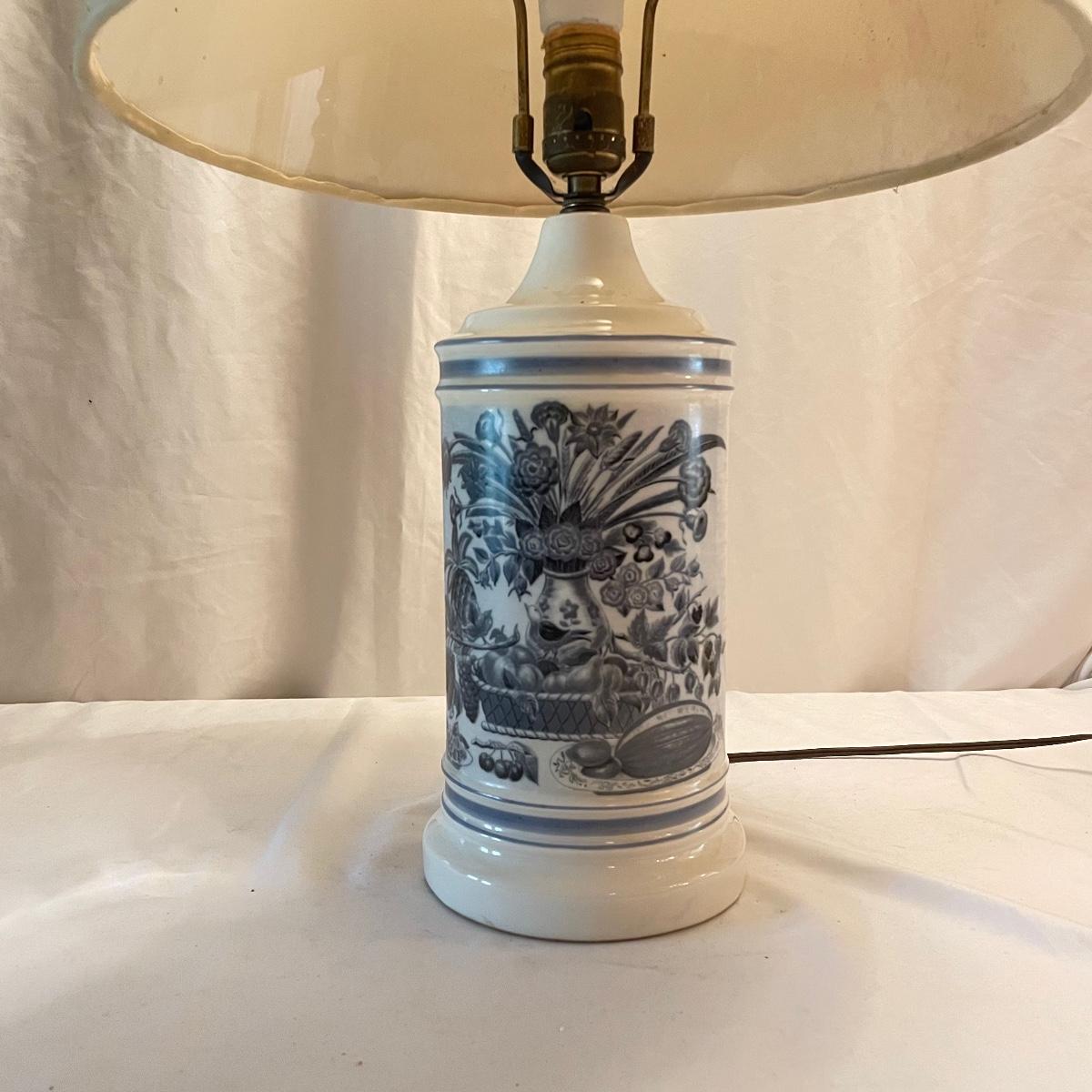 This mid sized China lamp has a pretty grey blue floral and fruit design on a cream background. The linen colored lamp shade is included.