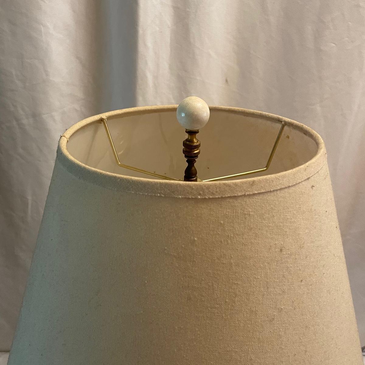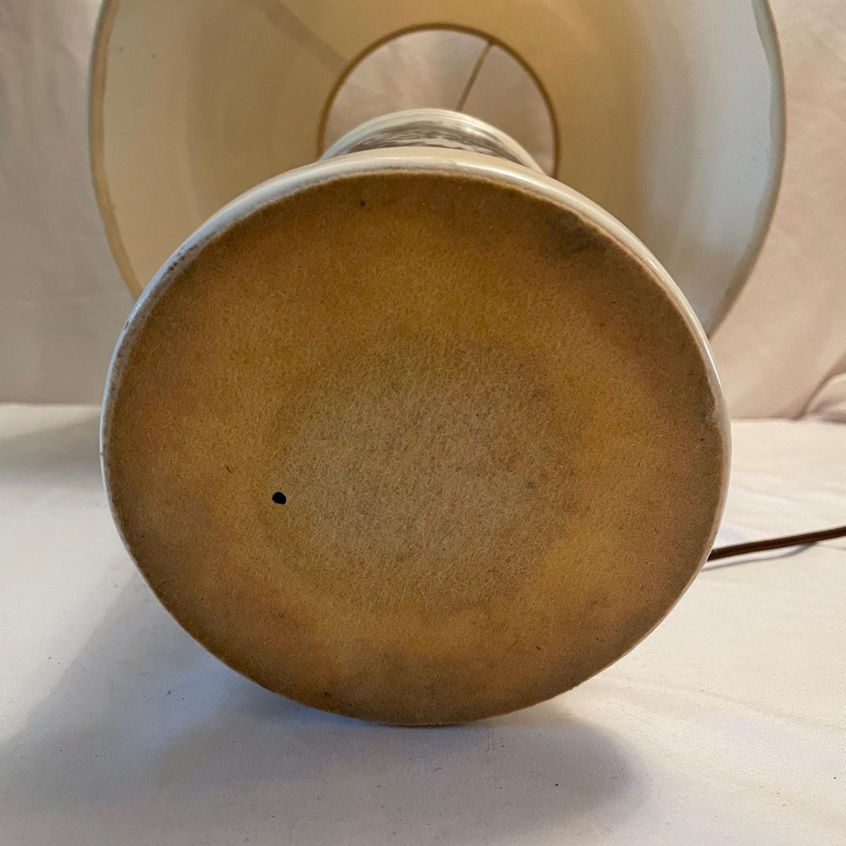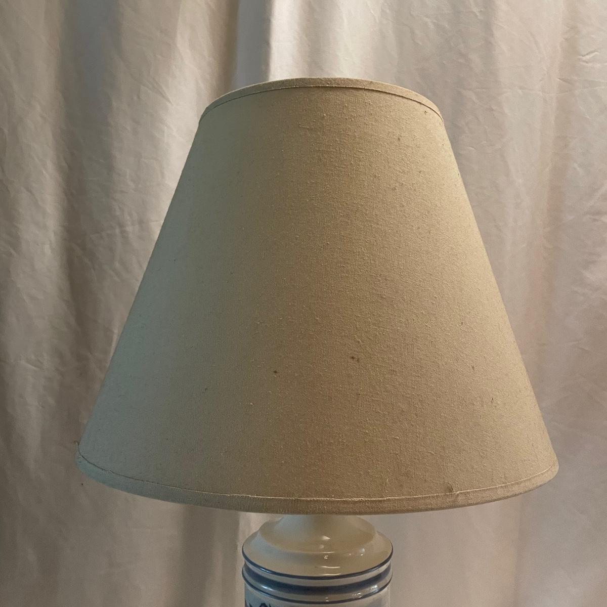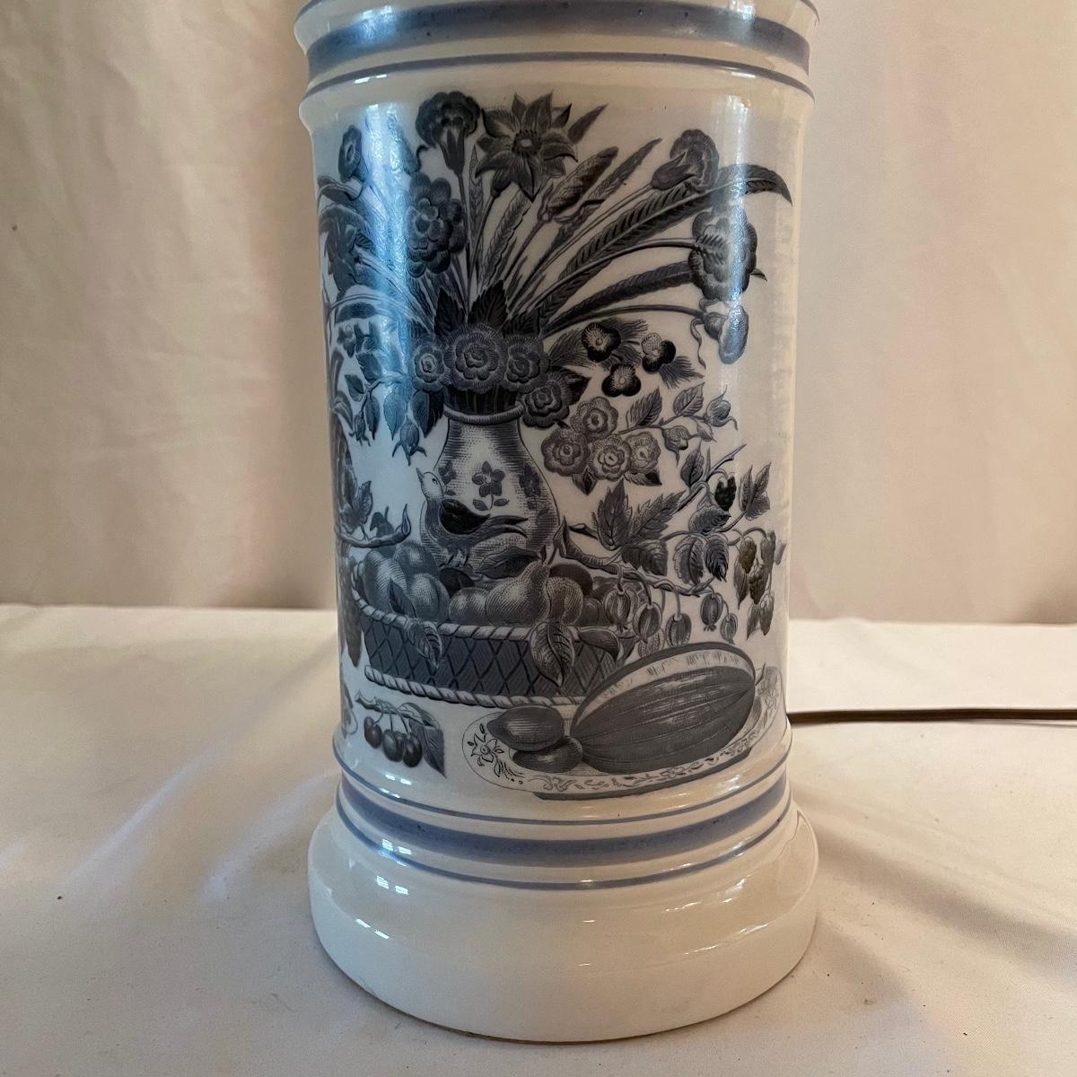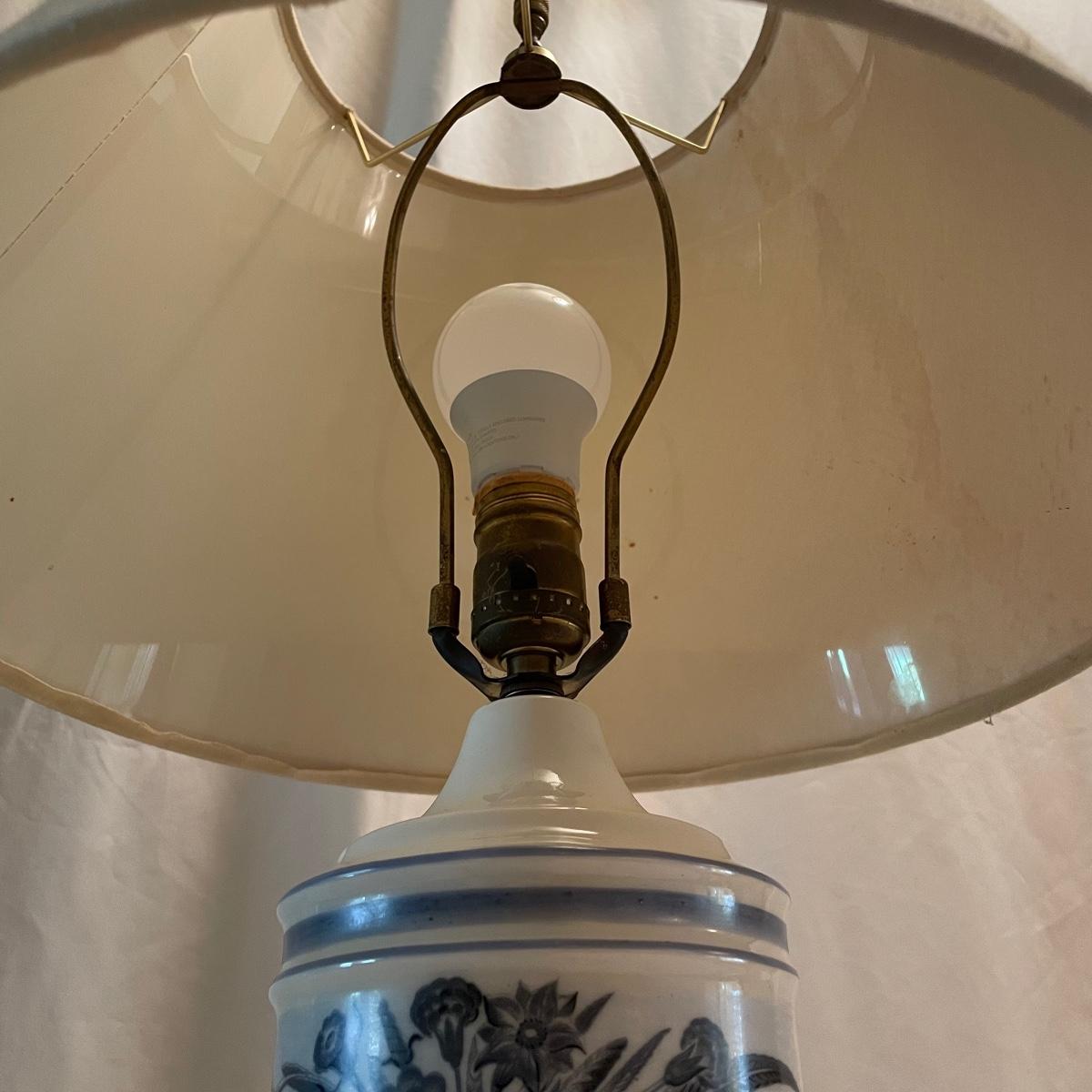 This mid sized China lamp has a pretty grey blue floral and fruit design on a cream background. The linen colored lamp shade is included.