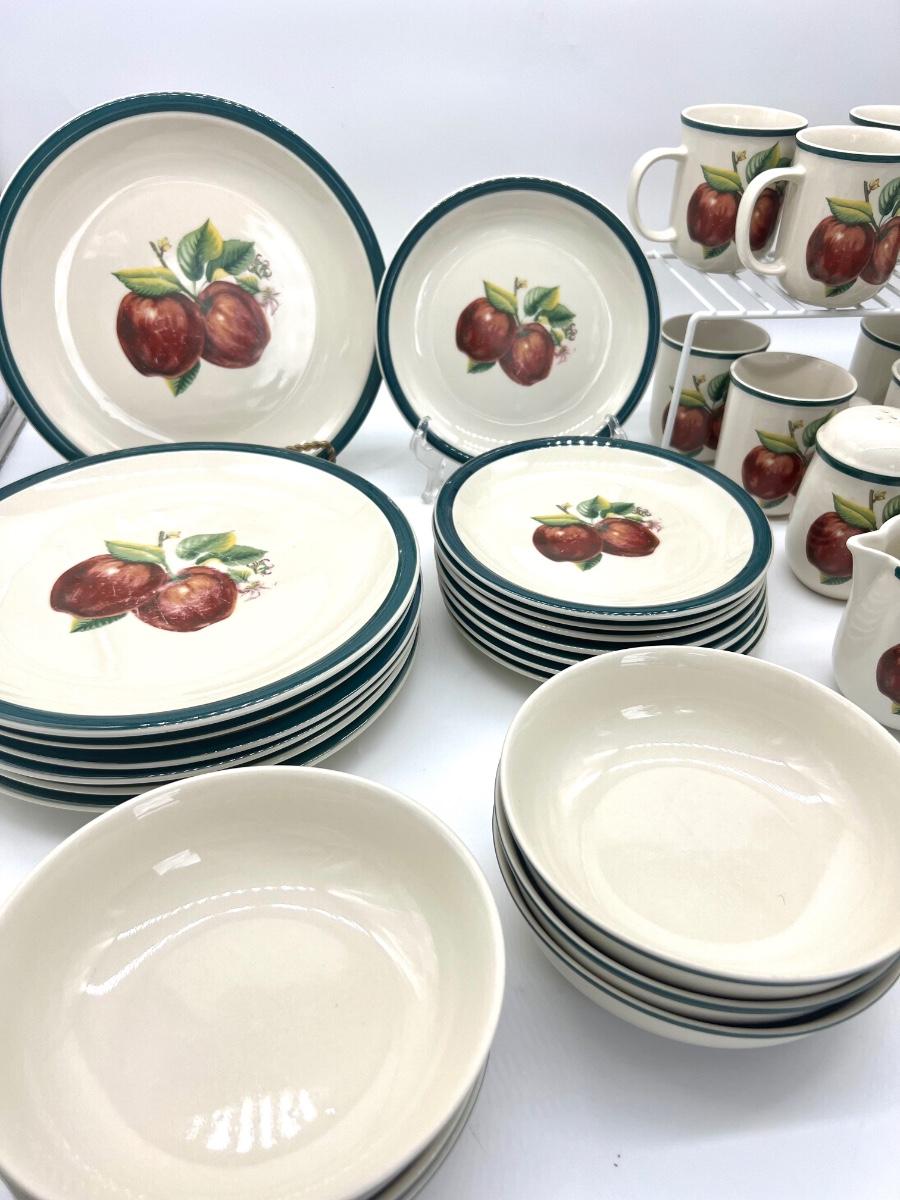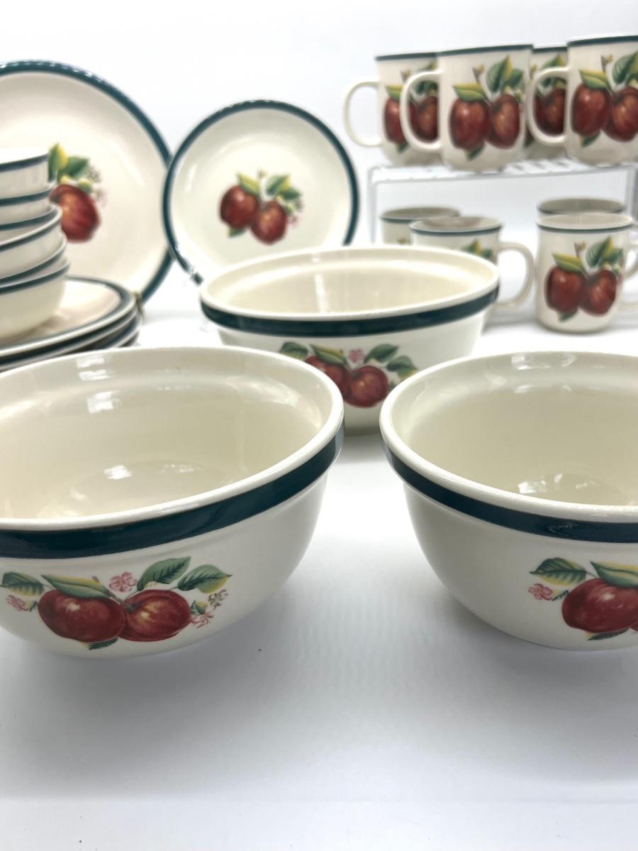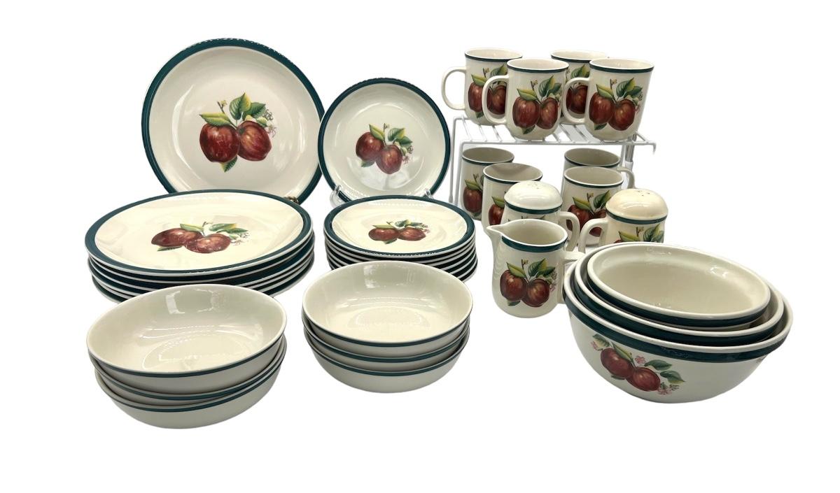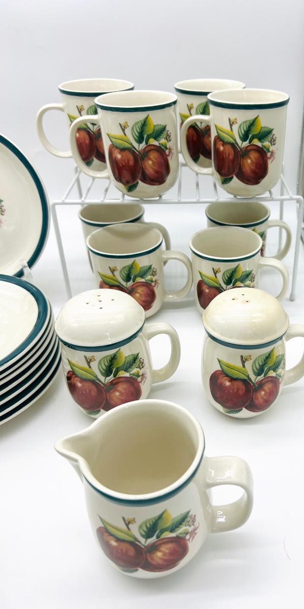 CHINA PEARL Stoneware Casuals APPLES, - 38 total pieces. 8 small plates, 7 dinner plates, 6 Bowls. 11 Coffee cups, Creamer pitcher, three-piece mixing bowl set, and salt /pepper shaker. Some show signs of use and could use a cleaning on the back side.