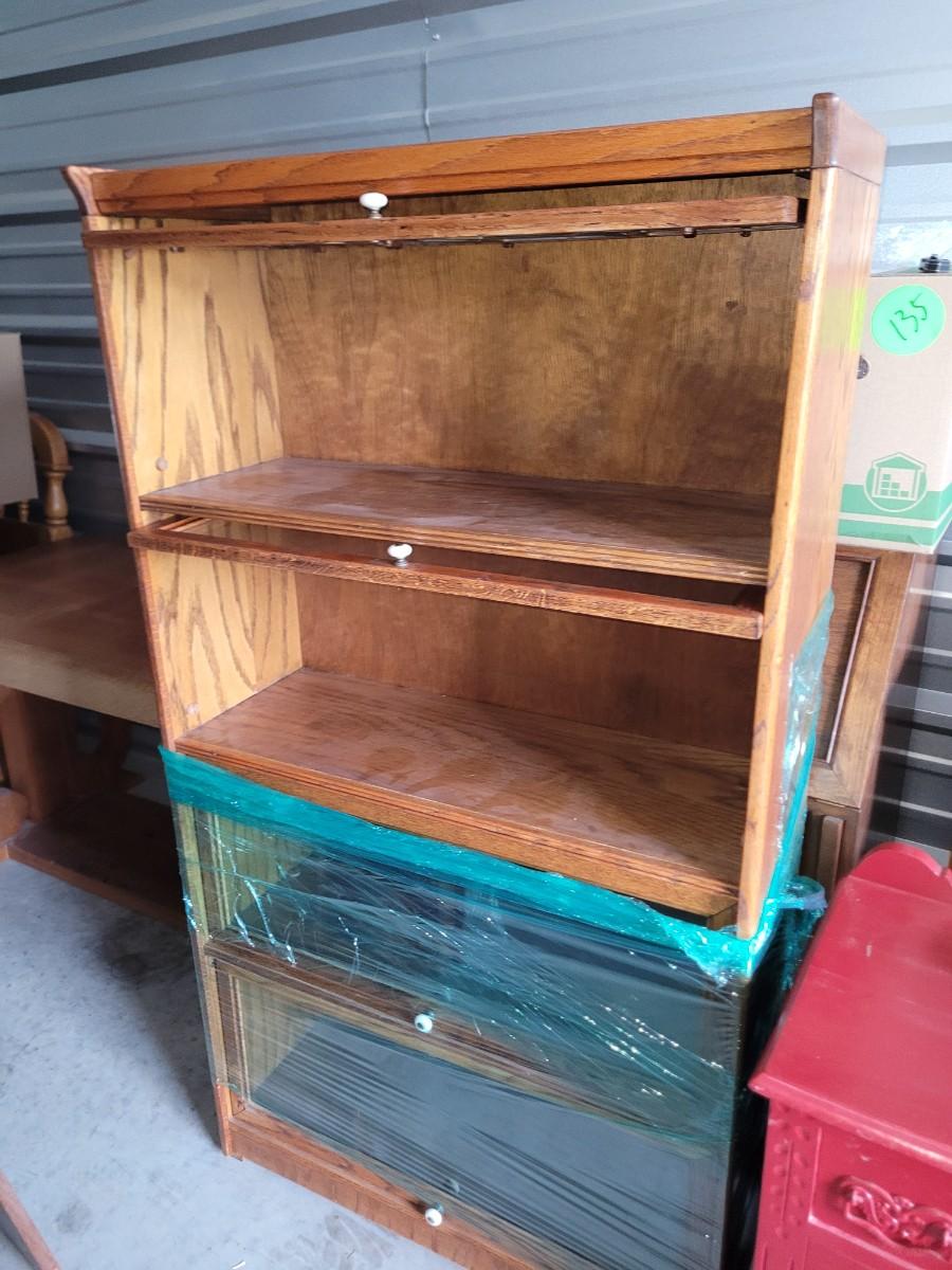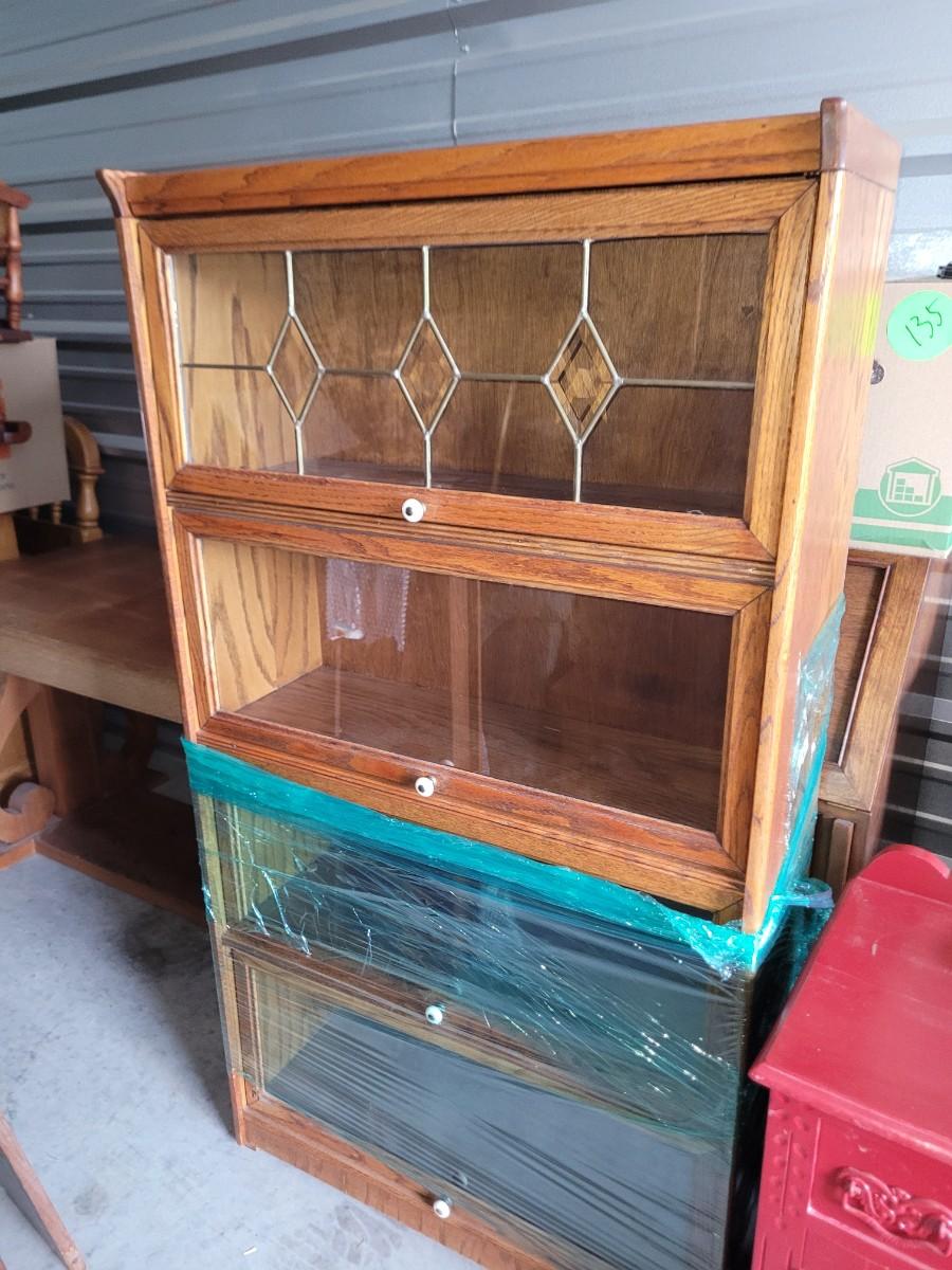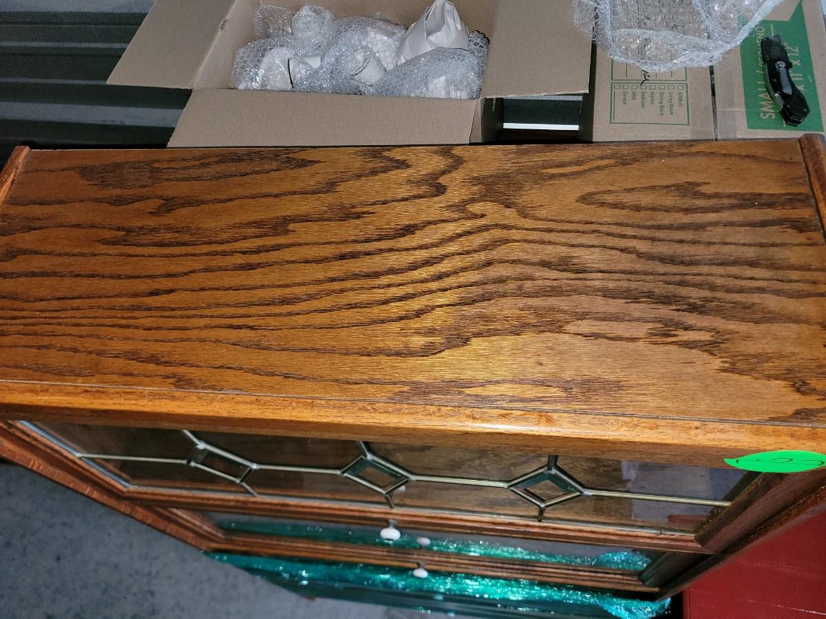 Hutch is partially wrapped and will be fully wrapped again for protection. It seems not to have a mark on it, only the top cabinet has the leaded glass, but all lift up and slide back.