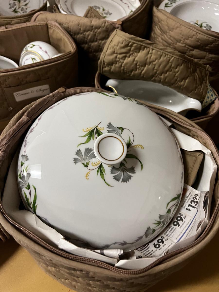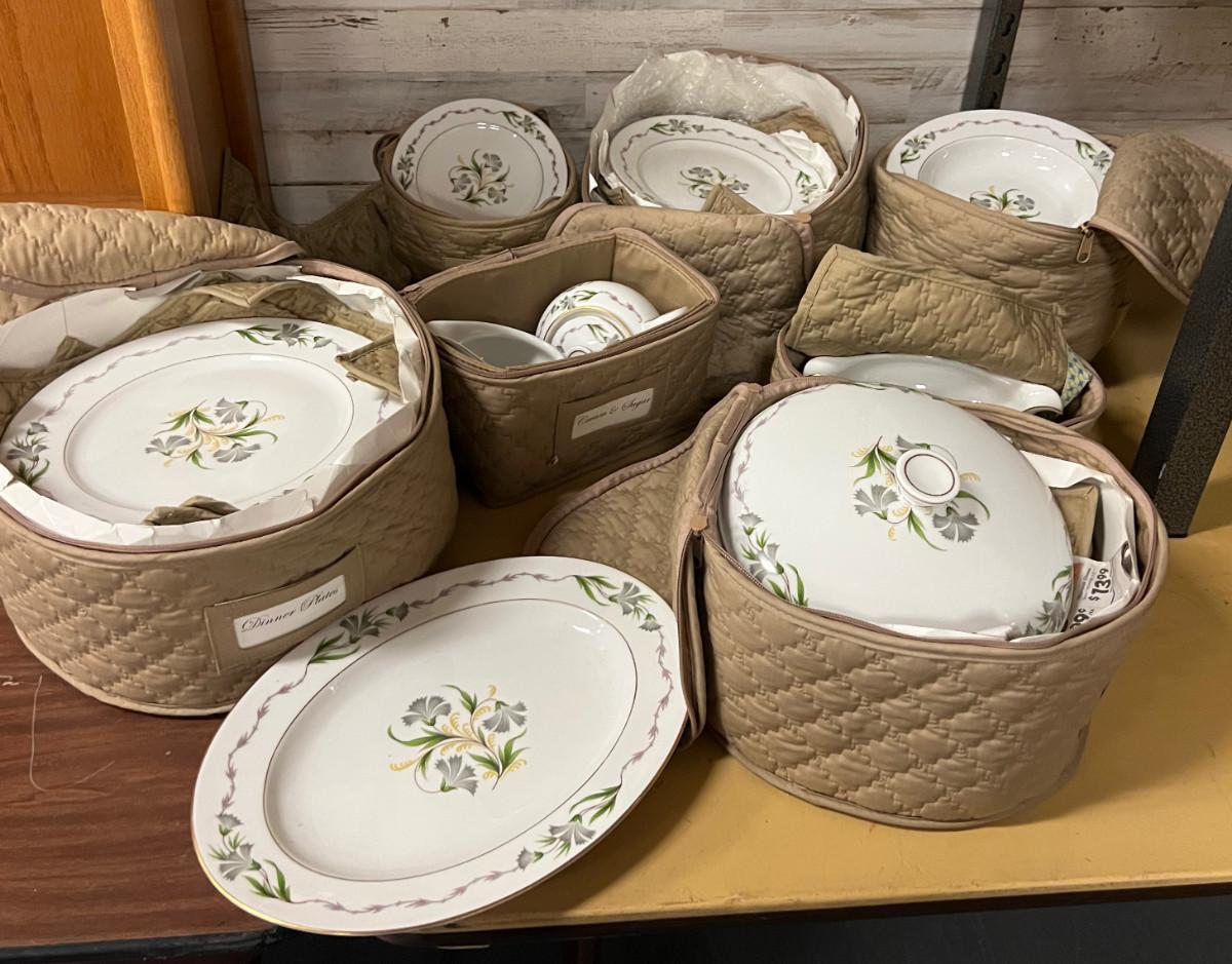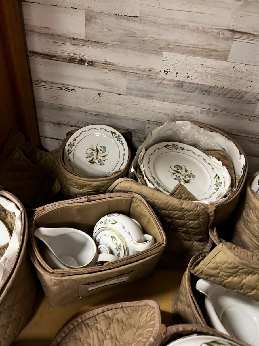 NICE China, Good Condition with Storage Covers. Service for 8 Dinner Plates, Salad, Soup Bowl and Bread and butter Plates Gravy Boat Platter, Covered Serving, Cream and Sugar Classic / Traditional Serving. Perfect for Sunday Dinner, Hosting A lovely friends dinner, or Holidays of all nature. NO Shipping.