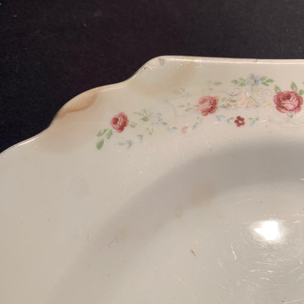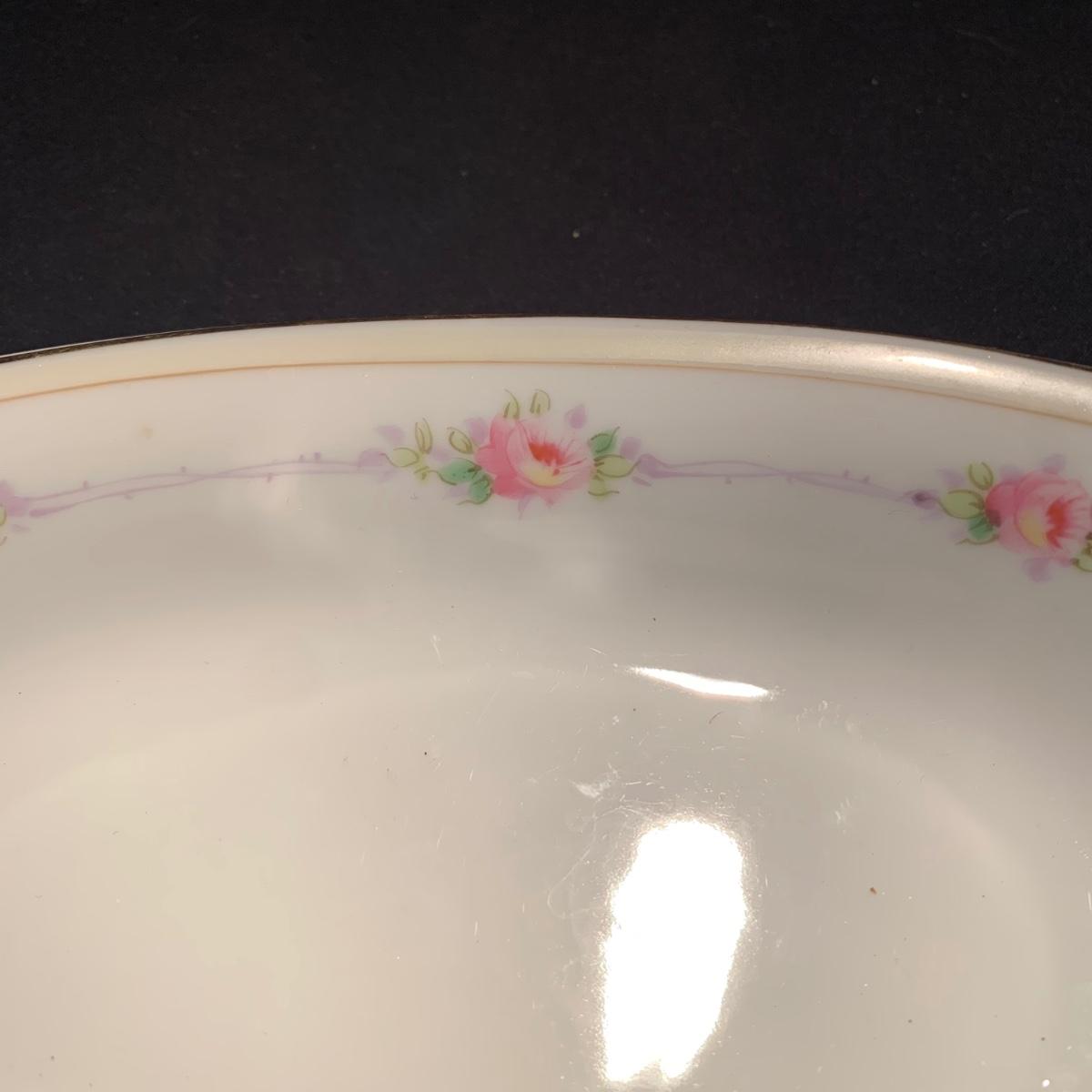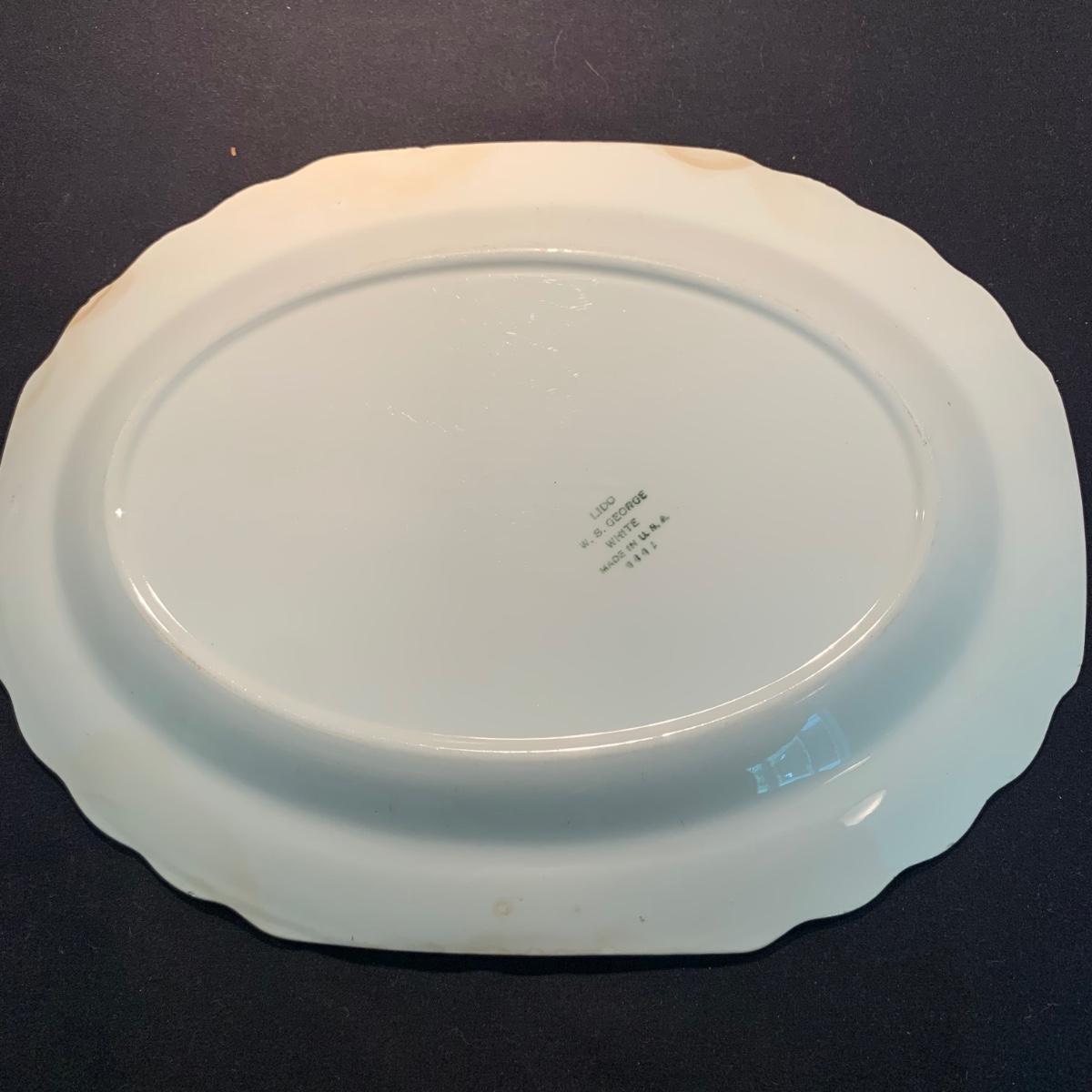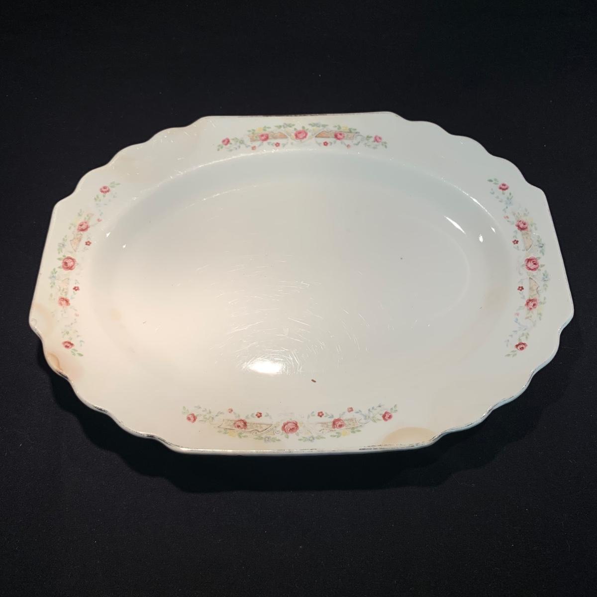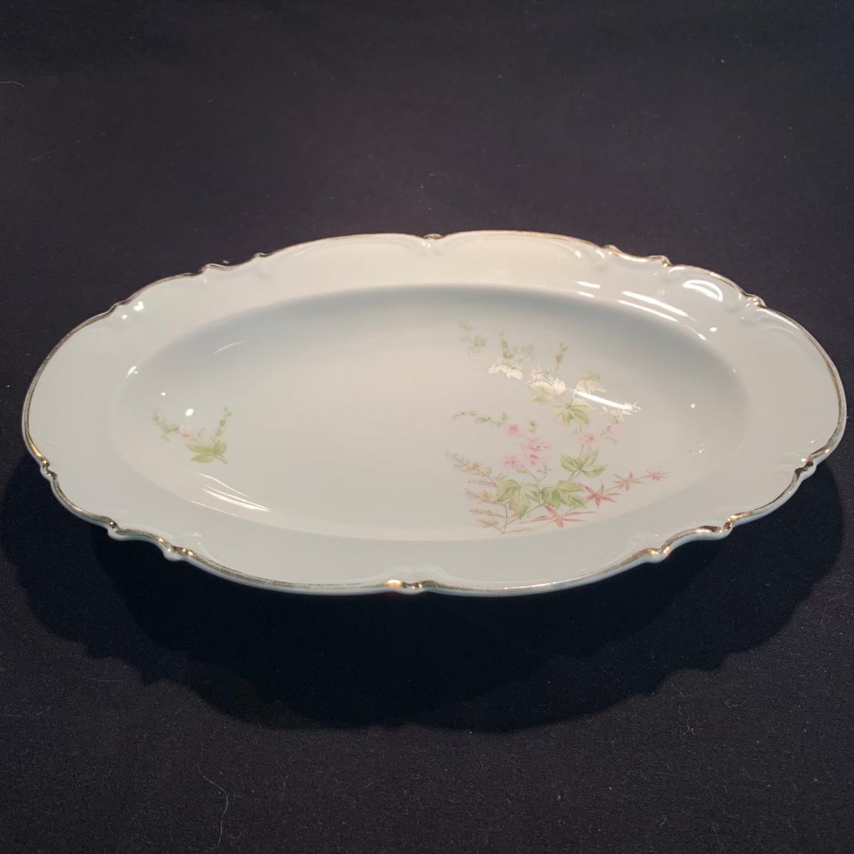 This lot includes a mix of single china dishes. Included are different serving trays, bowls, plates, a teapot, and more. One of the trays has some brown discoloration and one of the bowls has crack in it (see photos). Theo other items appear to be in good condition. The largest piece measures about 12in x 9in. Shipping available.