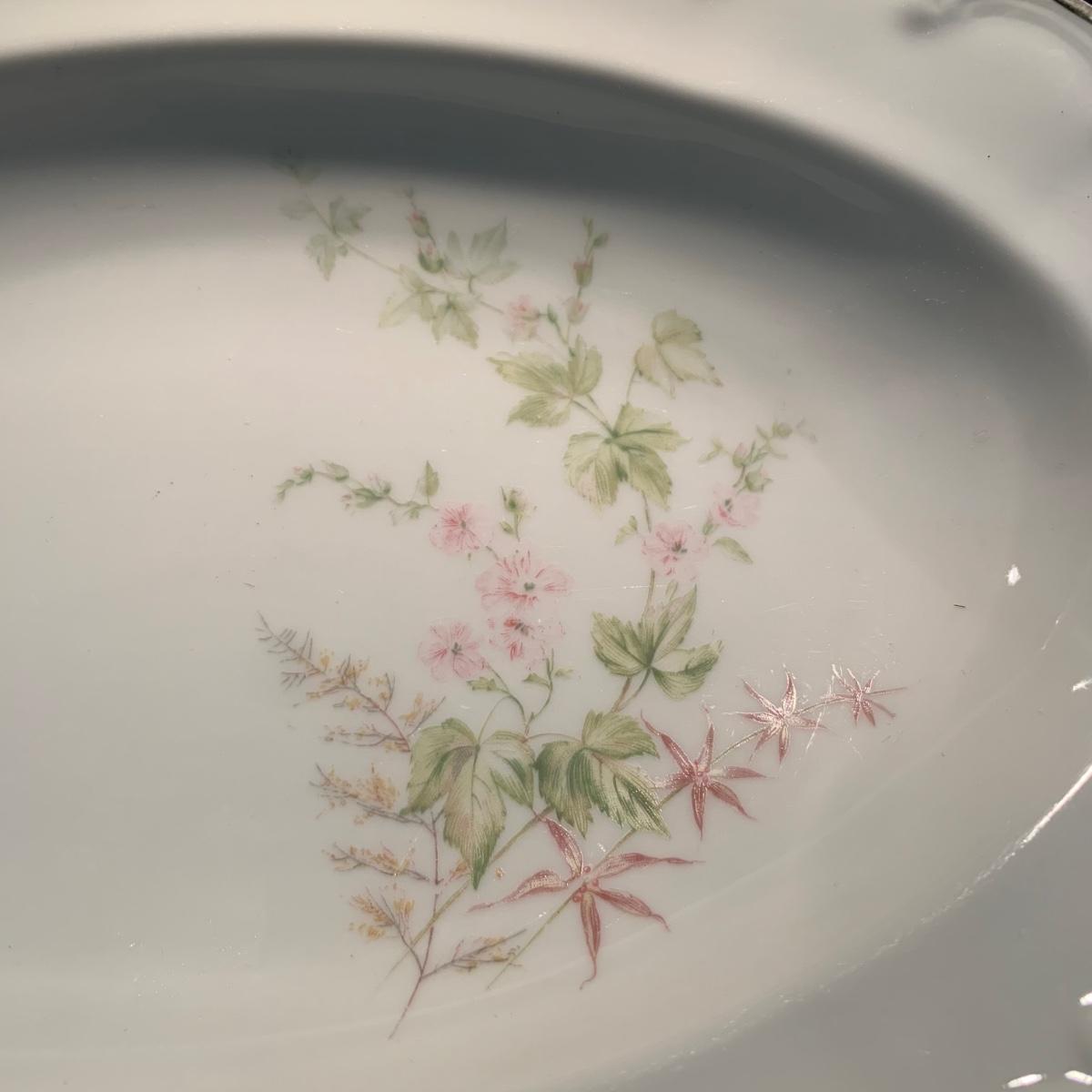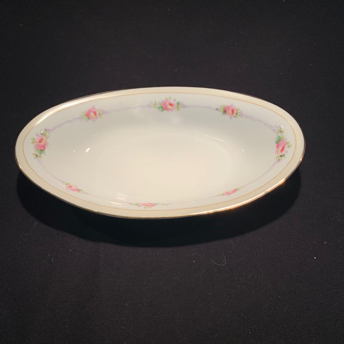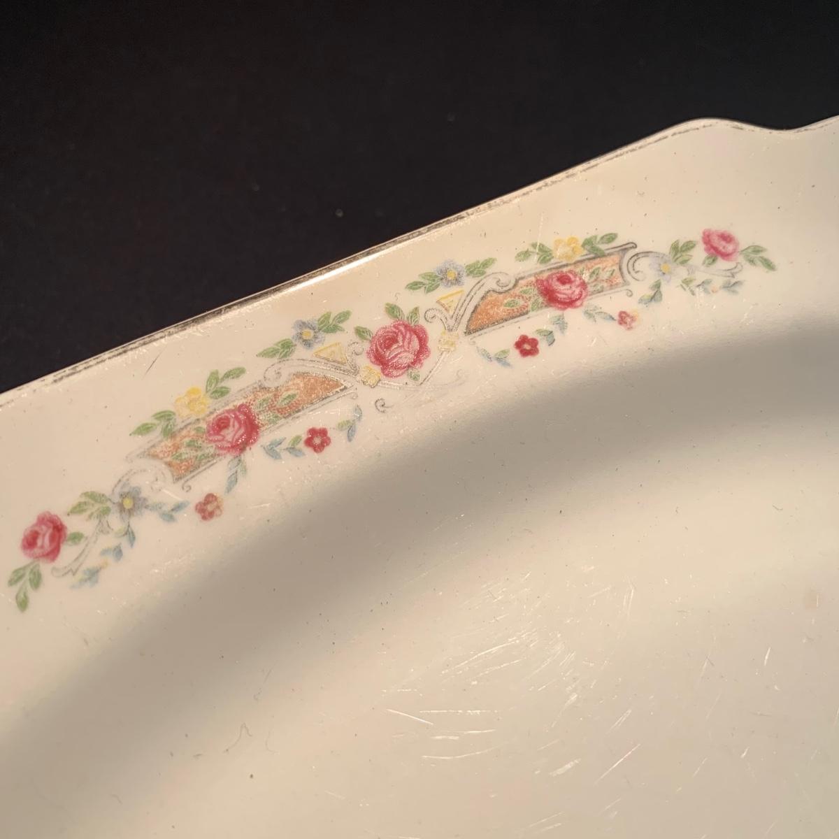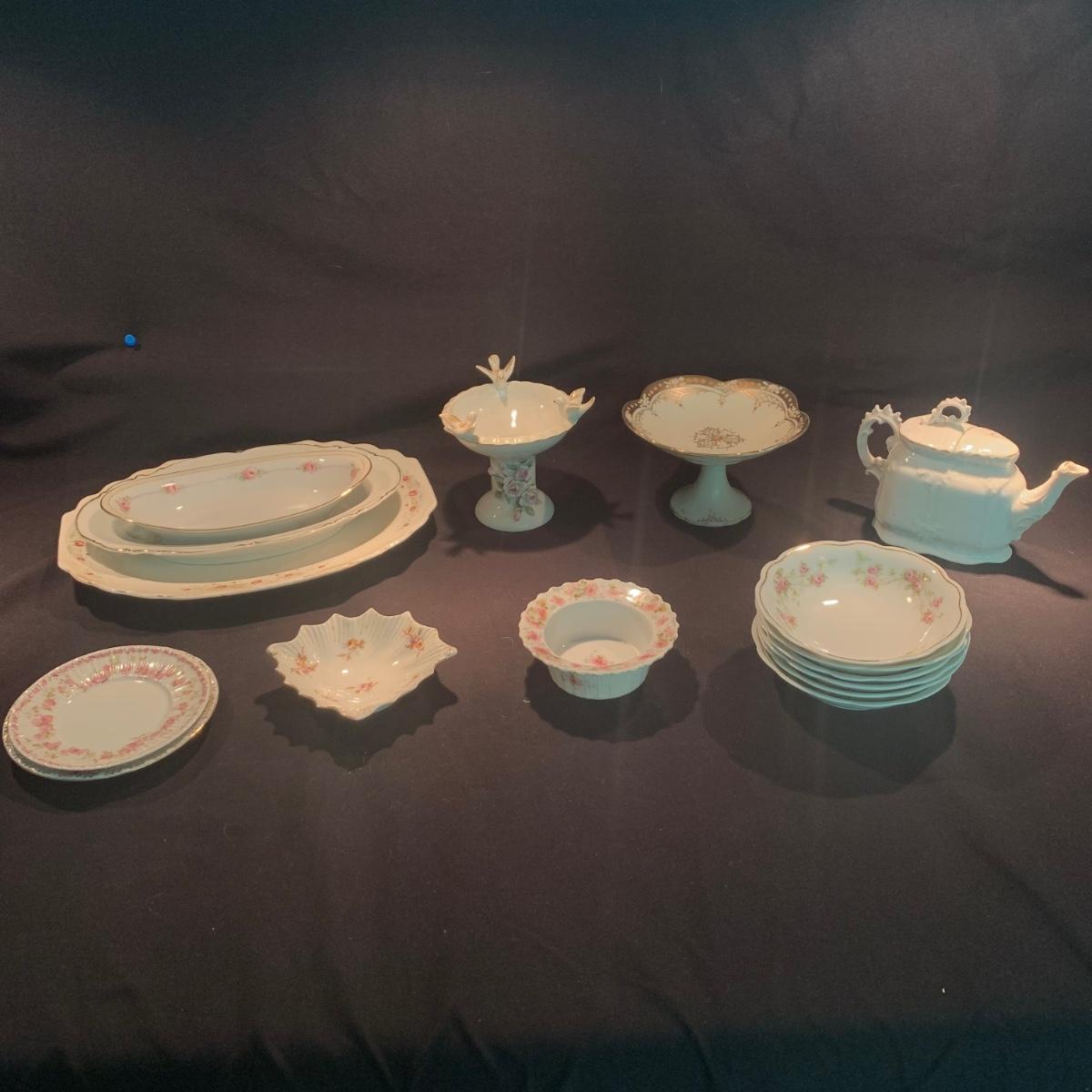 This lot includes a mix of single china dishes. Included are different serving trays, bowls, plates, a teapot, and more. One of the trays has some brown discoloration and one of the bowls has crack in it (see photos). Theo other items appear to be in good condition. The largest piece measures about 12in x 9in. Shipping available.