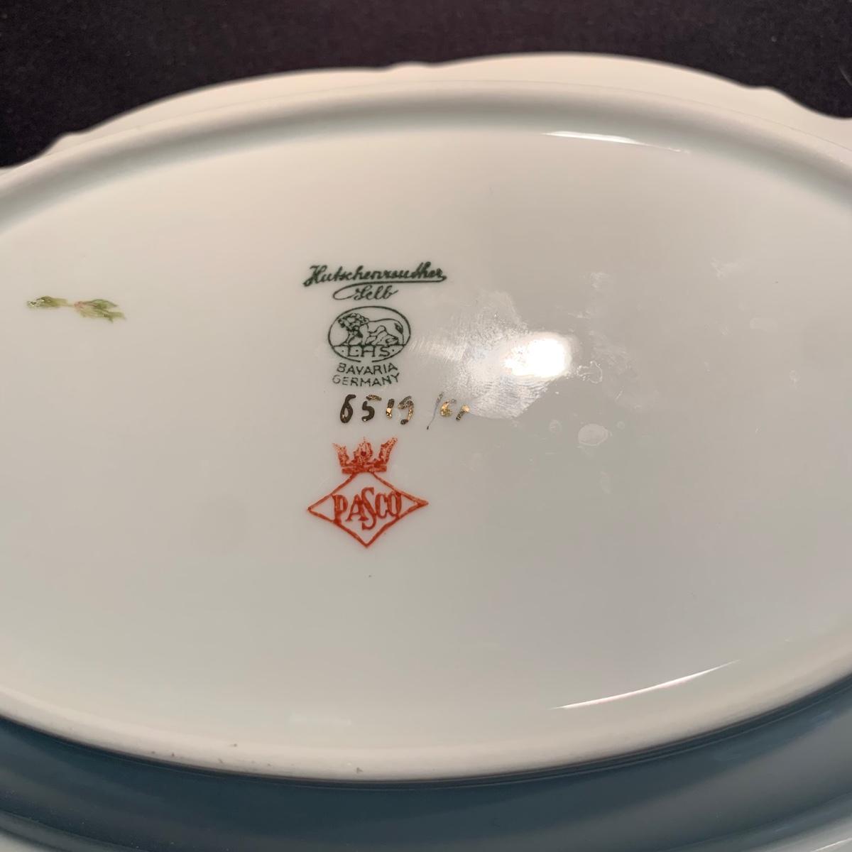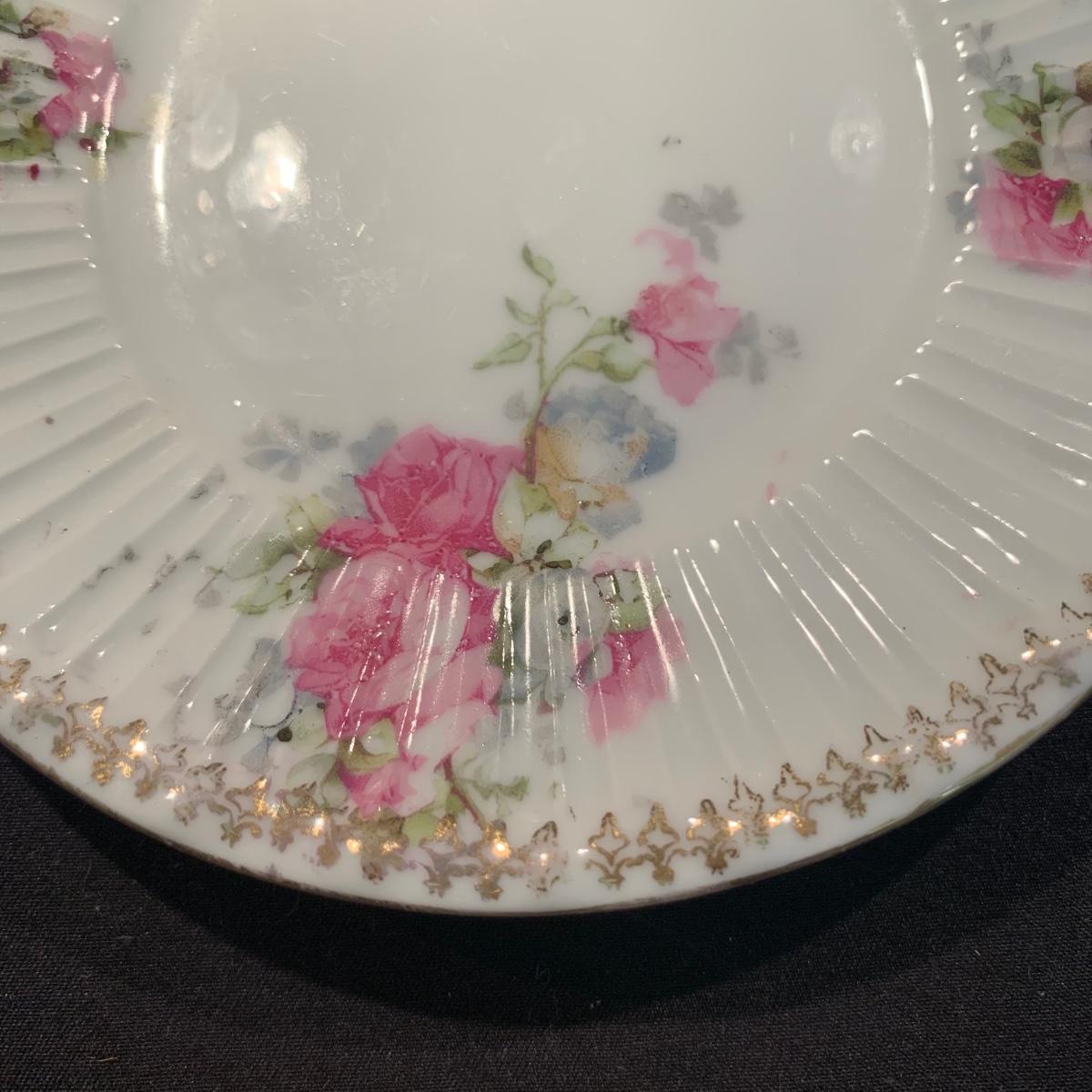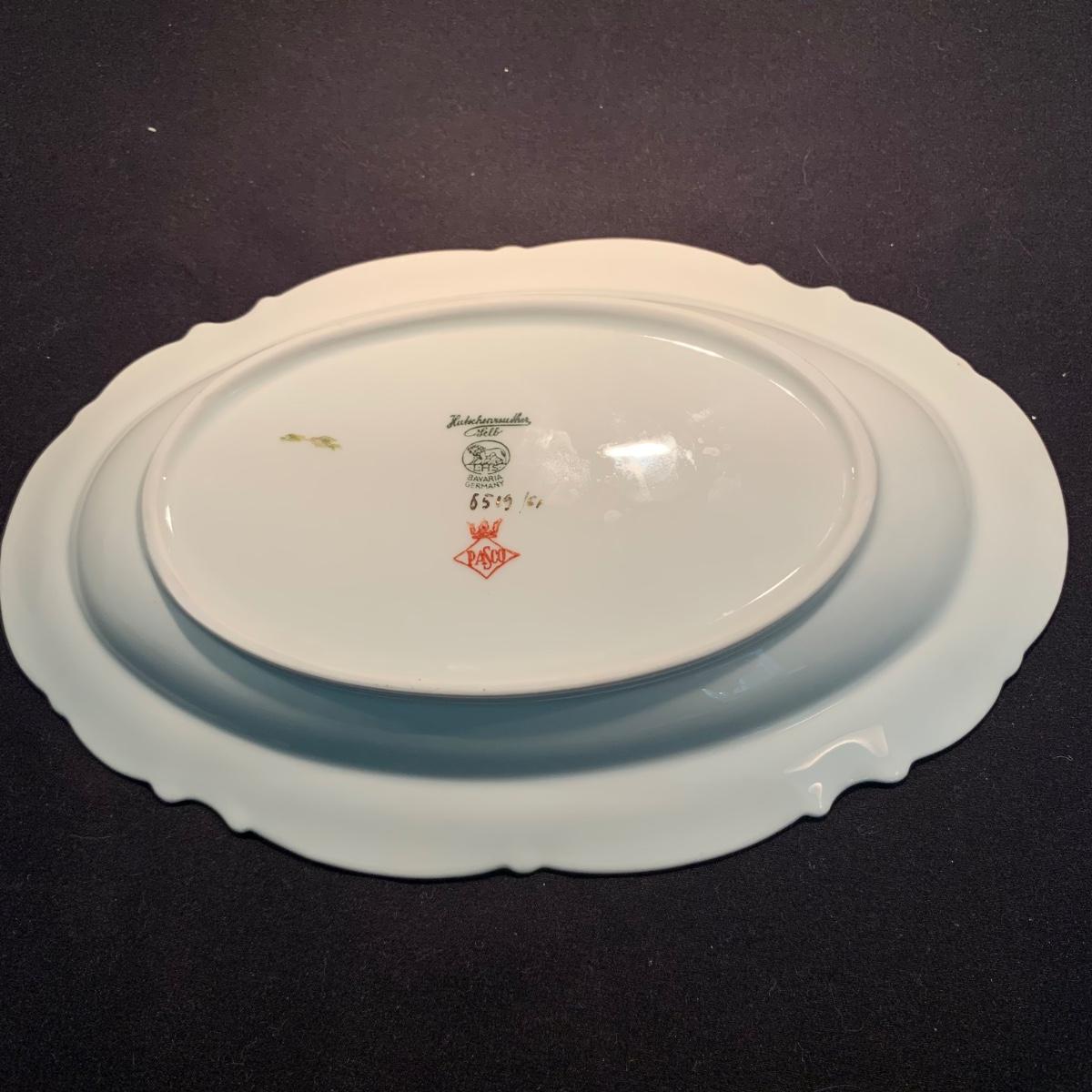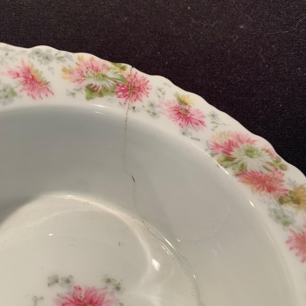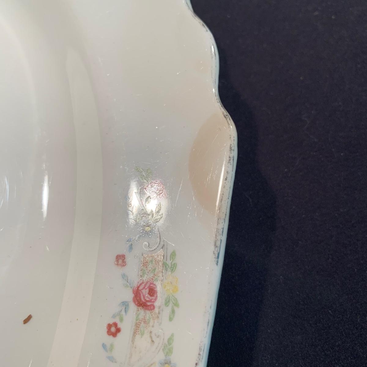 This lot includes a mix of single china dishes. Included are different serving trays, bowls, plates, a teapot, and more. One of the trays has some brown discoloration and one of the bowls has crack in it (see photos). Theo other items appear to be in good condition. The largest piece measures about 12in x 9in. Shipping available.