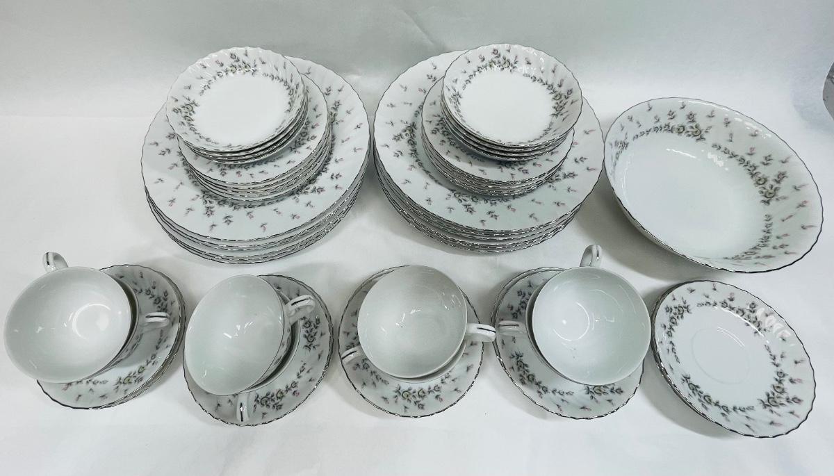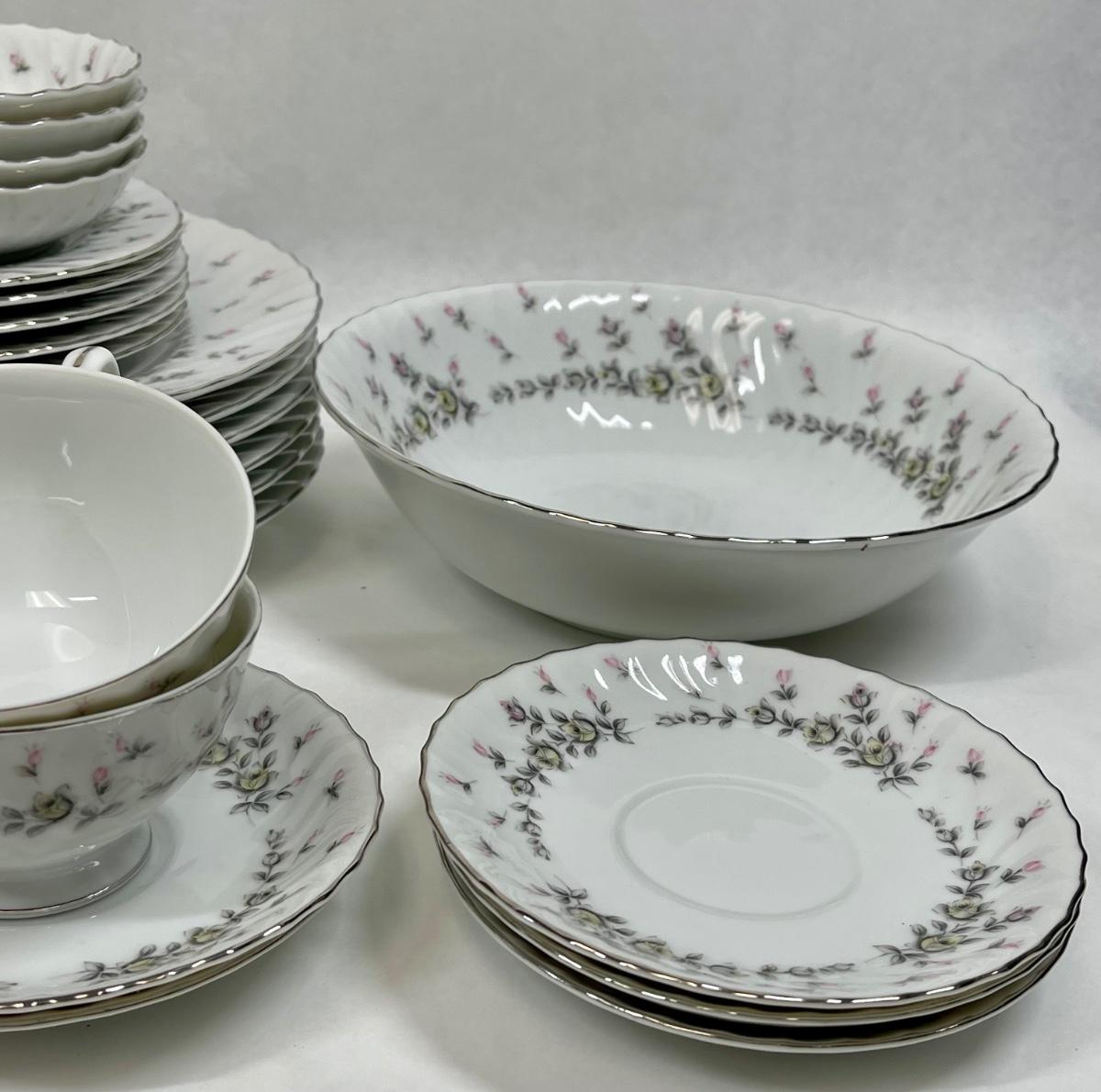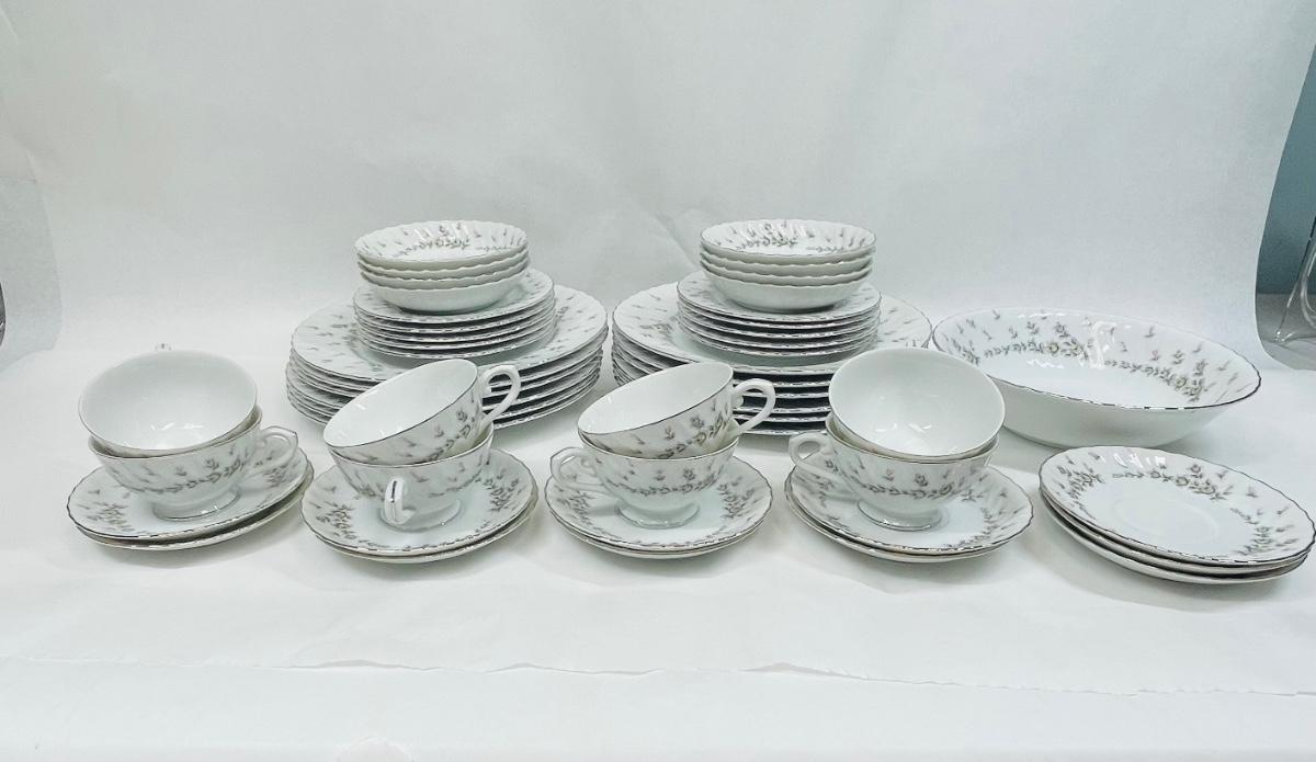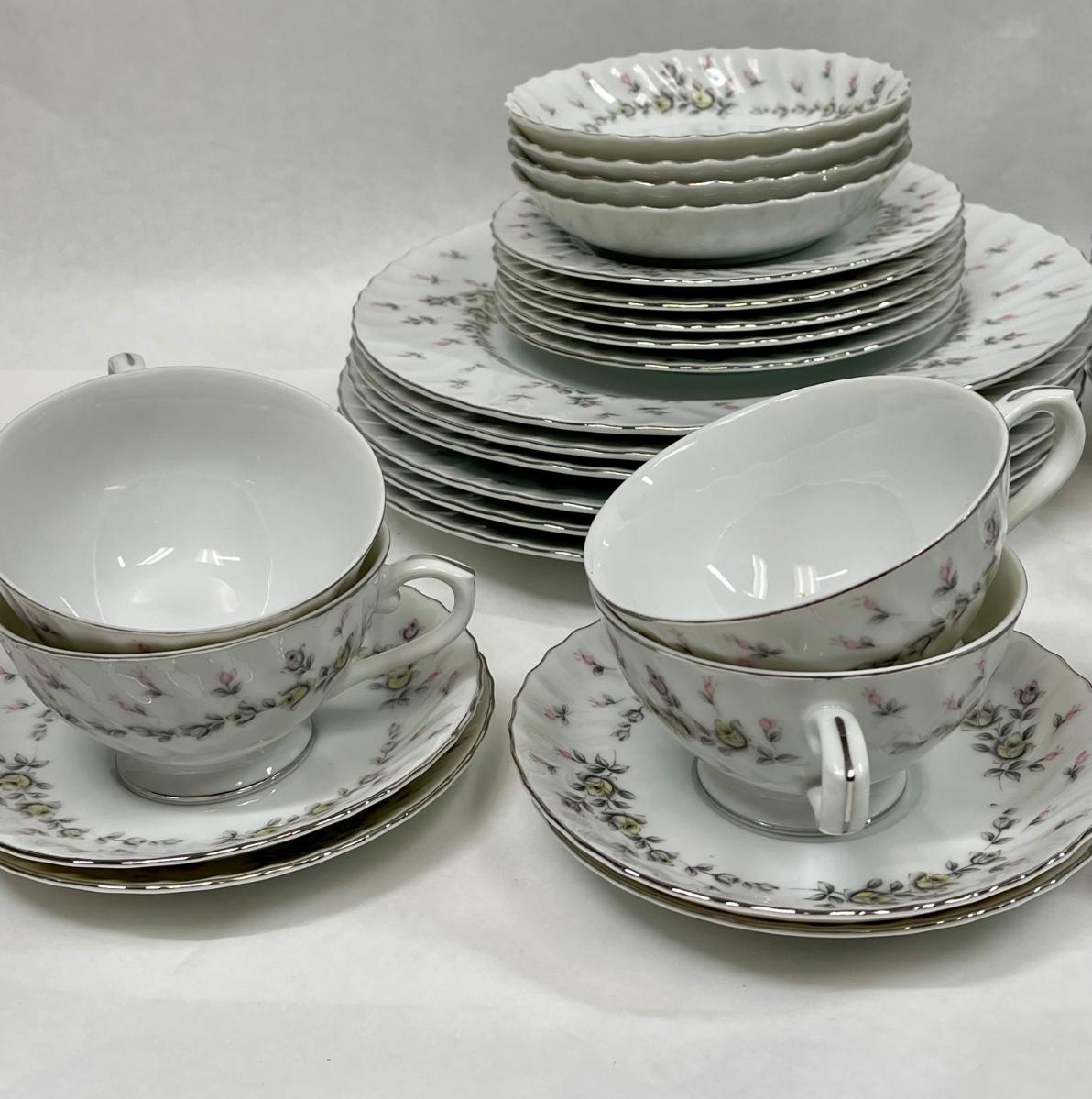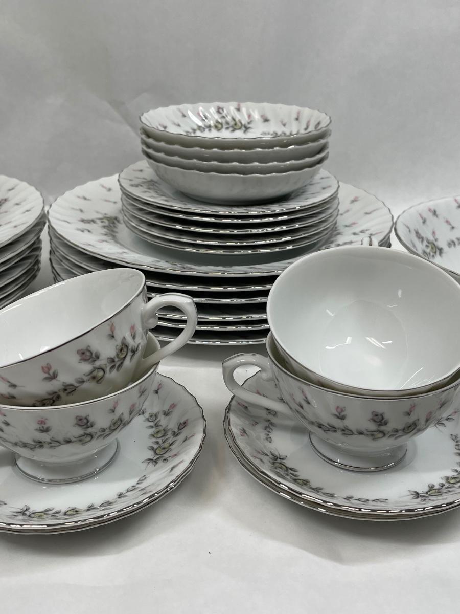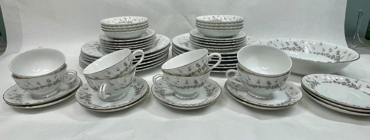 Includes (12) dinner plates, (10) bread plates, (8) bowls, (8) teacups, (9) saucers