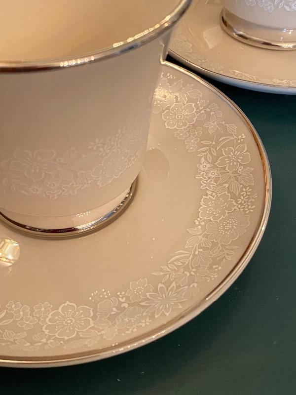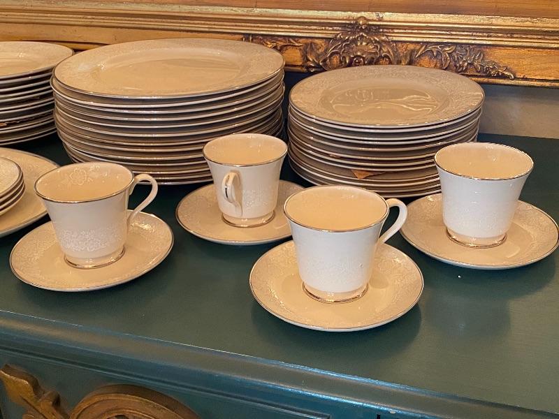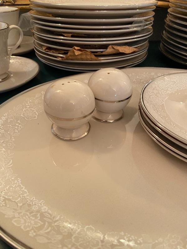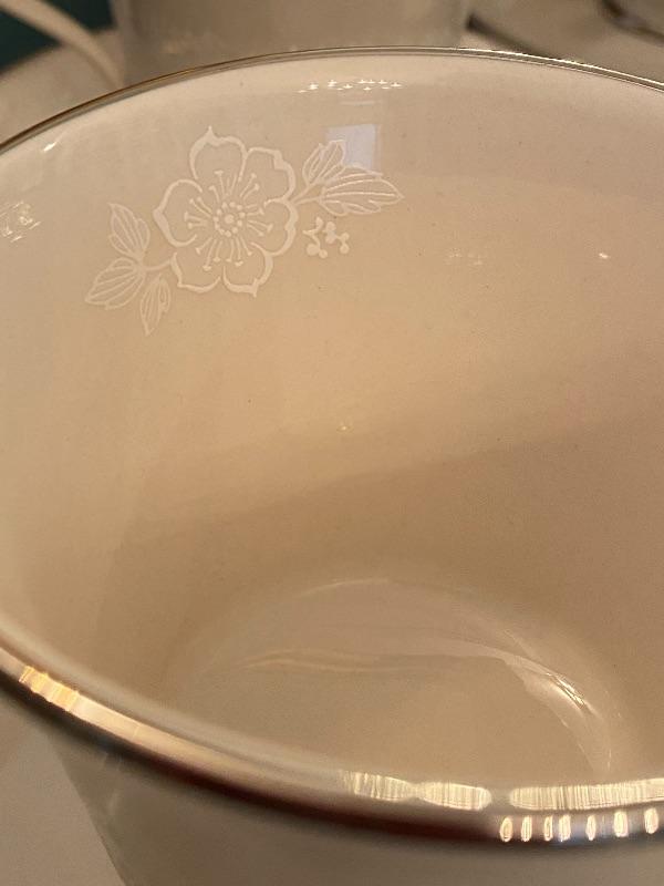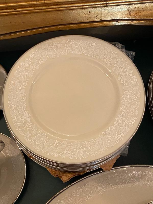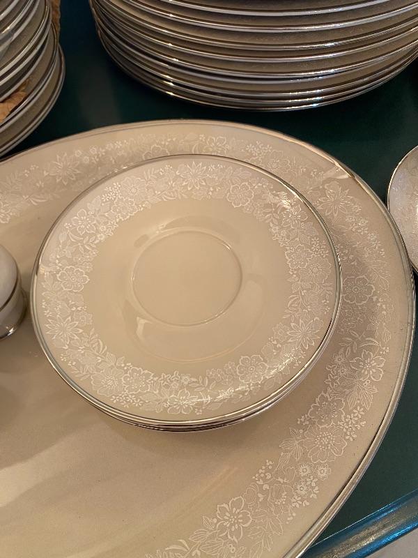 Beautiful Gorham china in Bridal Bouquet. Light almond beige with a white floral pattern, platinum edge. Included in this set is as follows: