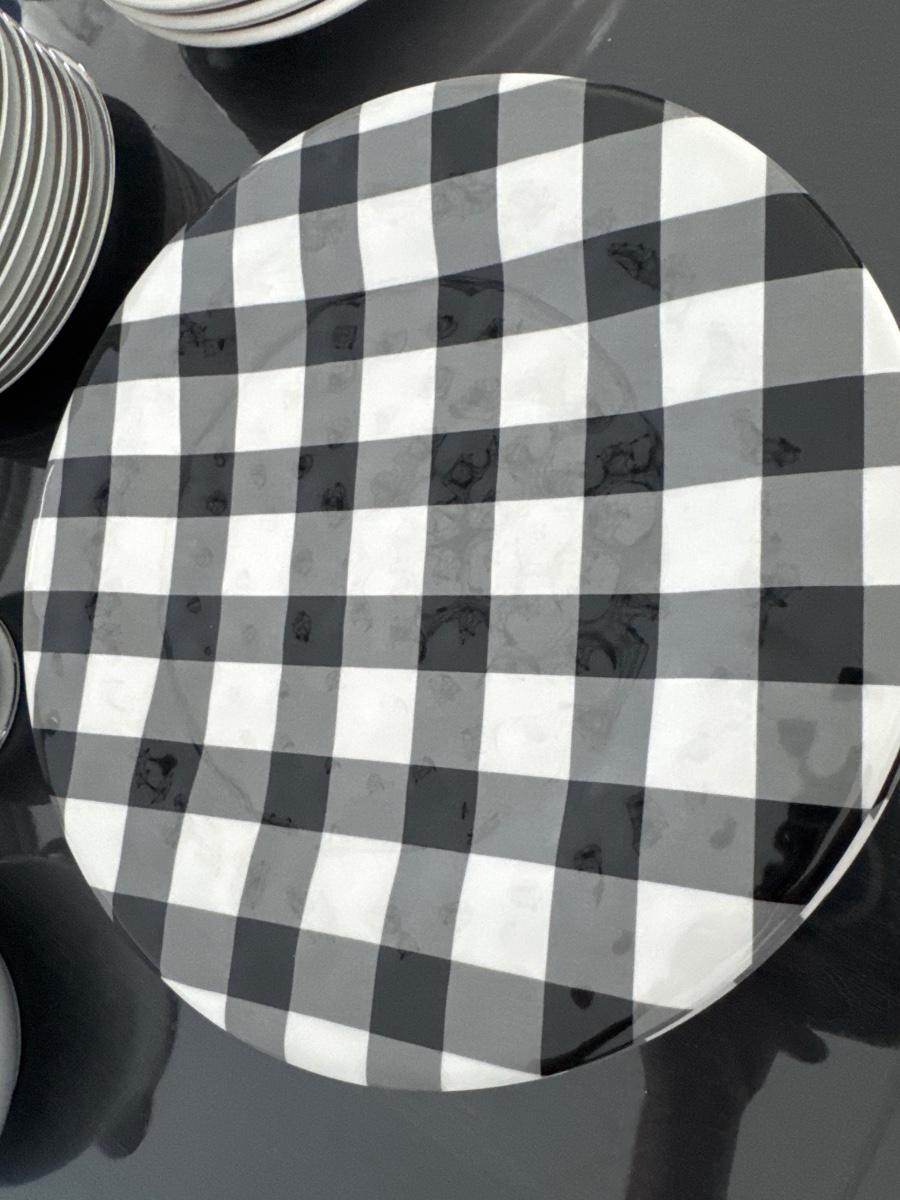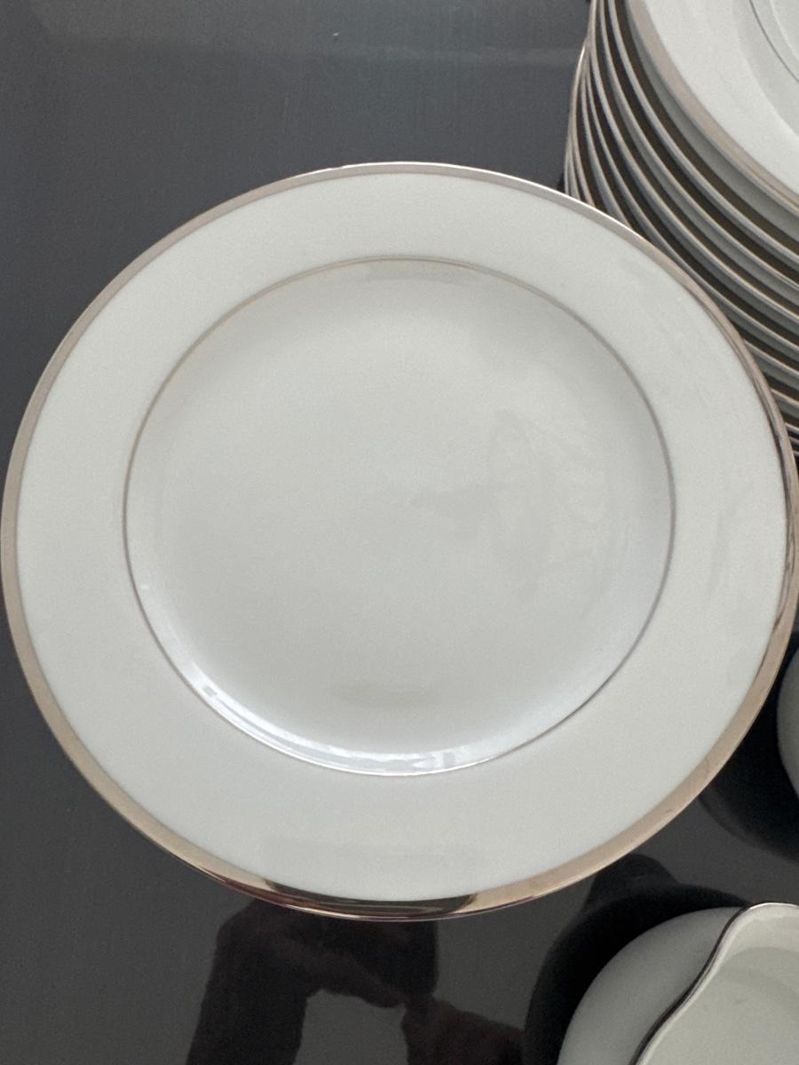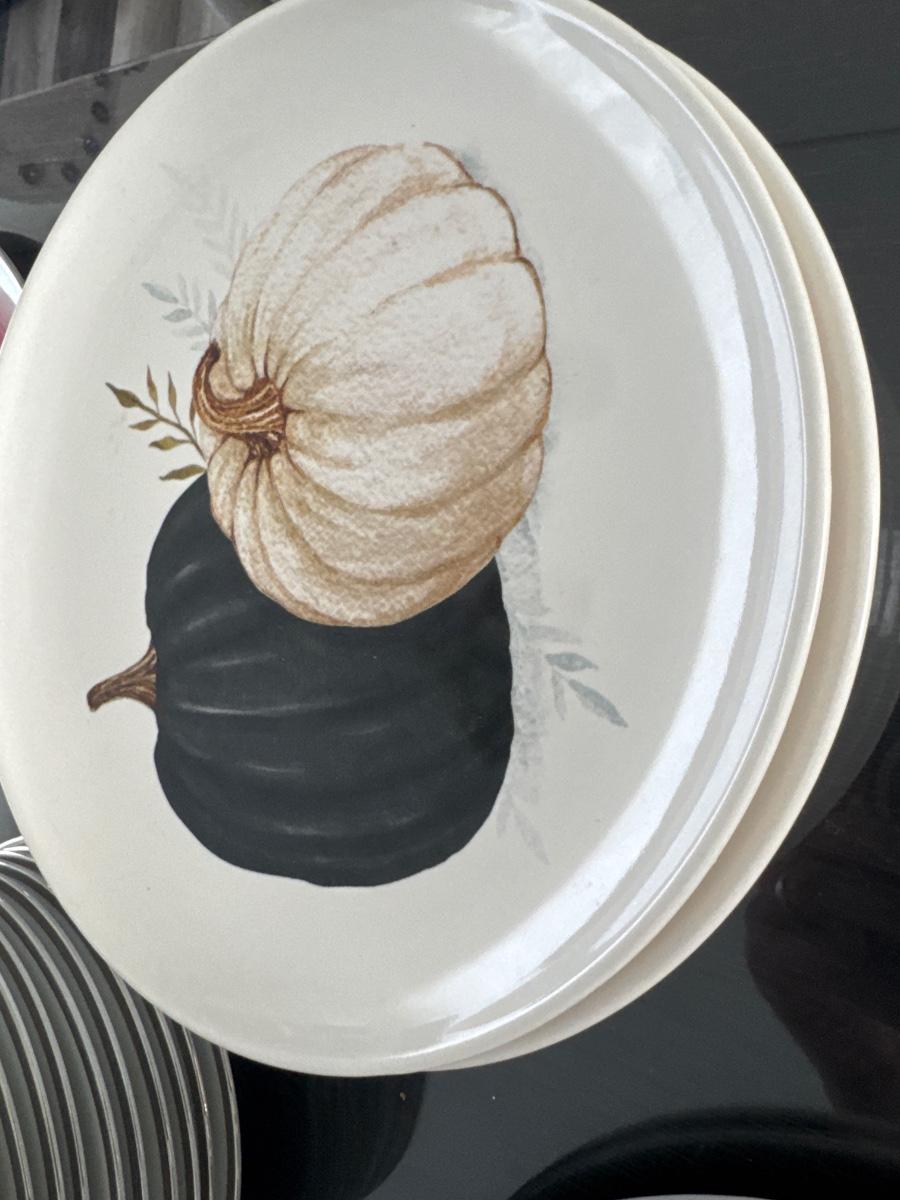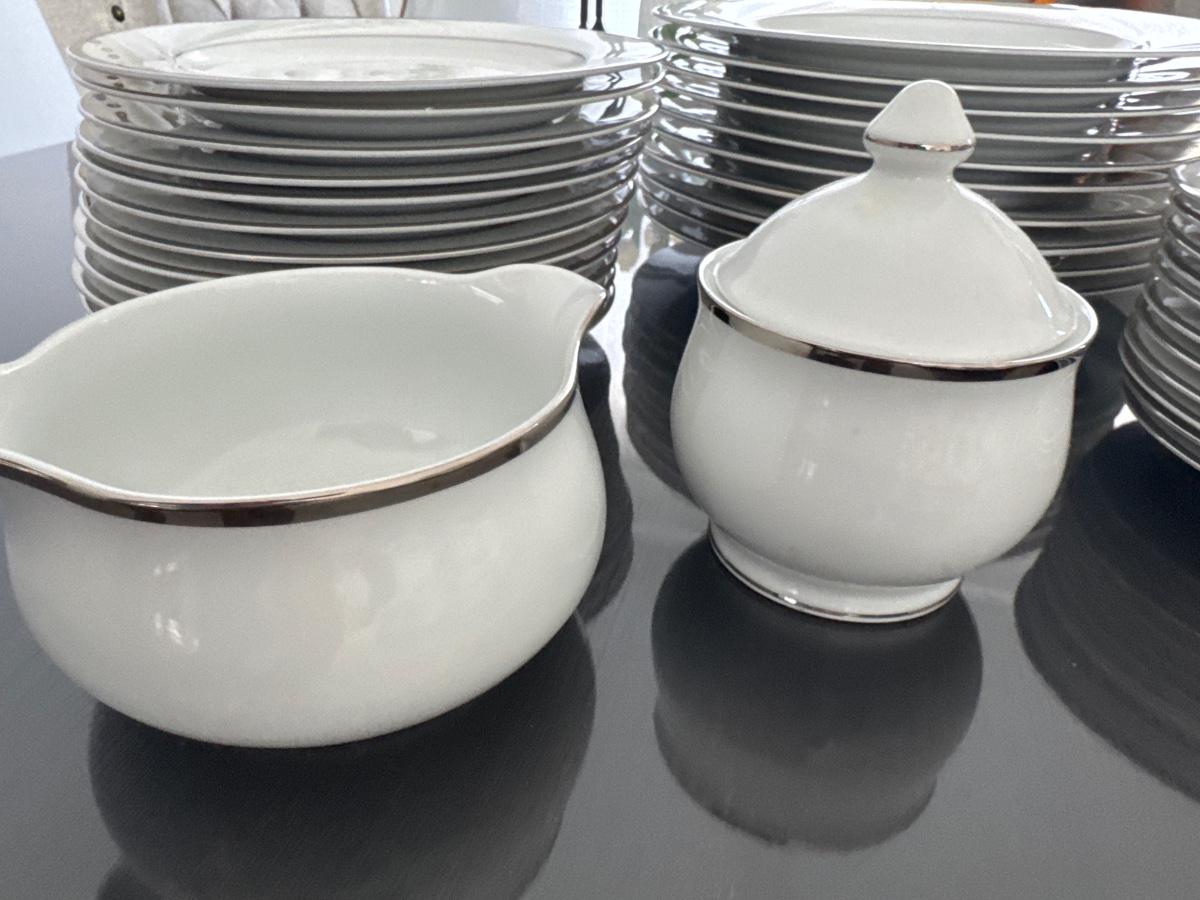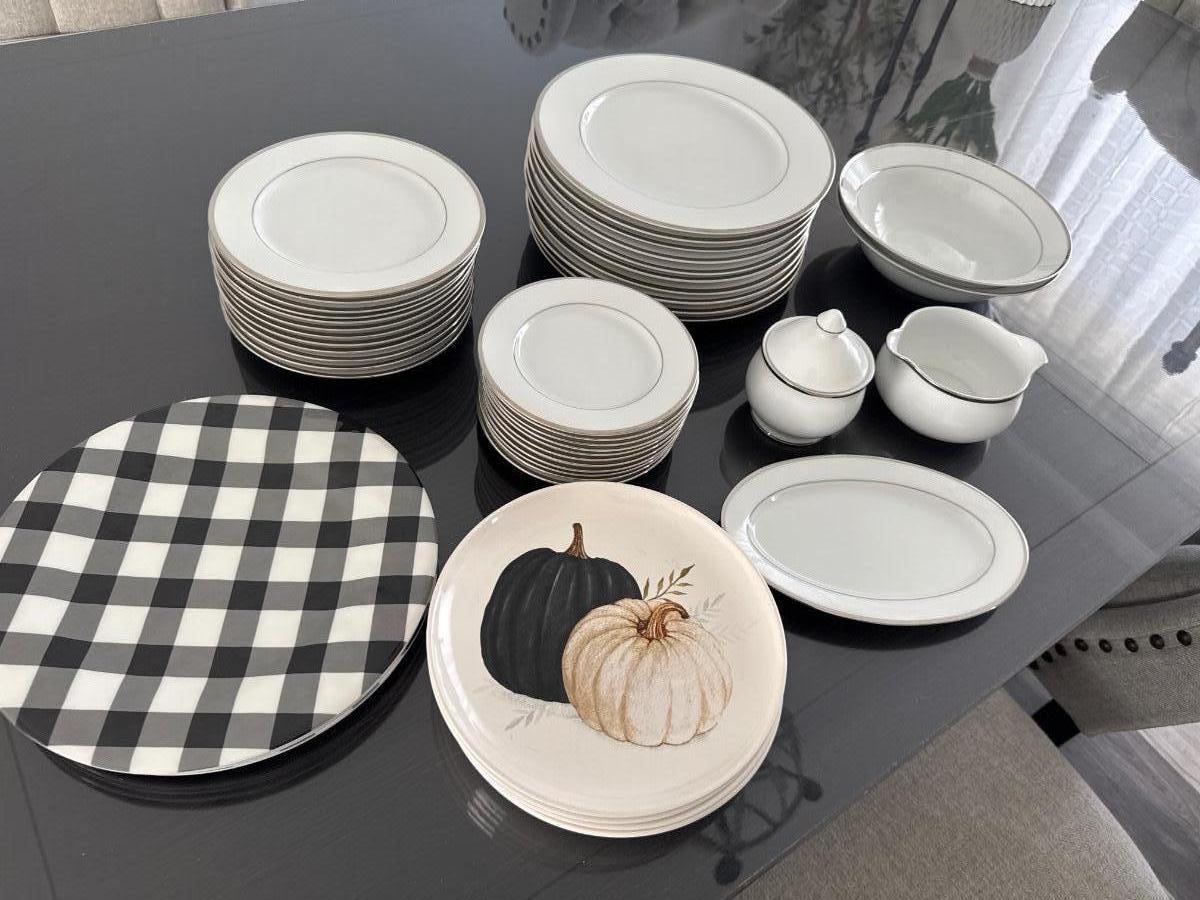 Nikko set- 10 large plates, 12 small plates,11 saucer plates, 2 bowls, 1 cream dish and 1 sugar dish and 1 butter plate. Robert Stanley-4 pumpkin pattern plates and 4 plastic checkered designed plates.
