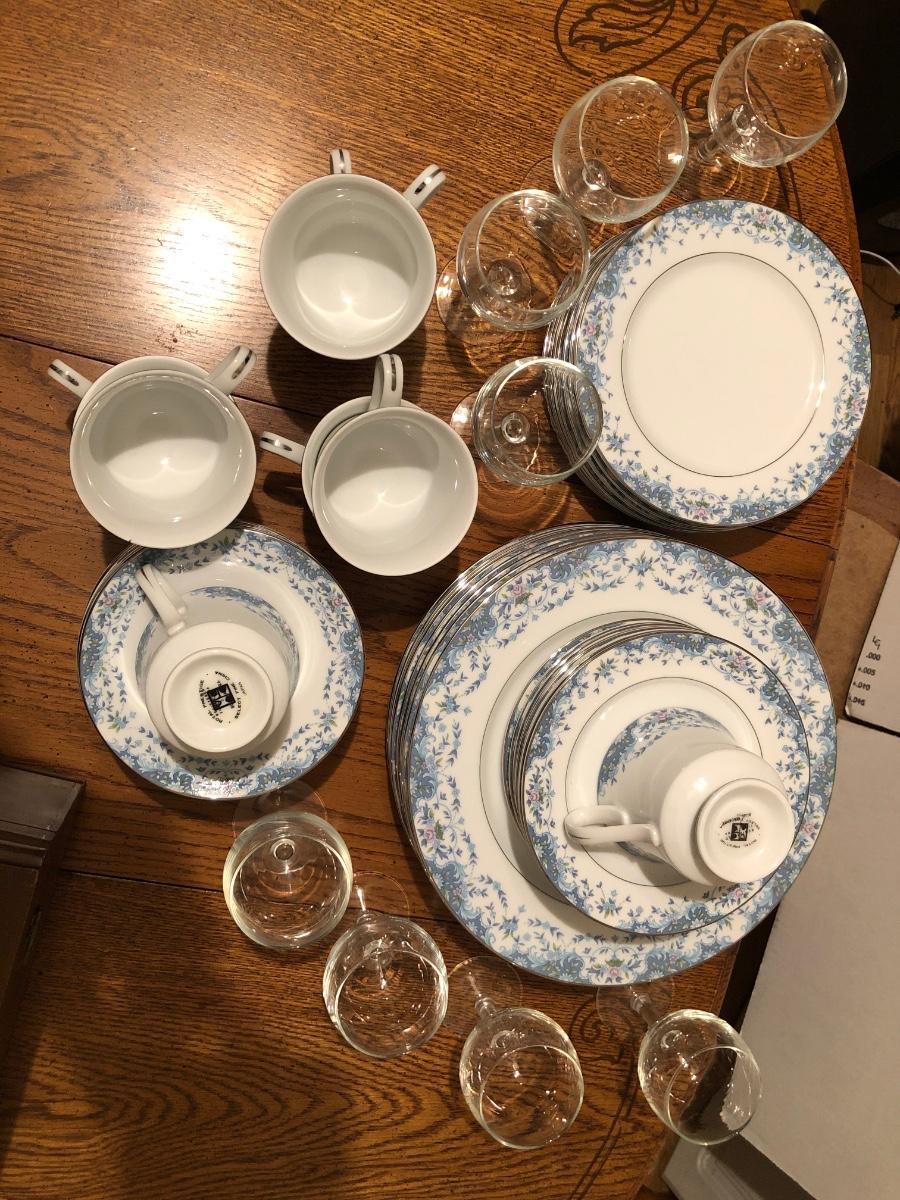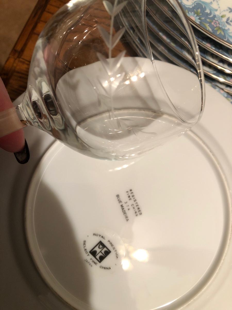The china is royal prestige registered find China blue Madeira. Some cracks. 8 place setting & 8 small wine glasses
