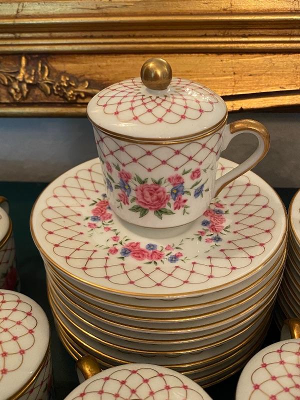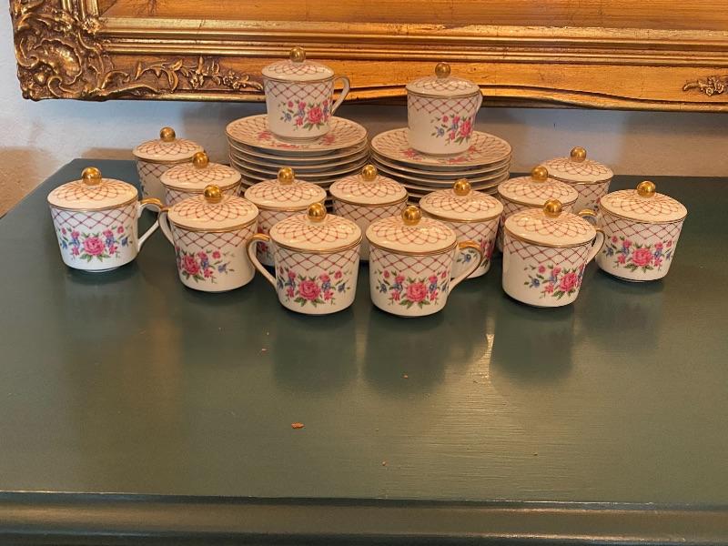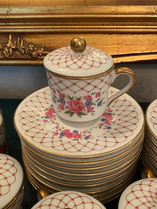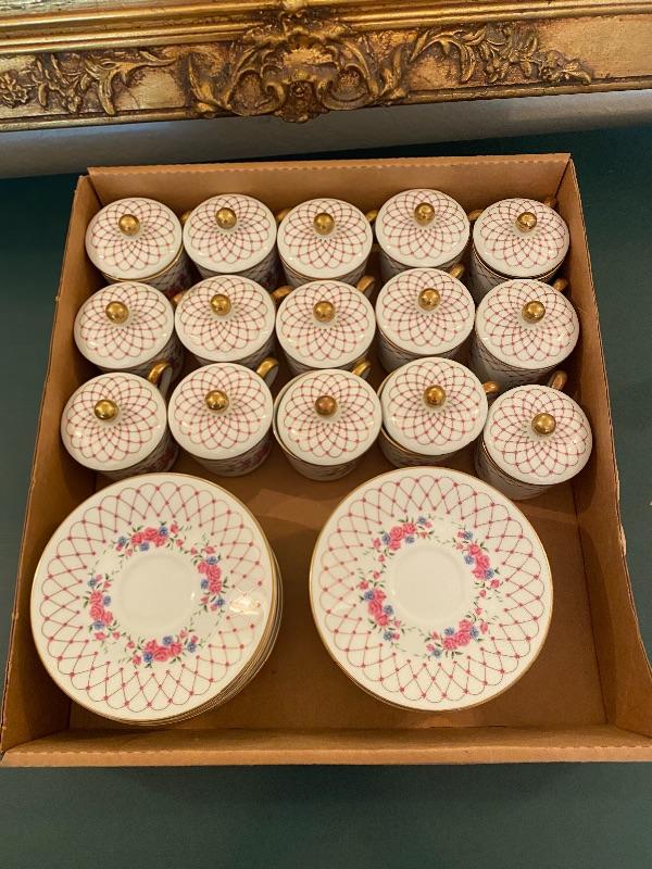 Pink floral demitasse tea or pots de creme set by Royal Cornwall. Part of The Imperial Cup & Saucer Collection 1985 this limited edition pattern is Her Majesty's Private Service. Demitasse cups with lids and saucers. 15 sets. One lid did have a small chip, no other damage noticed to pieces.