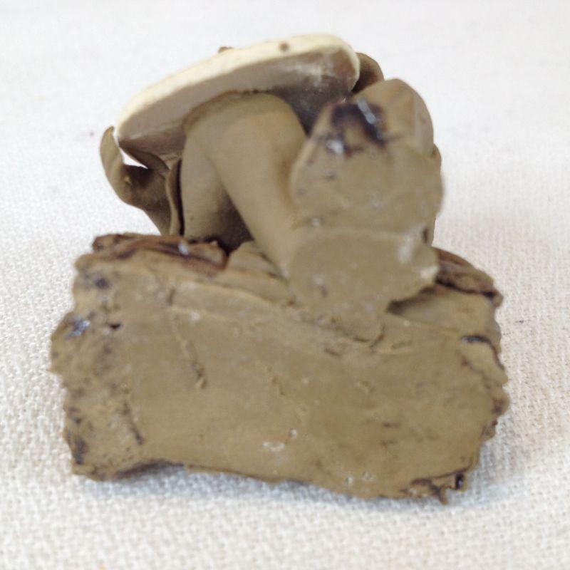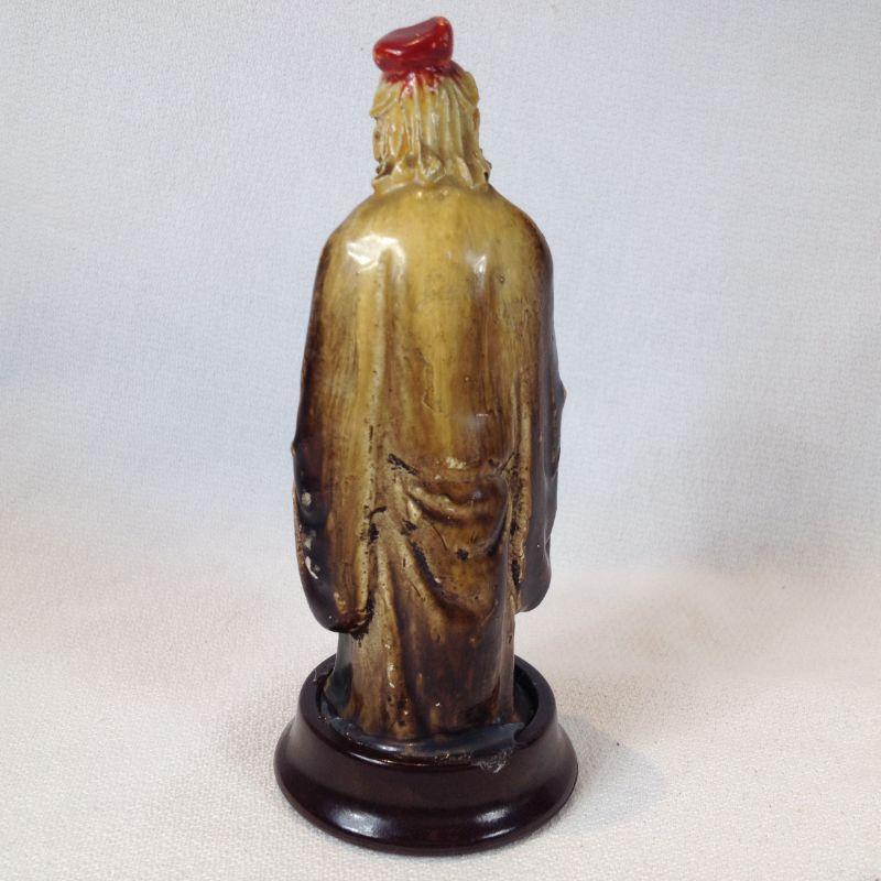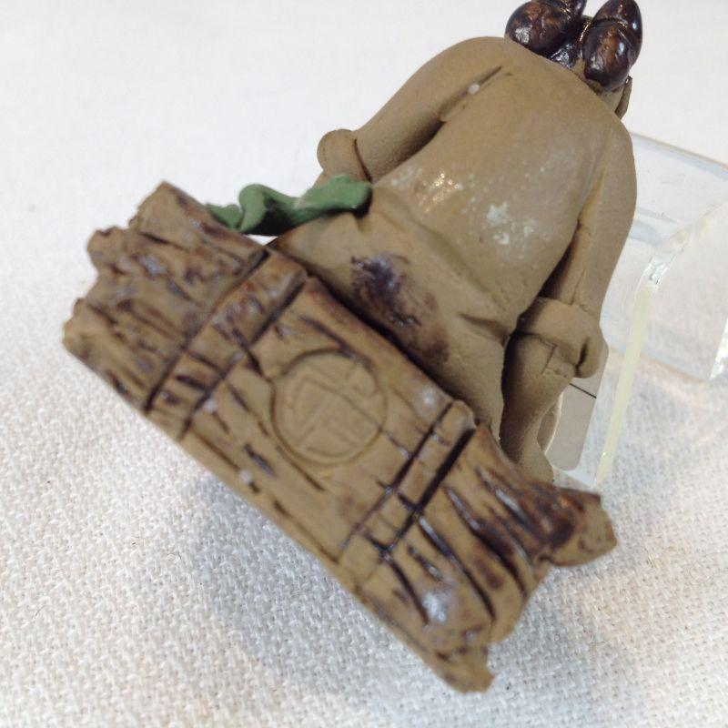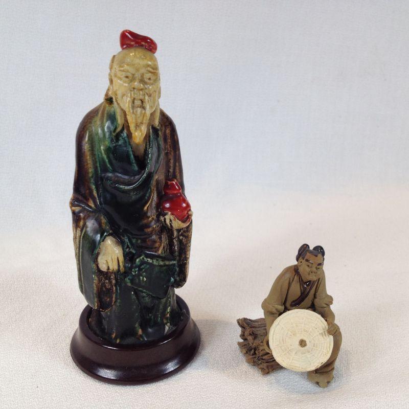 This is a very nice pair. The large figure is a wise old man that stands 4 3/4-inches tall - he looks to be china on a bakelite base. The smaller figure is a handmade miniature mud man. He measures 1 3/4-inches tall and is signed on the back. He would be good to display in a Bonsai Plant. Both are in very good condition.