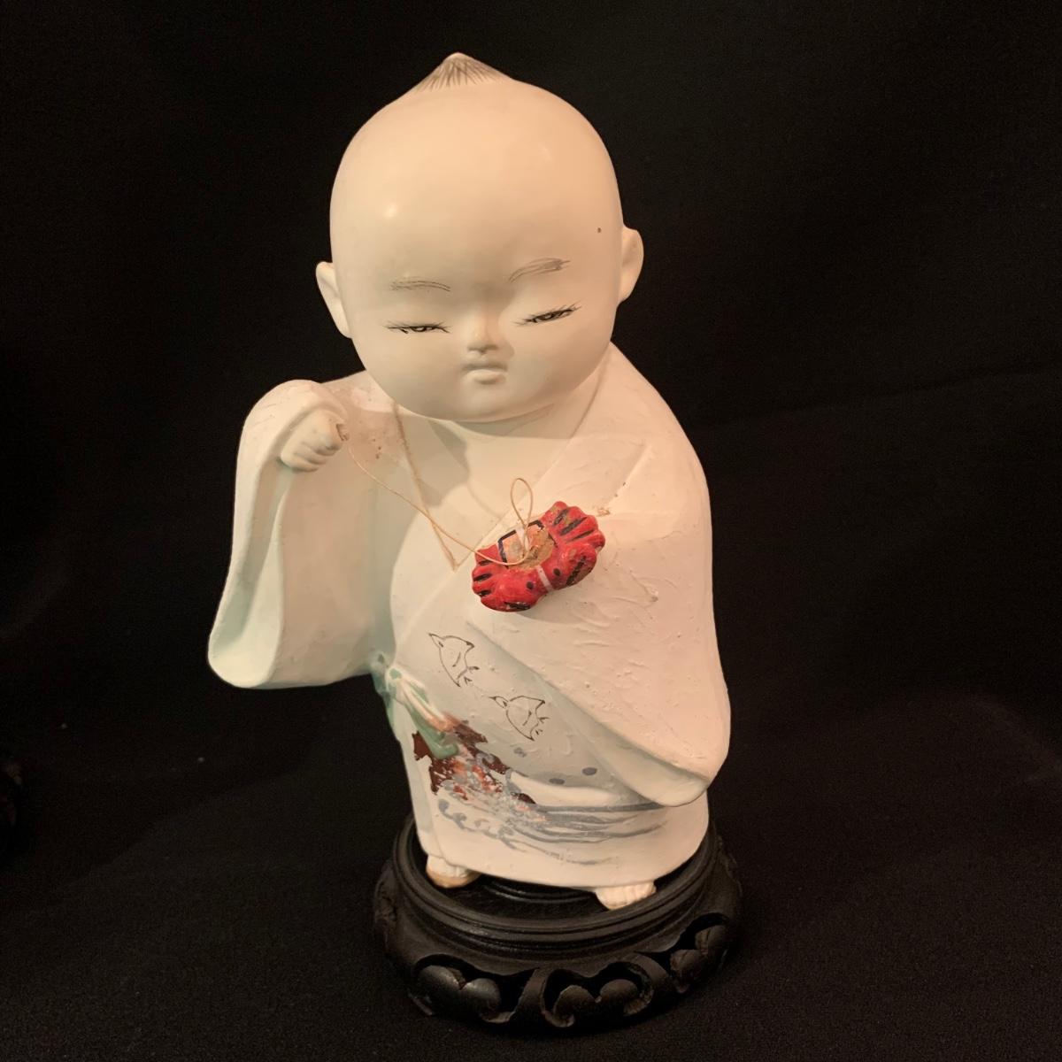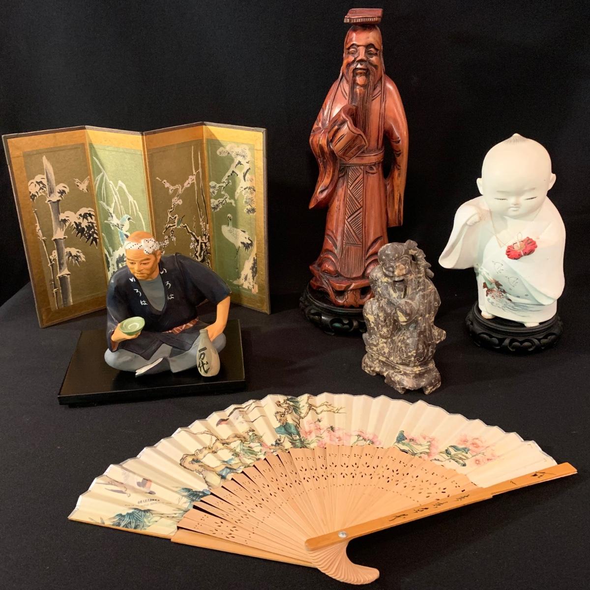 Collectibles from travels abroad. In this lot you’ll find treasures from China and Japan. Lot includes four figurines made of wood, stone and porcelain. Lot also includes a fan and miniature decorative screen. Largest item is red wood man and it measures, 4” x 3.5” x 12”H. Please note that stone figurine comes apart into two pieces, please see photo for more details. Shipping available.
