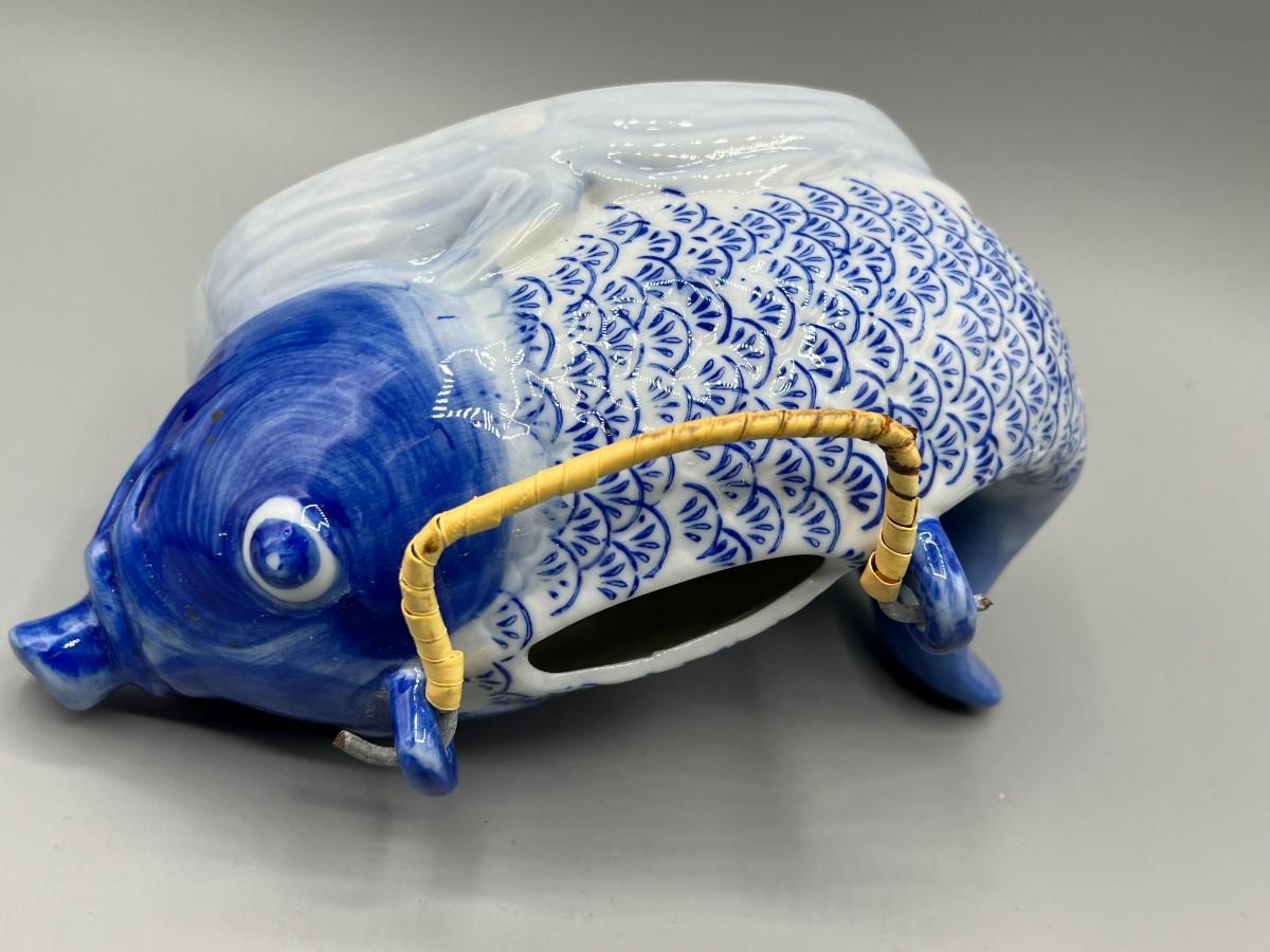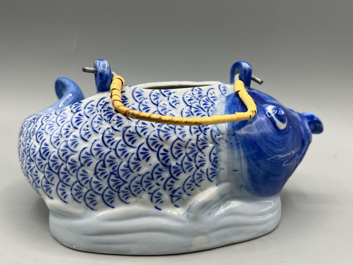 Vintage hand painted Chinese blue & white koi fish teapot. Nicely decorated. Wrapped cane handle. Does not have a lid, not sure if it originally had one or not. In good condition. About 6" size.