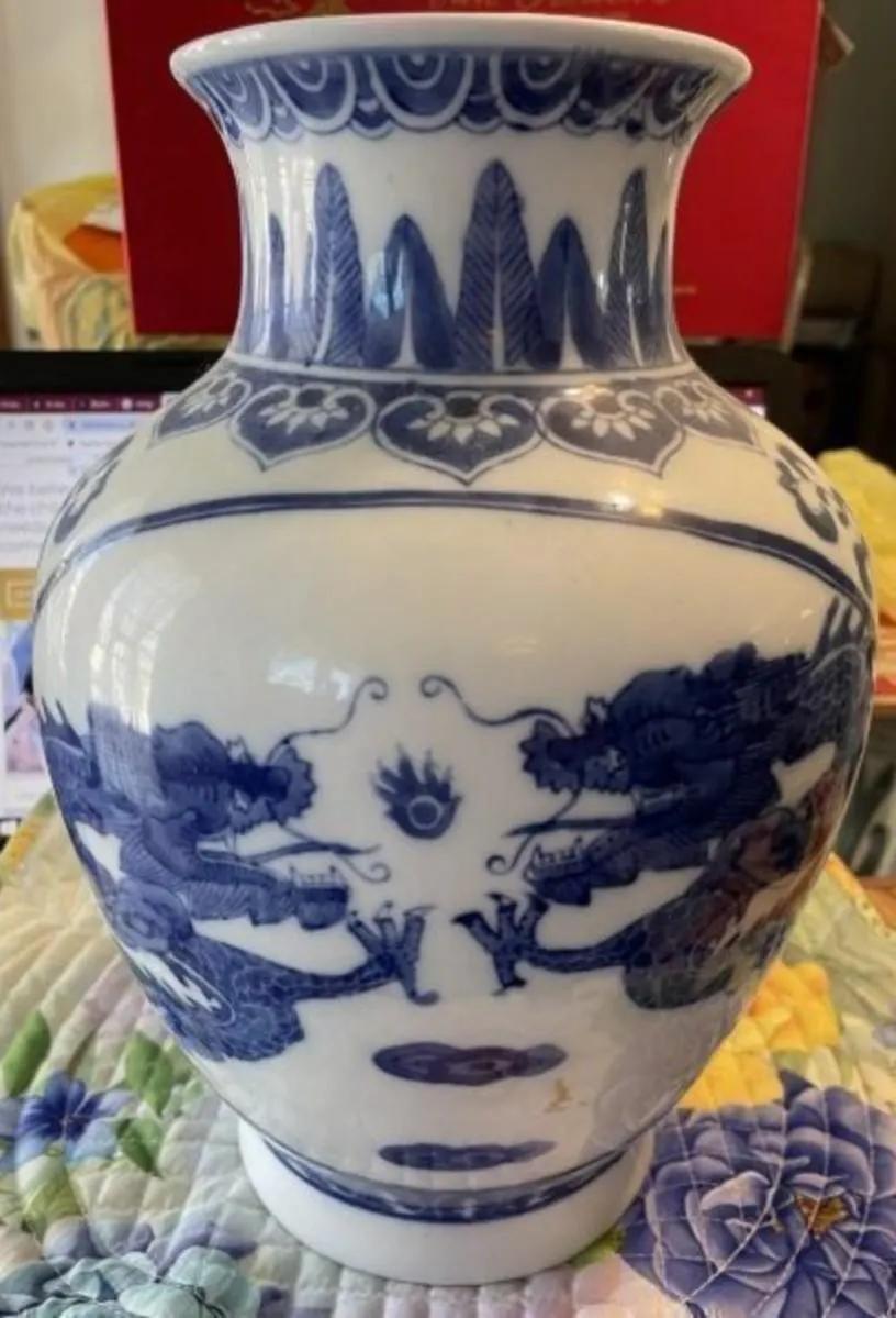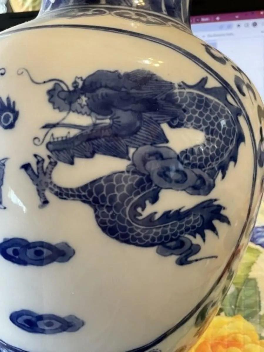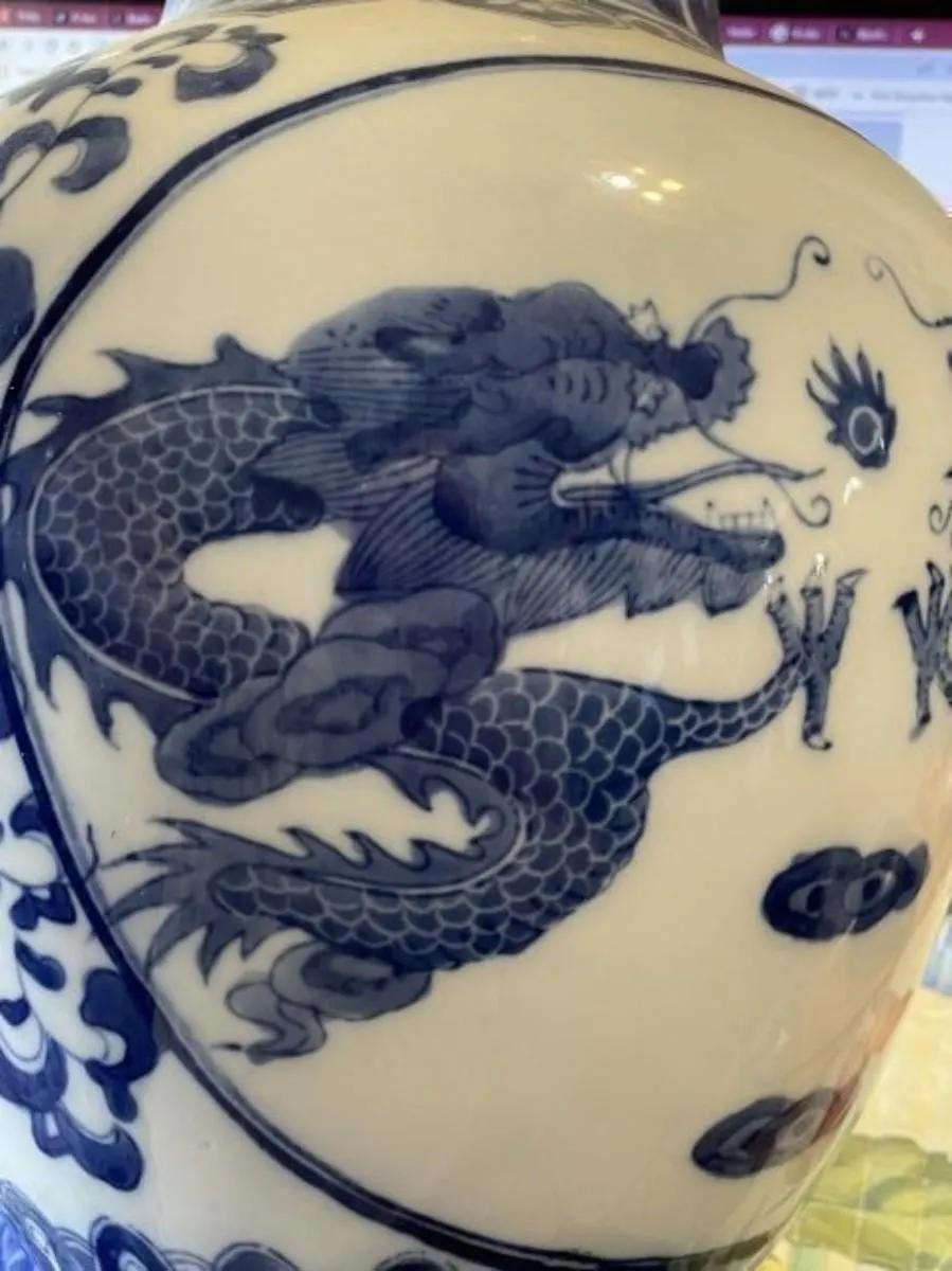 Chinese Blue & White Dragon Jar/Vase Heavy Porcelain Body Boldly Painted in Cobalt Blue w/4 Four-Clawed 12-1/2" Tall Preowned. $20 DOMESTIC SHIPPING.
