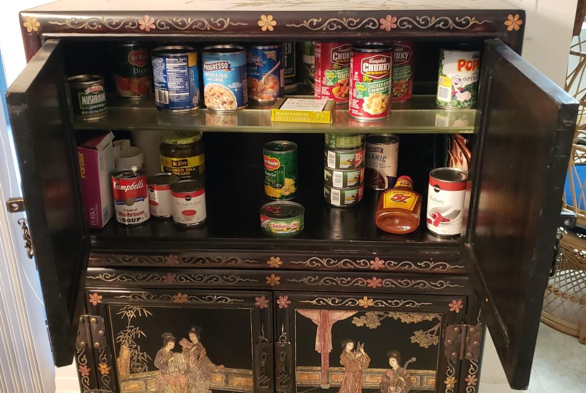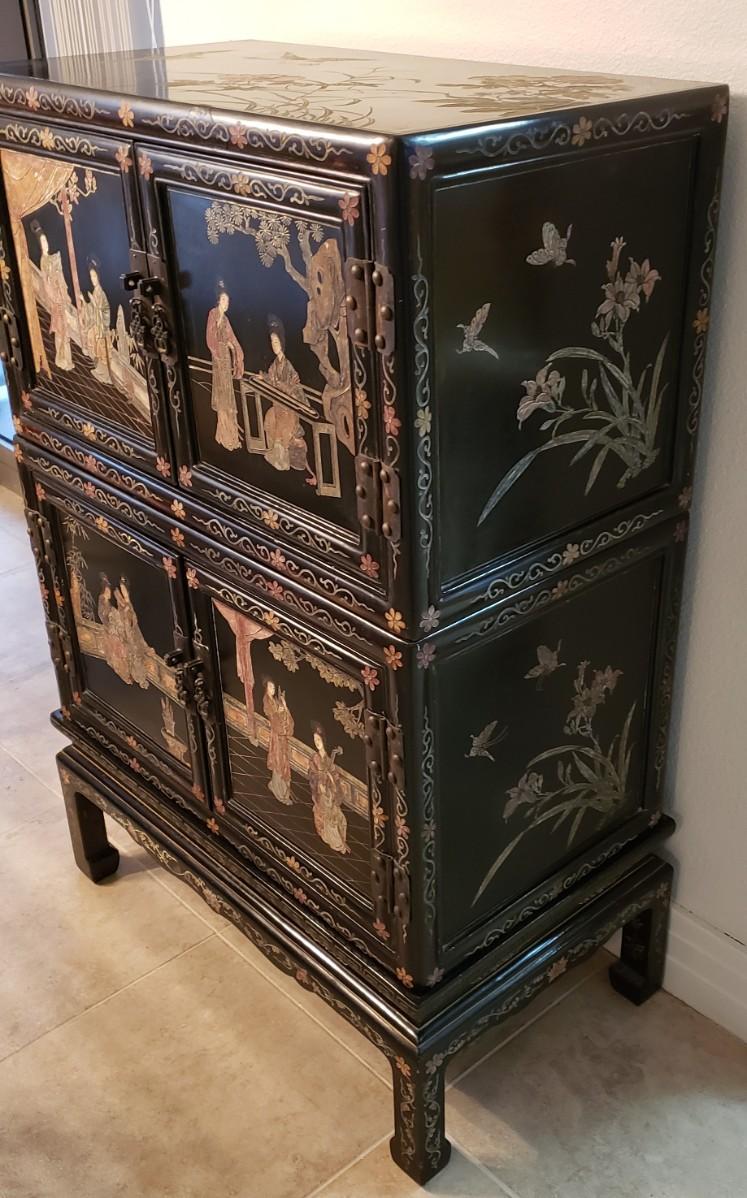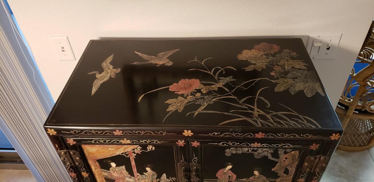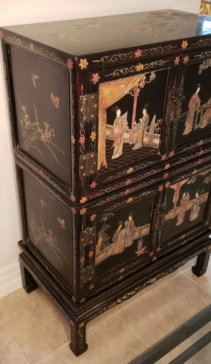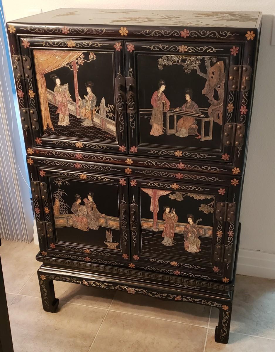 Chinese Cabinet with Inlaid Hardstones and Hand Painted Decors