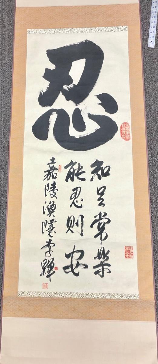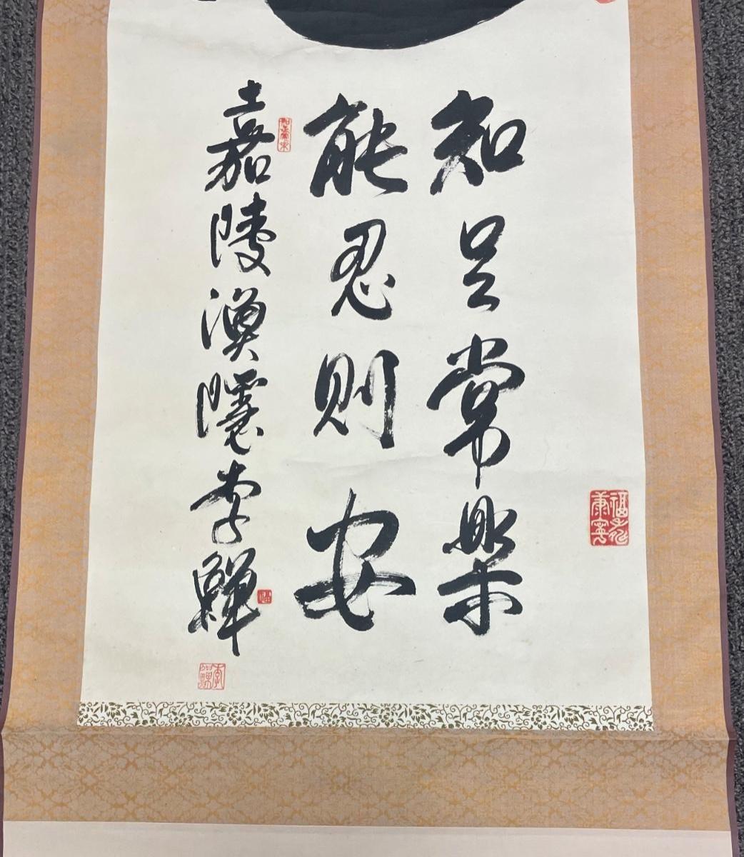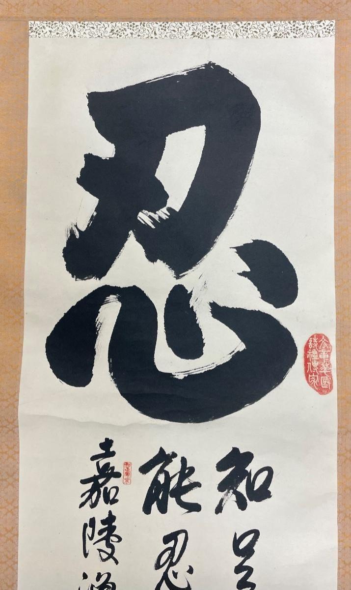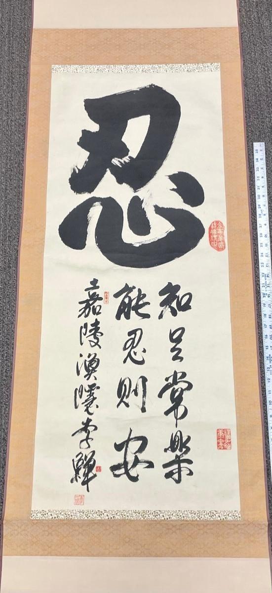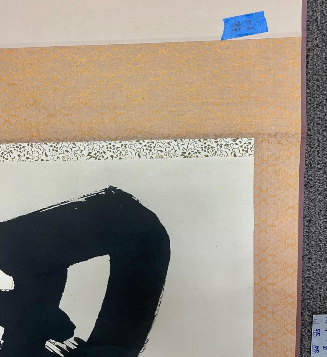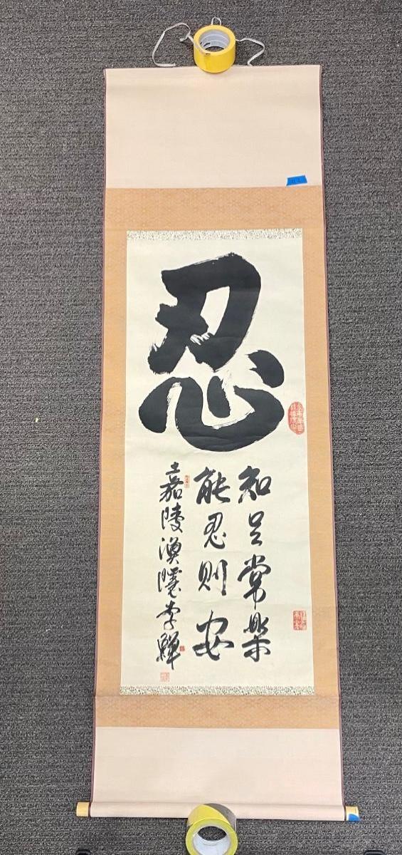 Hand-lettered calligraphy of Chinese characters on. Long fabric scroll. Red block stamps in multiple locations, see images. Image size 52” x 22”, overall scroll is 72”. Item #2.