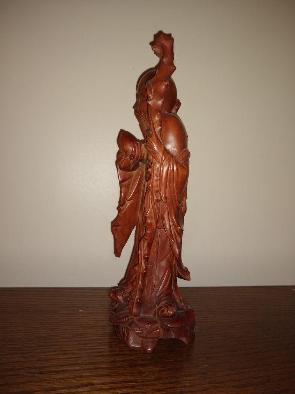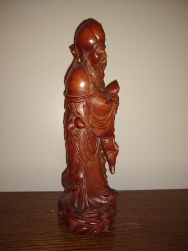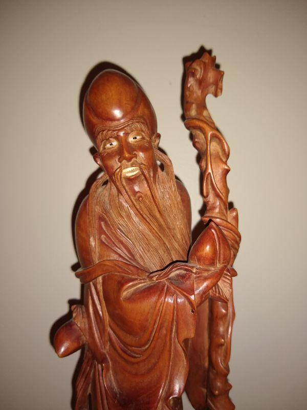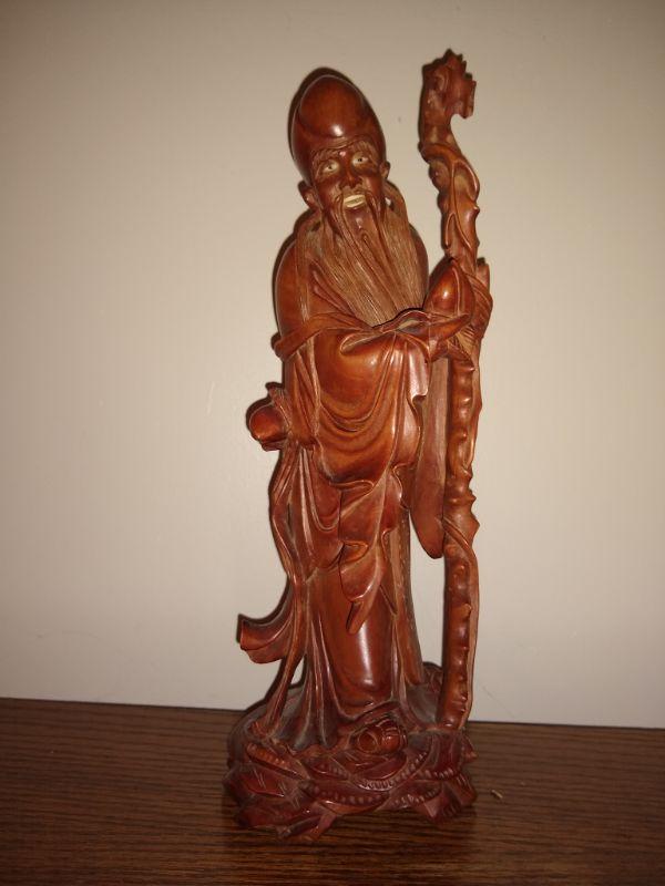 Antique Chinese wood carving of old man with a staff. This may be the god of deity. 11 in tall no chips no cracks
