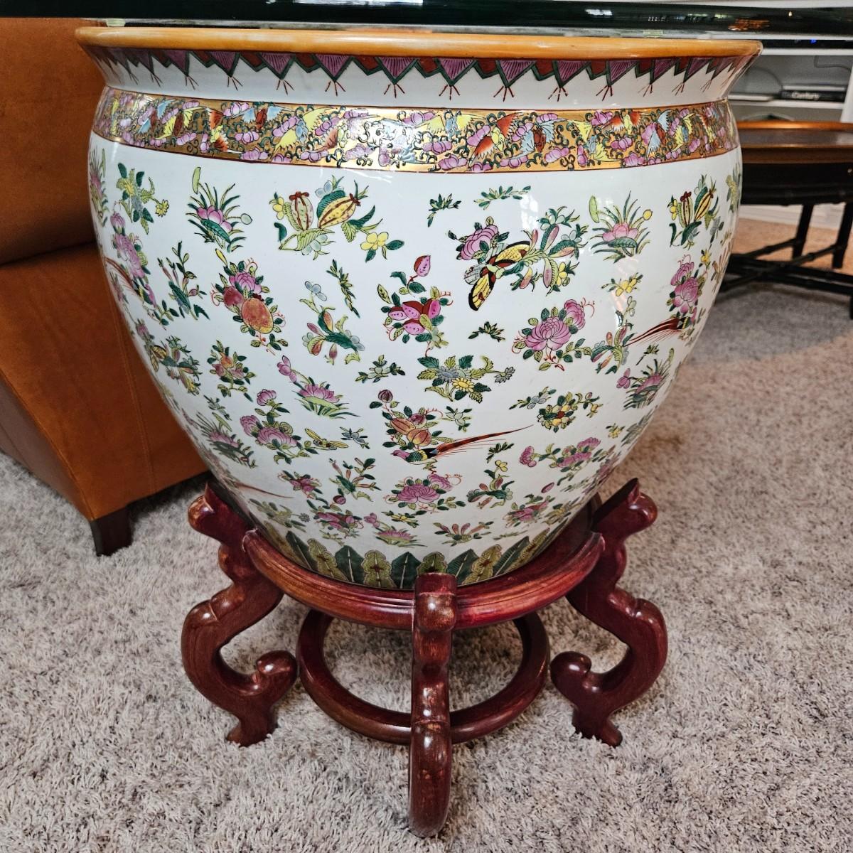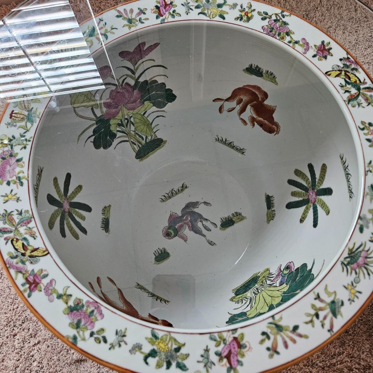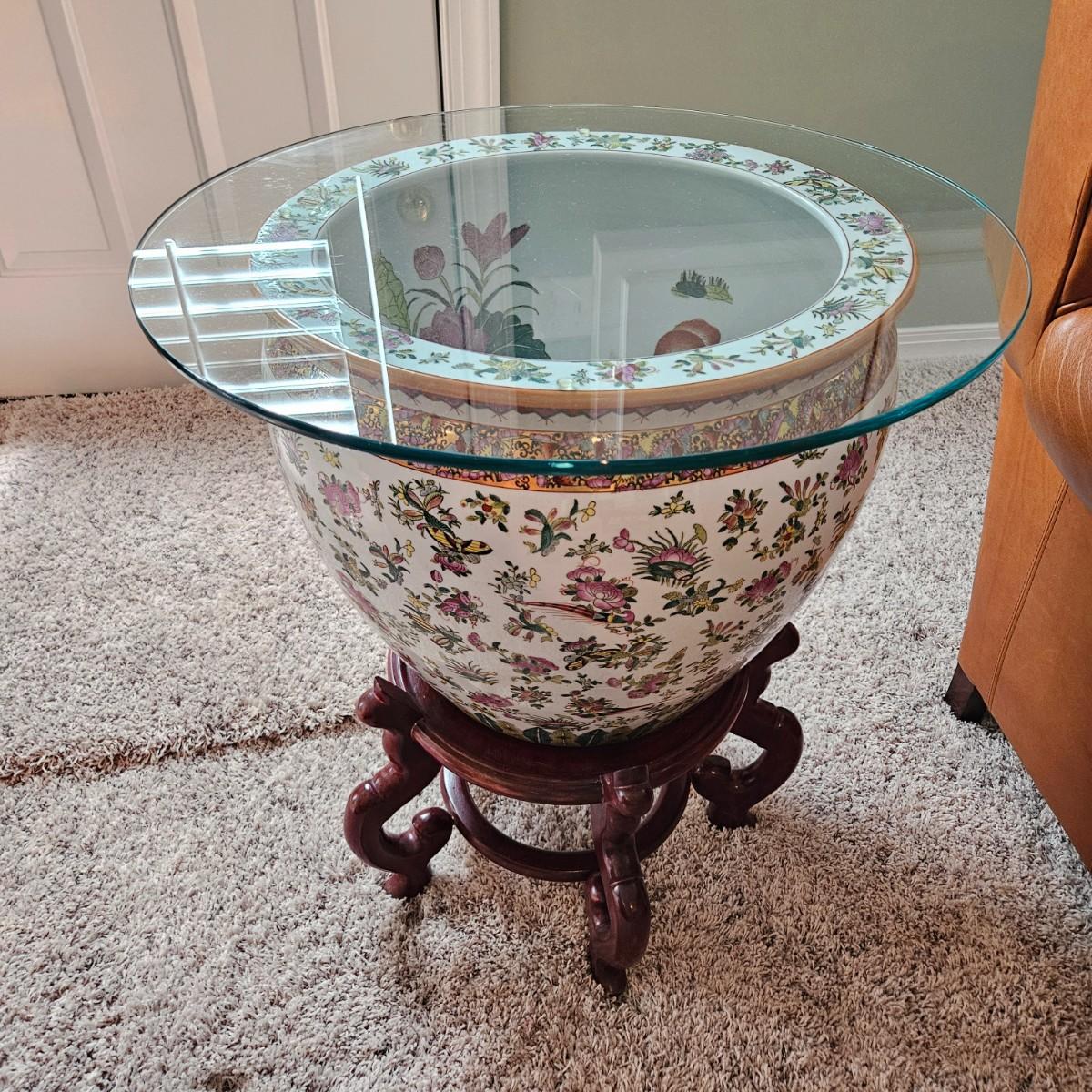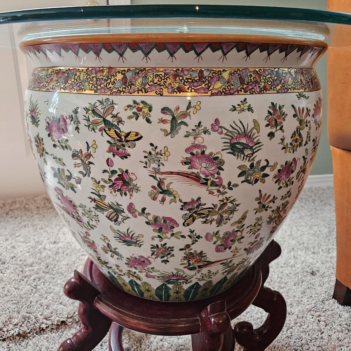 A Chinese ceramic fish bowl side table that has a wooden base and tempered glass top. It has a design of peacocks and flowers with some gold leaf. It measures approximately 24"D x 27"H. Local pickup only