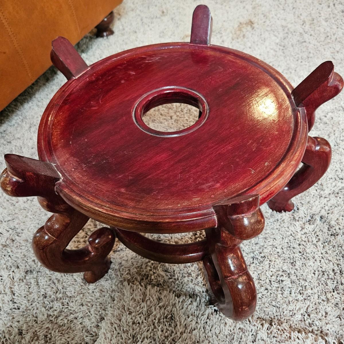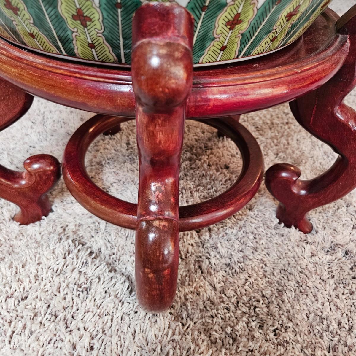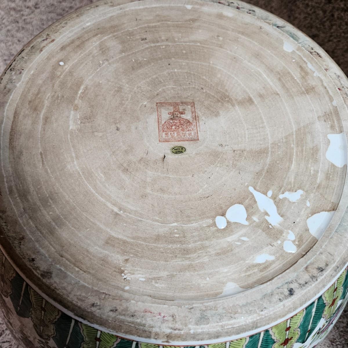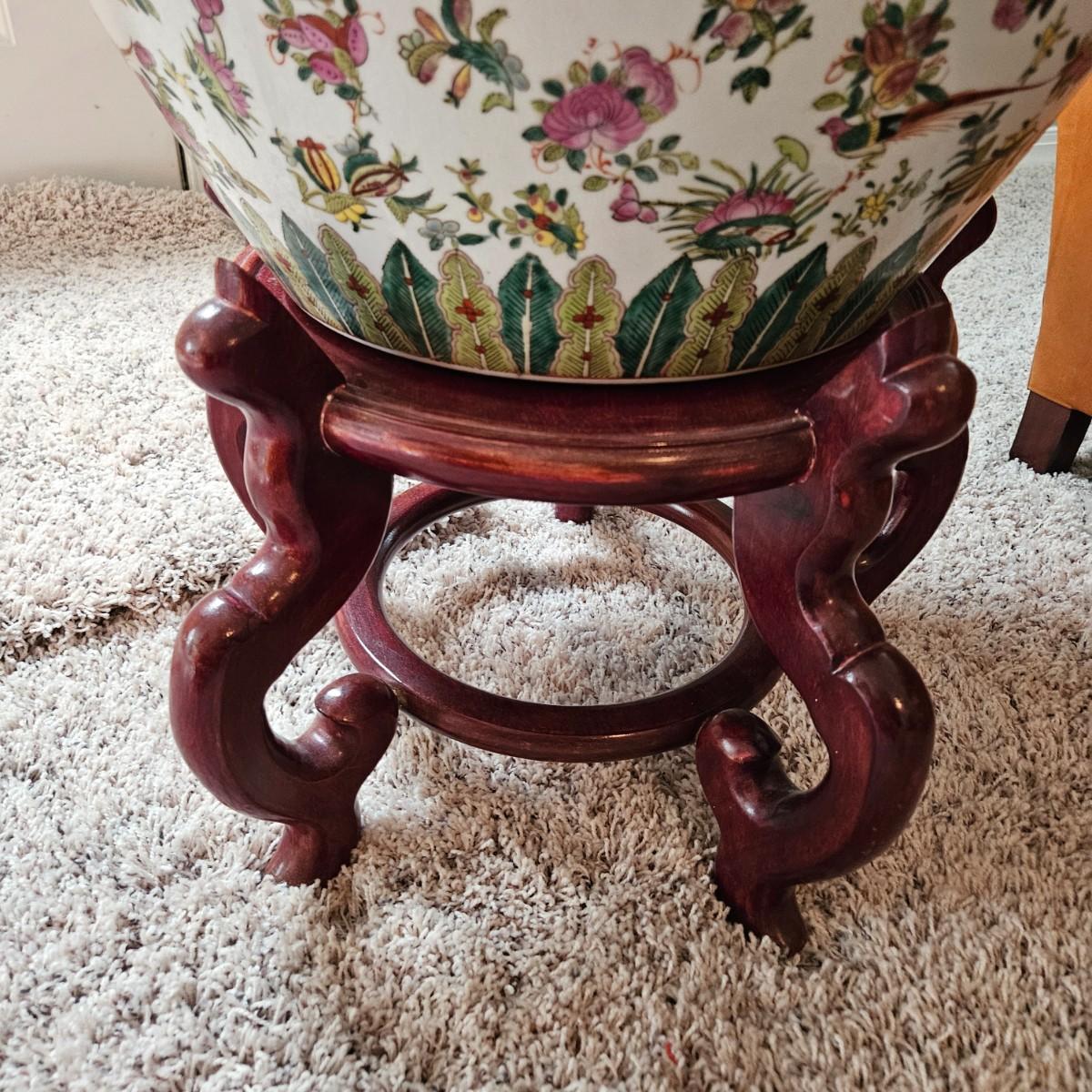 A Chinese ceramic fish bowl side table that has a wooden base and tempered glass top. It has a design of peacocks and flowers with some gold leaf. It measures approximately 24"D x 27"H. Local pickup only