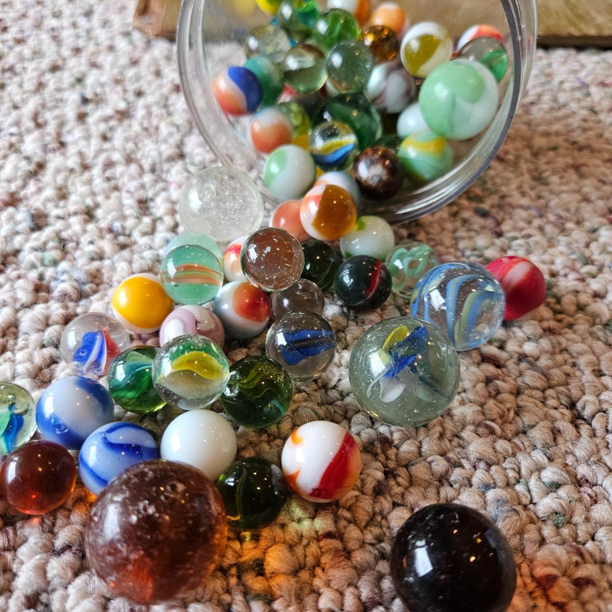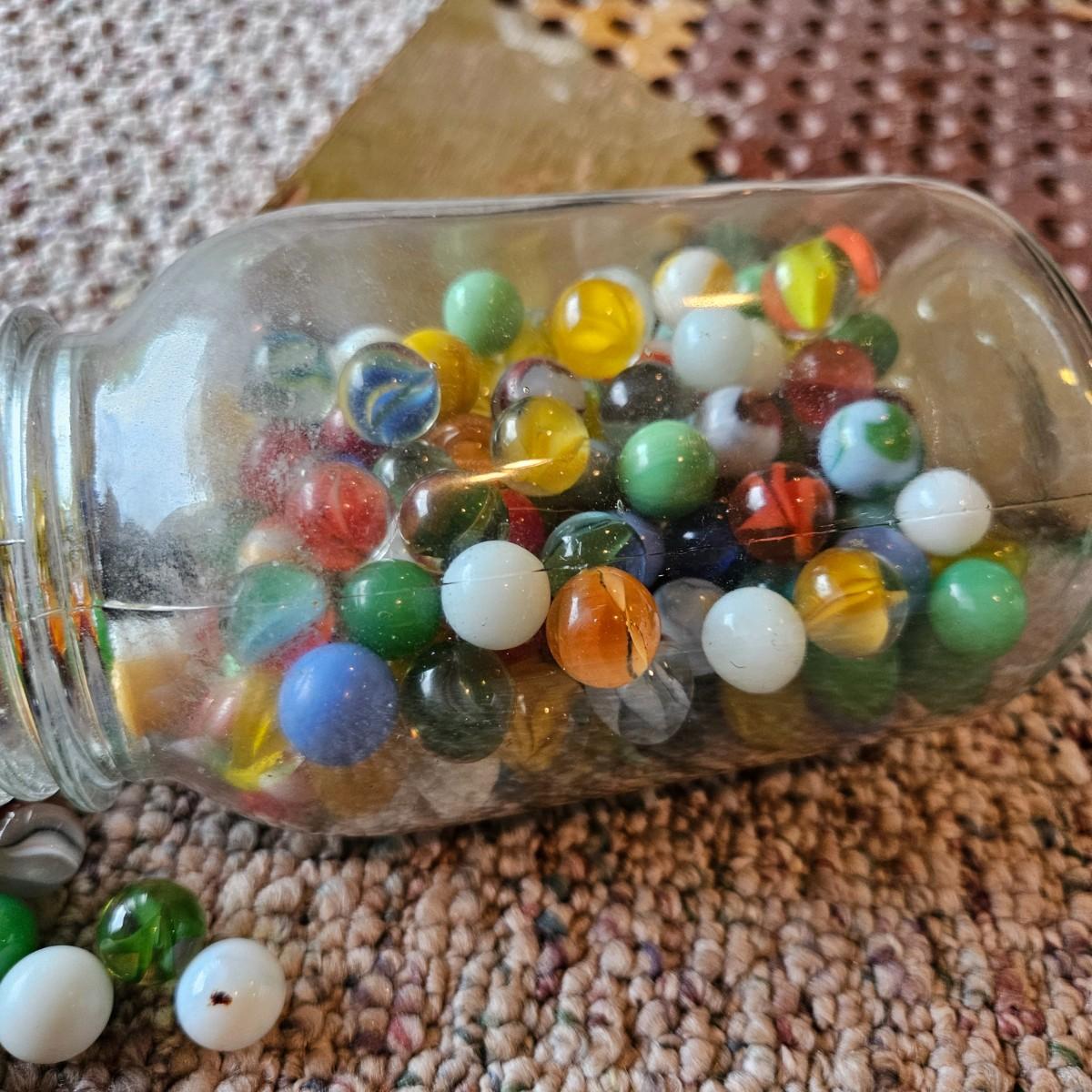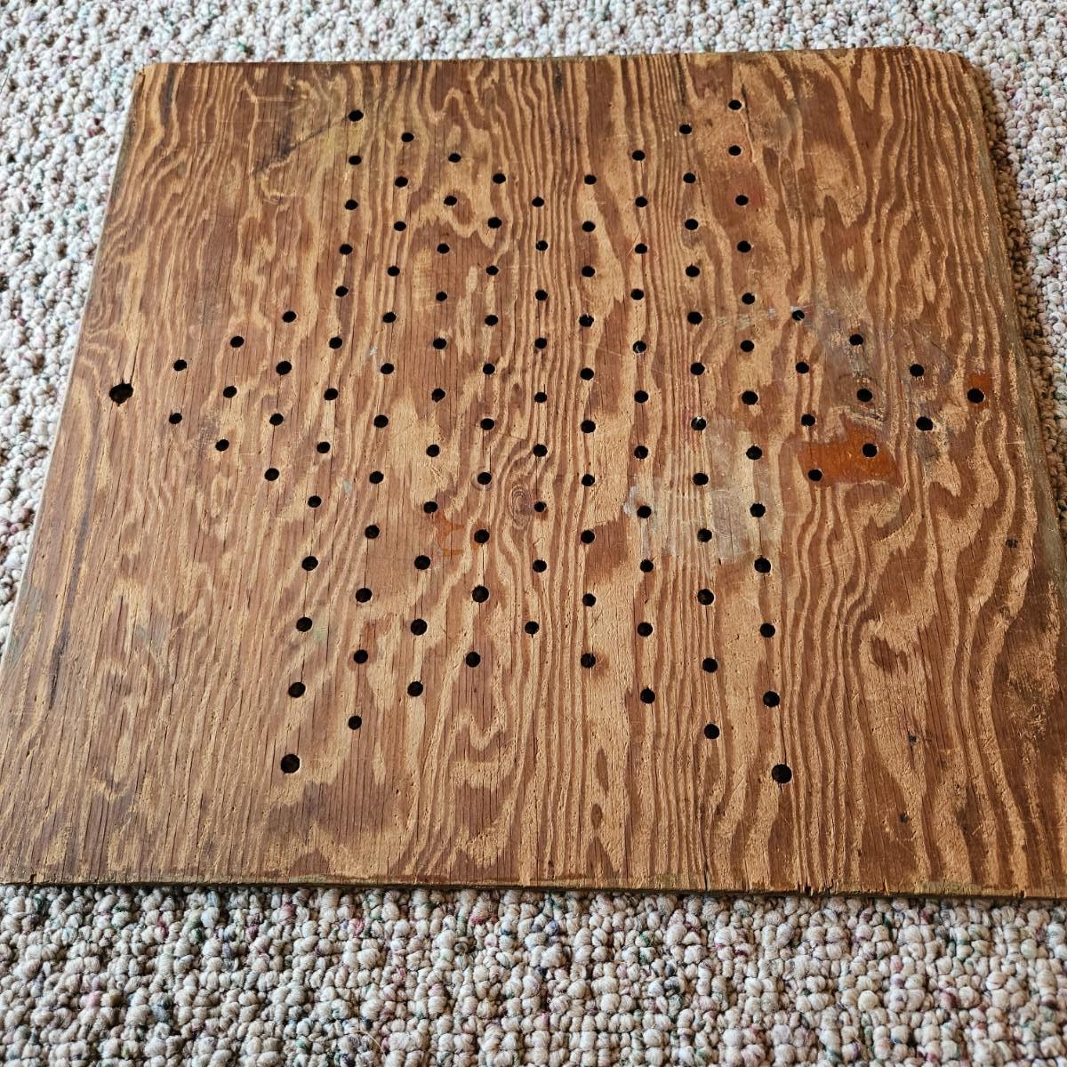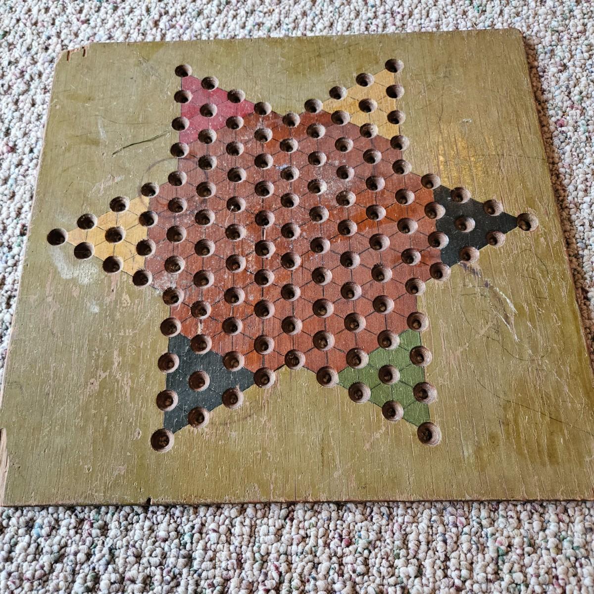A Chinese checkers board that appears to be made of plywood and has some damage from age along the outer edges and measures approximately 15.75" x 15". Also includes three jars of marbles, some of which are vintage. Shipping available