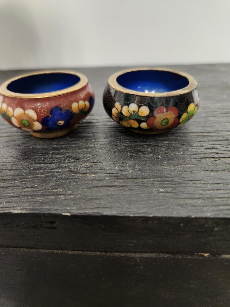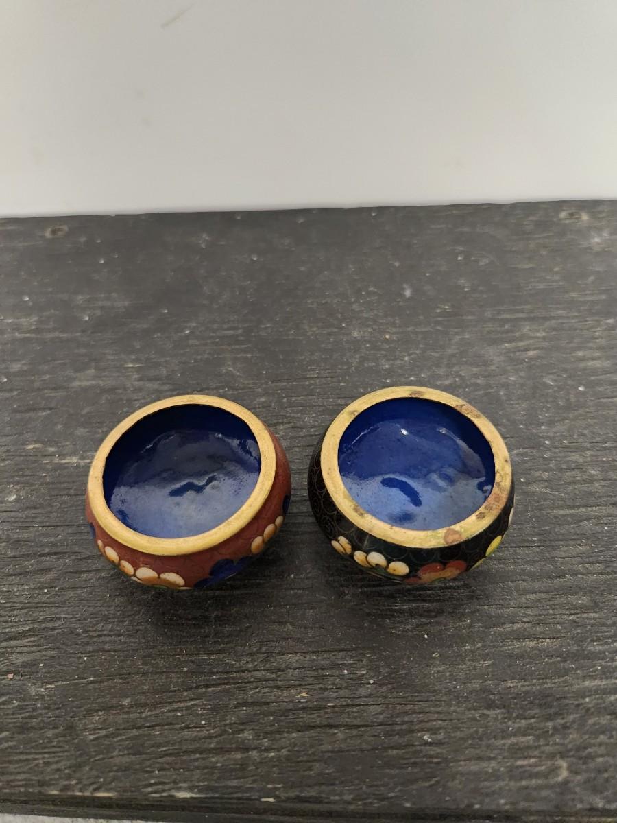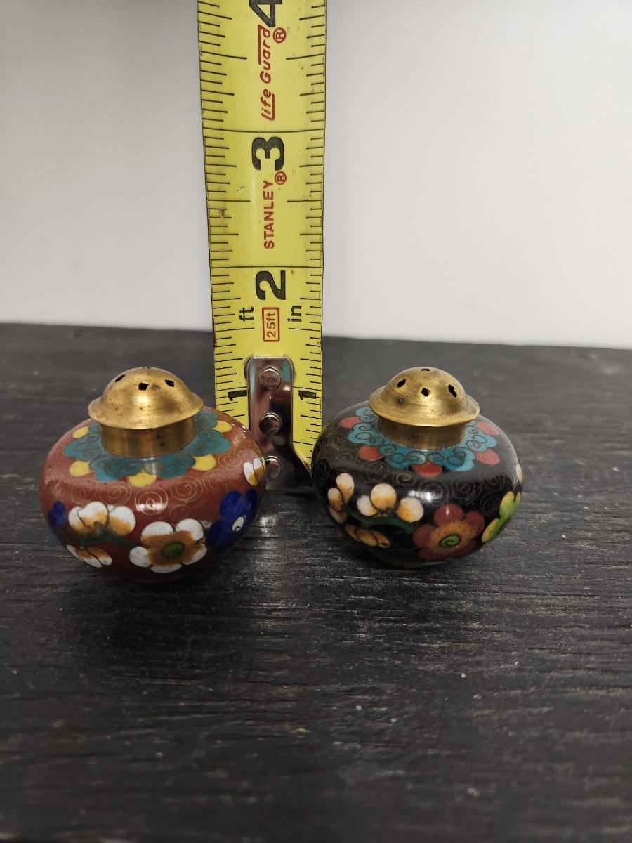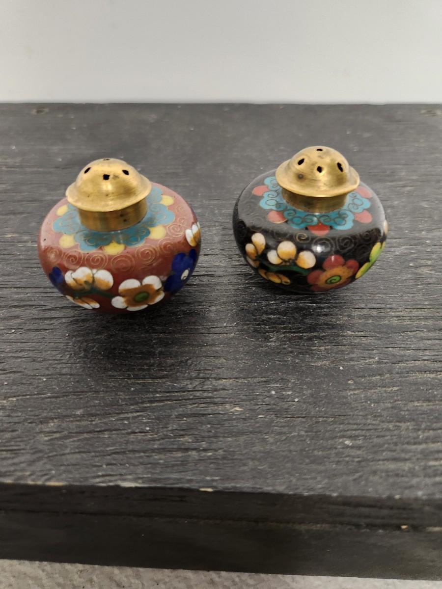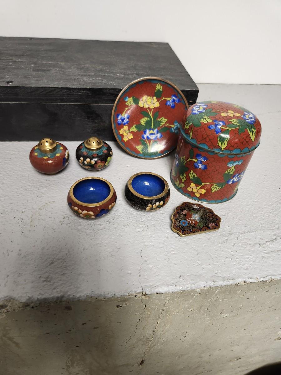 Chinese cloisonne lot includes salt cellars AND salt and pepper shakers. The small piece is a scarf clip.