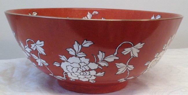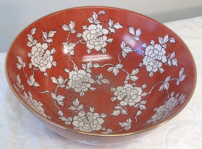 Description: Vintage Chinese dish bowl floral orange color with a gilt embossed rim. Measurement approximate: 6 x 10. Material: Porcelain. Shipping cost: $20 excluding Hawaii, Alaska and California